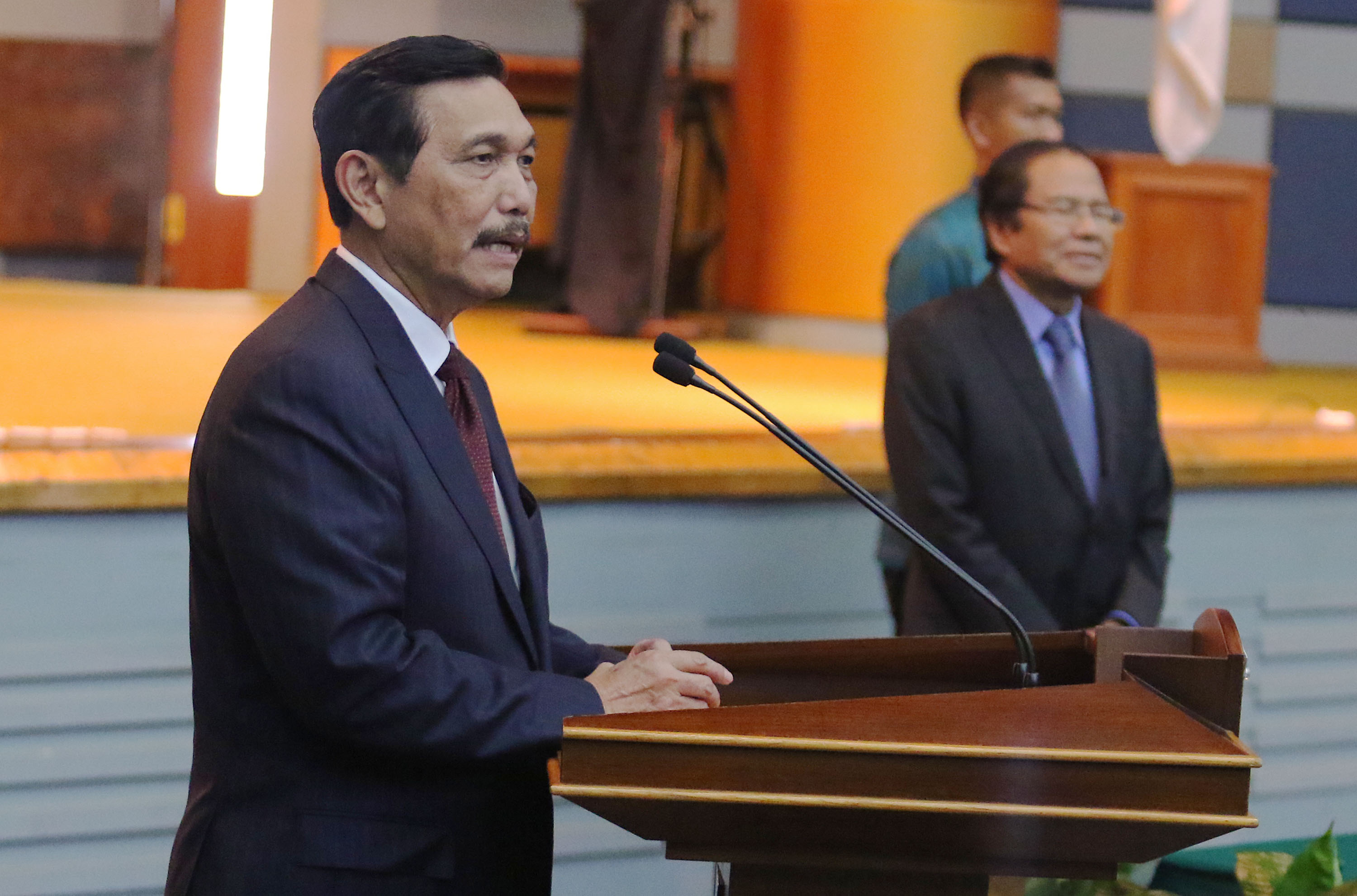 Menko Bidang Kemaritiman Luhut B. Pandjaitan (kiri) memberikan sambutan disaksikan Rizal Ramli ketika mengikuti serah terima jabatan (sertijab) Menko Bidang Kemaritiman di Gedung BPPT, Jakarta, Kamis (28/7). Luhut B. Pandjaitan yang sebelumnya menjabat Menko Polhukam dirotasi menjadi Menko Bidang Kemaritiman menggantikan Rizal Ramli dalam kabinet kerja.