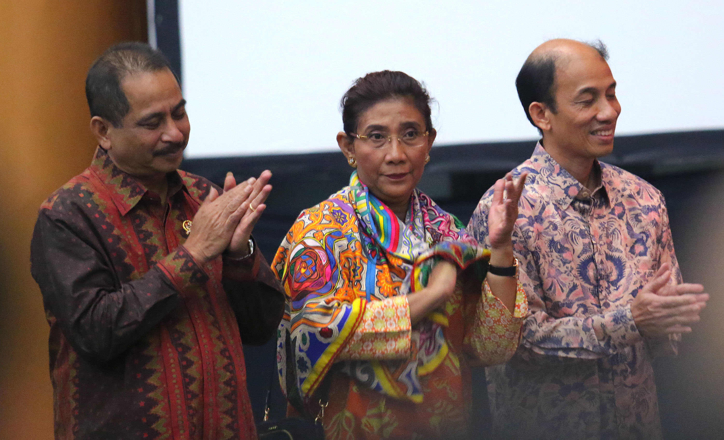 Menteri Kelautan dan Perikanan, Susi Pudjiastuti didampingi Menteri Pariwisata Arief Yahya dan Menteri ESDM Archandra Tahar saat mengikuti sertijab Menteri Koordinotor Maritim di Jakarta, Kamis (27/7).