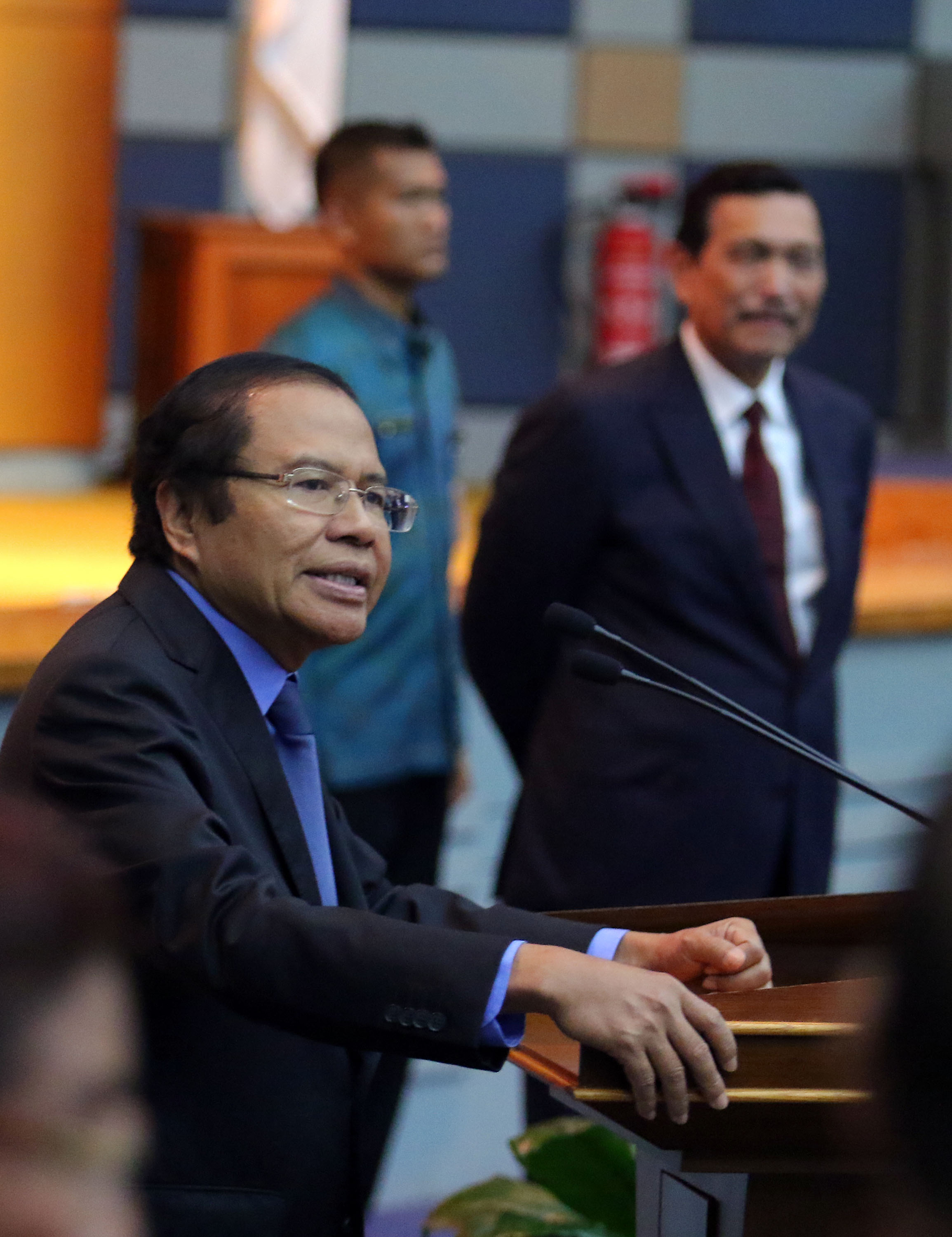 Menko Bidang Kemaritiman Luhut B. Pandjaitan (kanan) menyaksikan sambutan Rizal Ramli ketika mengikuti serah terima jabatan (sertijab) Menko Bidang Kemaritiman di Gedung BPPT, Jakarta, Kamis (28/7). Luhut B. Pandjaitan yang sebelumnya menjabat Menko Polhukam dirotasi menjadi Menko Bidang Kemaritiman menggantikan Rizal Ramli dalam kabinet kerja.