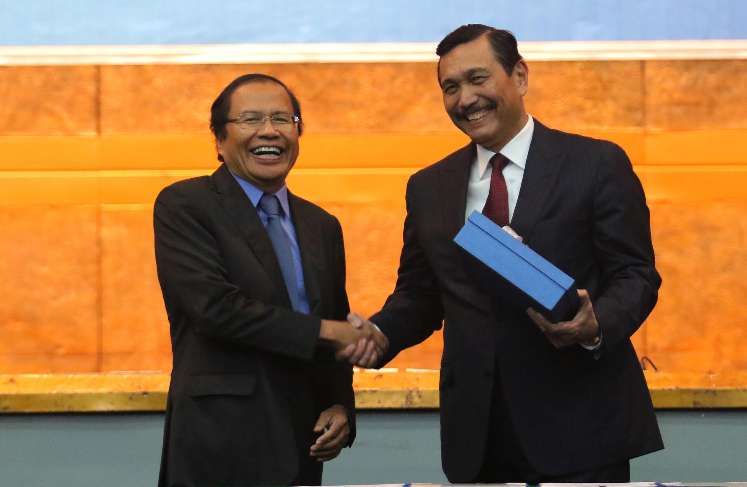 Menko Bidang Kemaritiman Luhut B. Pandjaitan (kanan) berjabat tangan dengan Rizal Ramli ketika mengikuti serah terima jabatan (sertijab) Menko Bidang Kemaritiman di Gedung BPPT, Jakarta, Kamis (28/7). Luhut B. Pandjaitan yang sebelumnya menjabat Menko Polhukam dirotasi menjadi Menko Bidang Kemaritiman menggantikan Rizal Ramli dalam kabinet kerja.