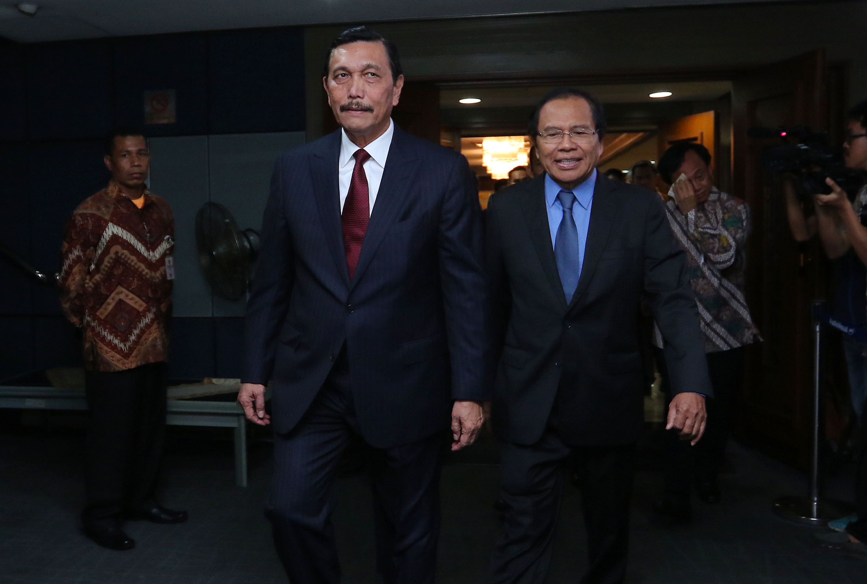 Menko Bidang Kemaritiman Luhut B. Pandjaitan (kedua kiri) berjalan bersama Rizal Ramli ketika akan mengikuti serah terima jabatan (sertijab) Menko Bidang Kemaritiman di Gedung BPPT, Jakarta, Kamis (28/7). Luhut B. Pandjaitan yang sebelumnya menjabat Menko Polhukam dirotasi menjadi Menko Bidang Kemaritiman menggantikan Rizal Ramli dalam kabinet kerja.