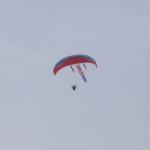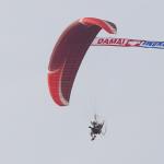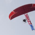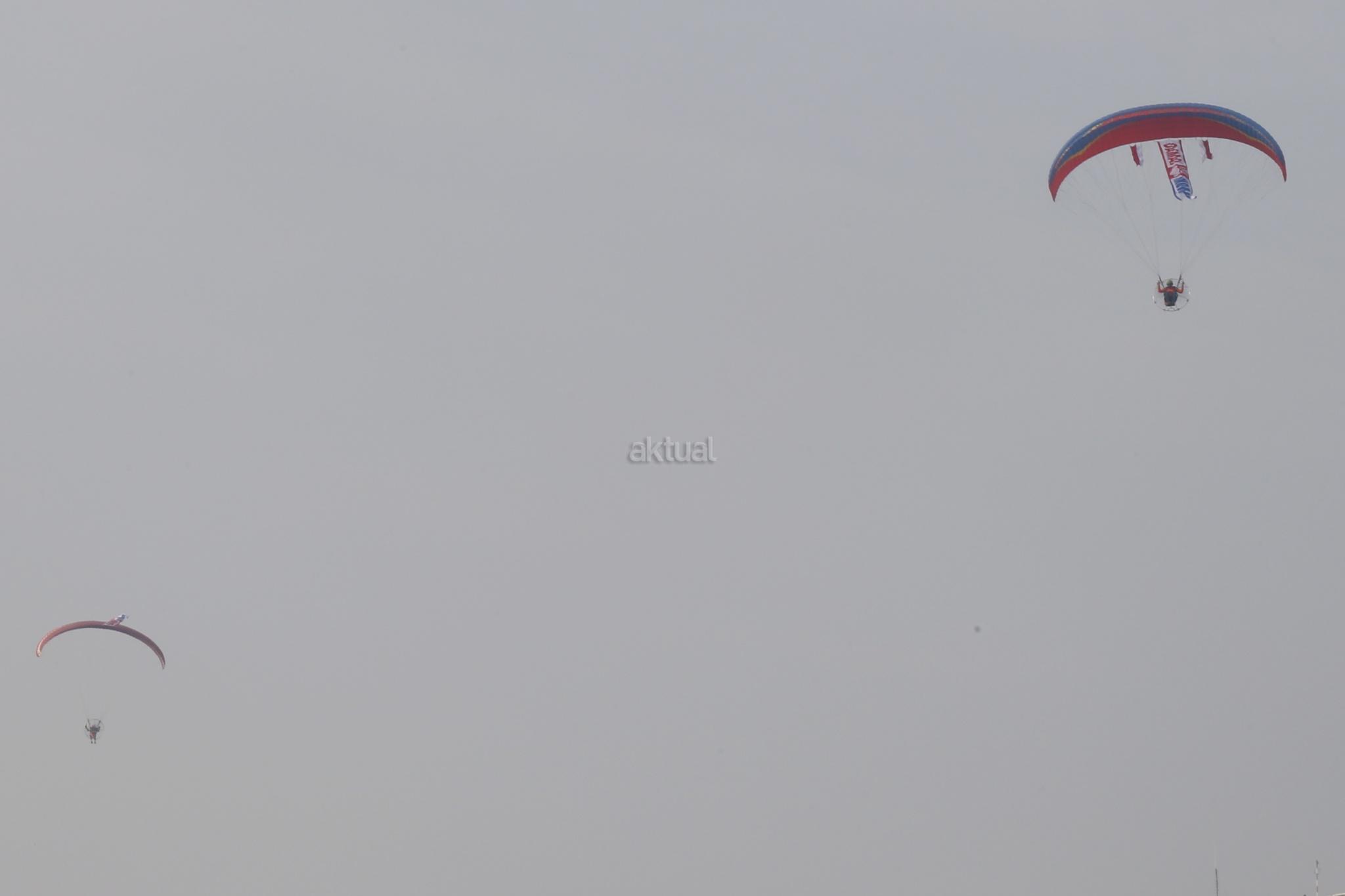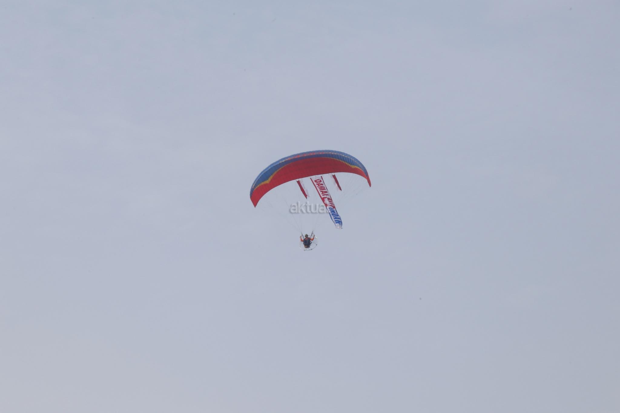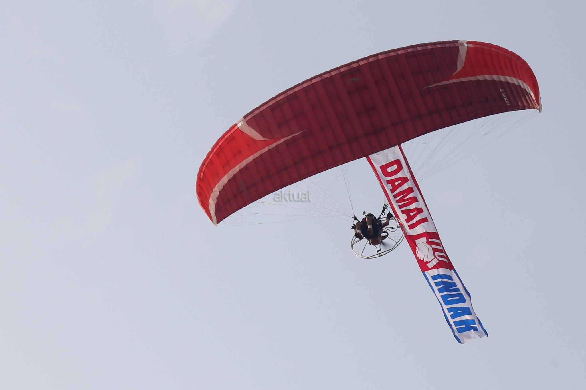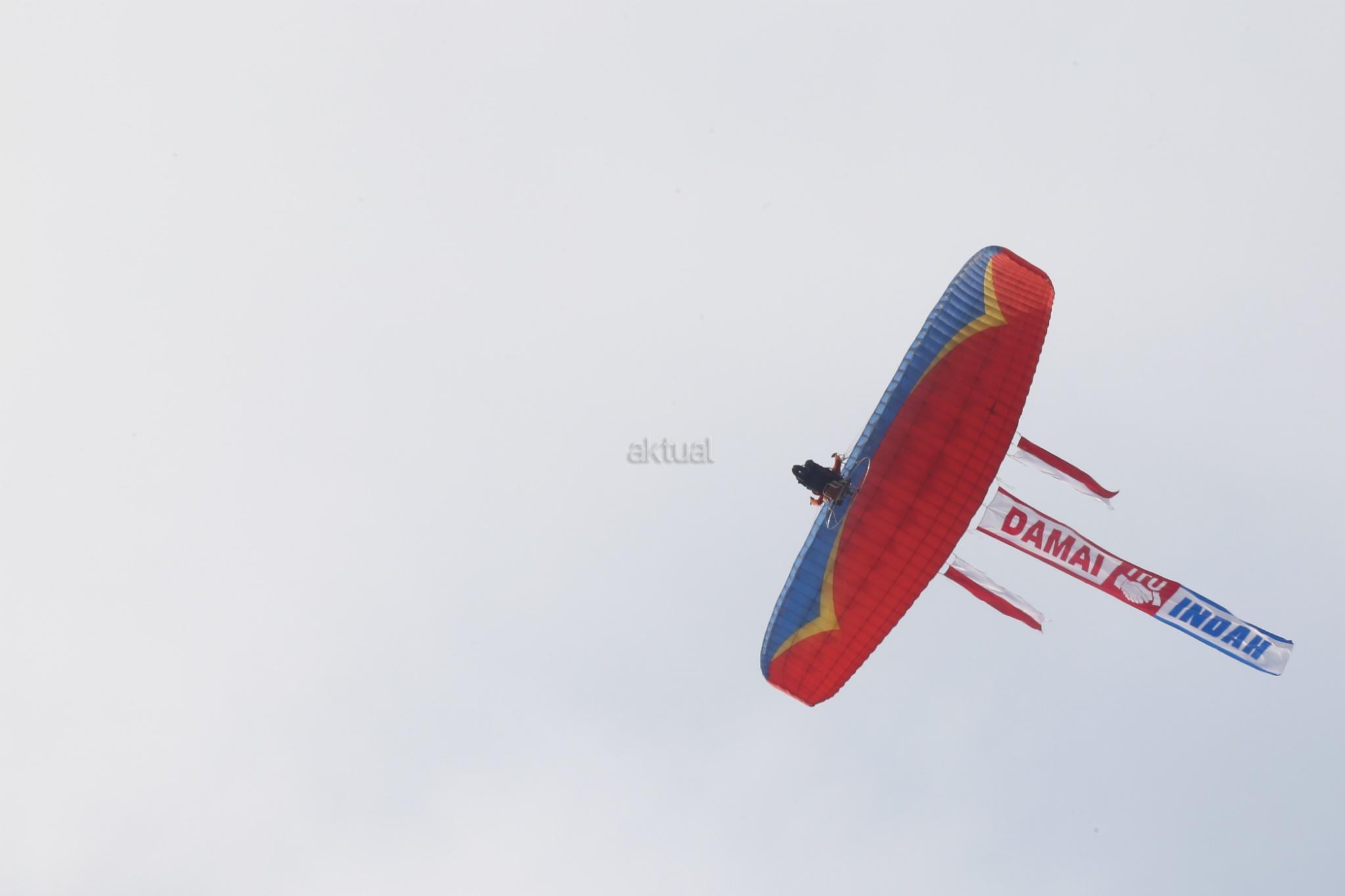 Beberapa atlet paramotor terbang rendah membawa spanduk raksasa bertuliskan “Damai Itu Indah” dikawasan Monumen Nasional, Jakarta, Minggu (27/11/2016). Seruan tersebut sebagai bentuk kedamaian untuk sesama manusia saling menghargai, menghormati, dan mengasihi satu sama lain. AKTUAL/Tino Oktaviano