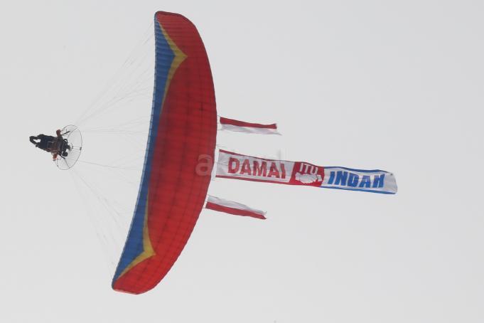 Beberapa atlet paramotor terbang rendah membawa spanduk raksasa bertuliskan "Damai Itu Indah" dikawasan Monumen Nasional, Jakarta, Minggu (27/11/2016). Seruan tersebut sebagai bentuk kedamaian untuk sesama manusia saling menghargai, menghormati, dan mengasihi satu sama lain. AKTUAL/Tino Oktaviano