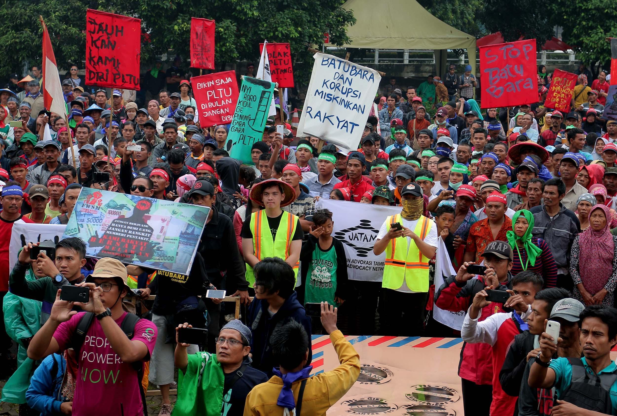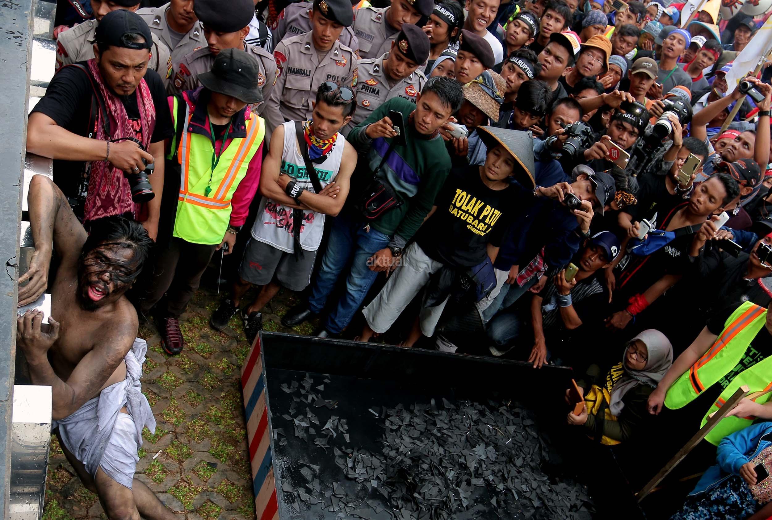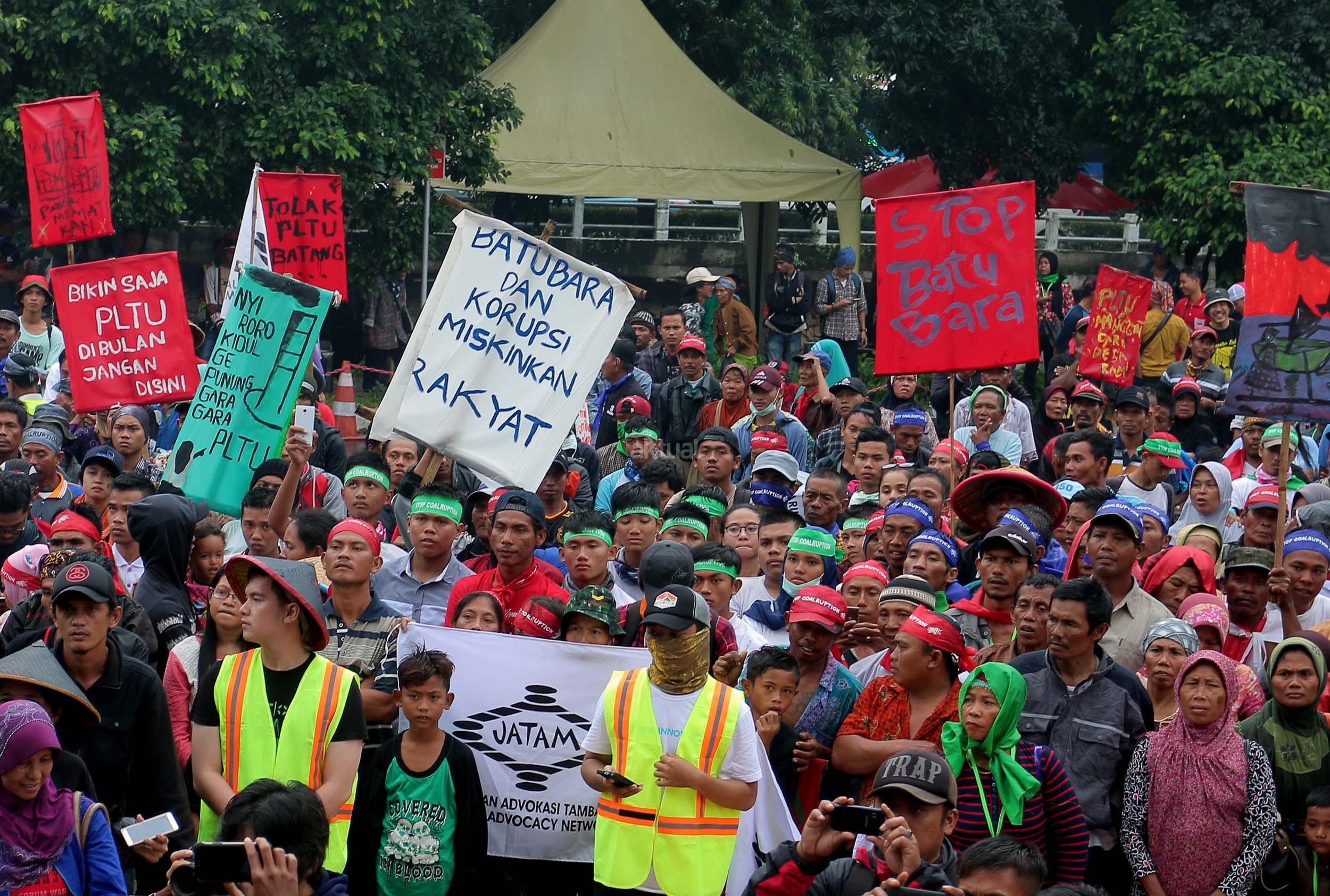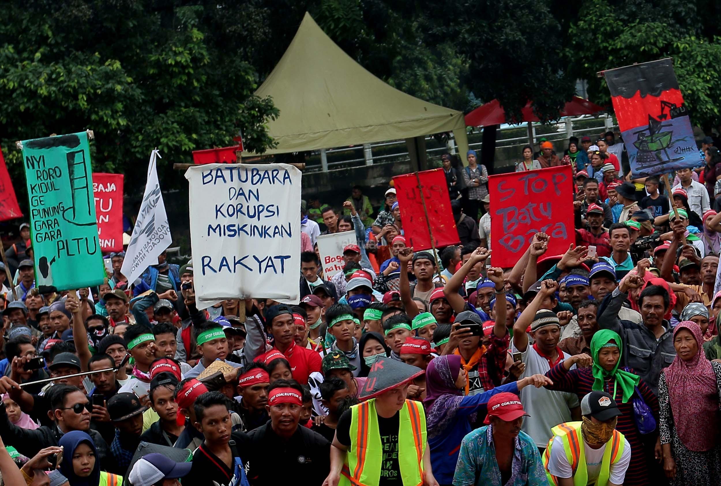 Ribuan massa yang tergabung dalam Koalsisi Masyarakat Sipil melakukan aksi di depan kantor Komisi Pemberantasan Korupsi (KPK), Jakarta, Kamis (23/3/2017). Dalam aksi tersebut mereka mendesak pemerintah agar lepas dari ketergantungan terhadap bahan bakar fosil khususnya batu bara dan meminta KPK mengusut praktek korupsi industri batu bara. AKTUAL/Munzir