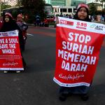 Sejumlah elemen masyarakat dari berbagai organisasi kemanusiaan melakukan aksi tolak pembataian umat muslim Aleppo, Suriah, di CFD, kawasan Bunderan HI, Jakarta, Minggu (18/12/2016). Dalam aksinya para elemen masyarakat juga melakukan penggalangan dana untuk para korban perang saudara di Aleppo, Suriah.
