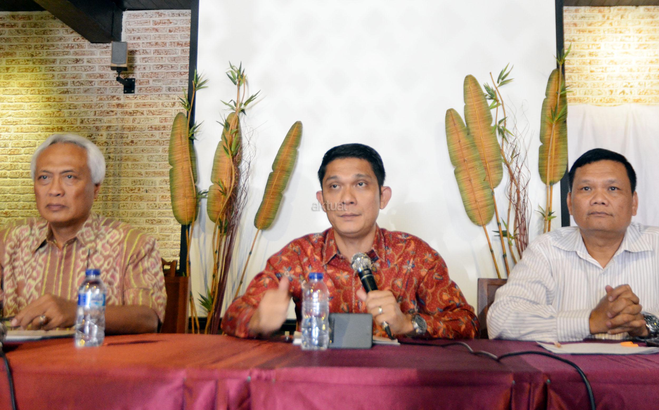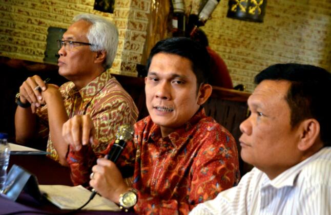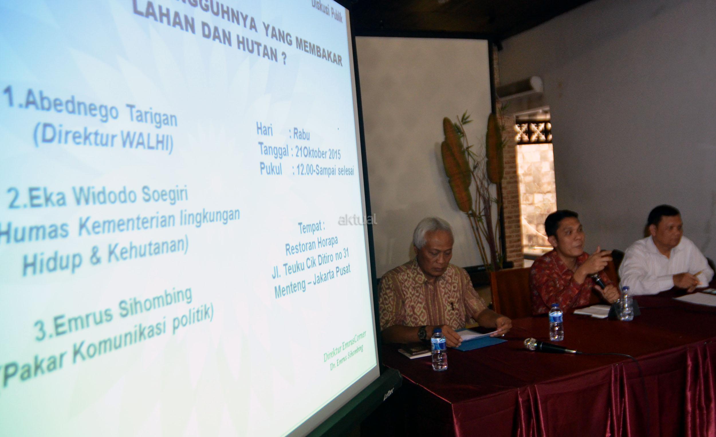 Kiri-kanan ; Kepala Biro Humas Kementerian Lingkungan Hidup & Kehutanan Eka Widodo Soegiri, Direktur Walhi Abetnego Tarigan, Pakar Komunikasi Politik Emrus Sihombing dalam diksusi "SIAPA YANG SESUNGGUHNYA YANG MEMBAKAR LAHAN DAN HUTAN?" di Jakarta, Rabu (21/10/2015). Di tengah polemik kebakaran lahan dan hutan muncul wacana dari beberapa kalangan agar kebakaran lahan dan hutan ditetapkan sebagai bencana nasional.