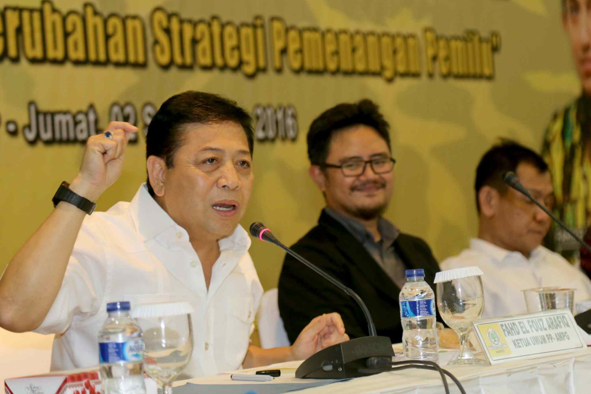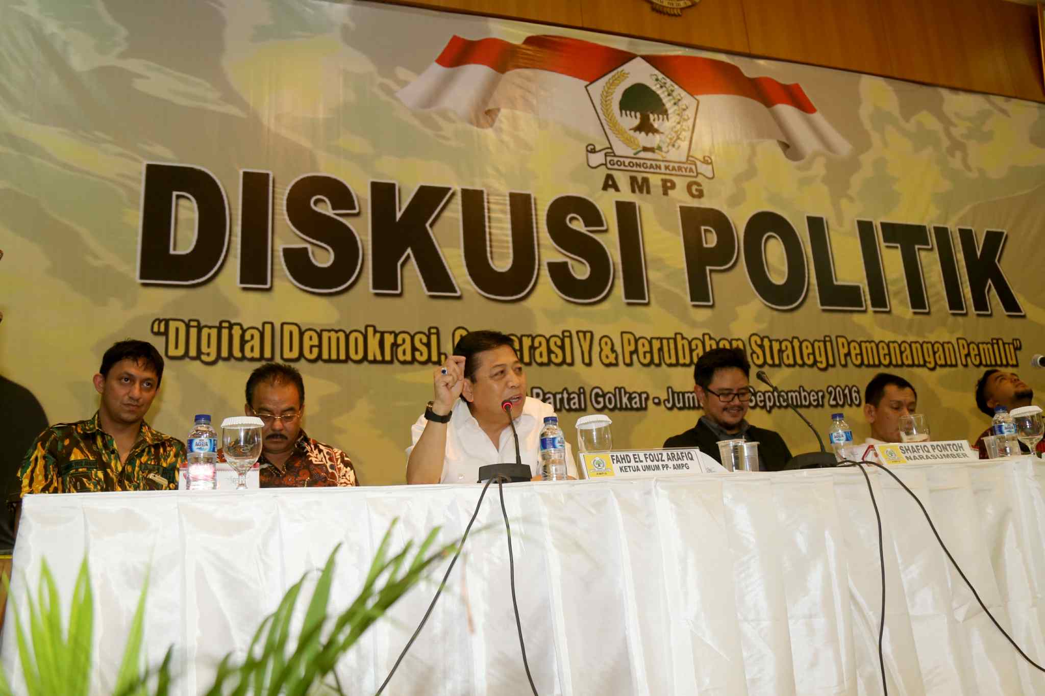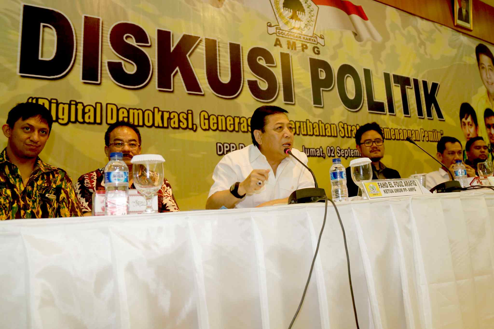 Ketua Umum Partai Golkar Setya Novanto intruksikan kader Golkar khususnya Angkatan Muda Partai Golkar (AMPG) saat diskusi politik dengan tema “Digital Demokrasi, Generasi Y & Perubahan Strategi Pemenangan Pemilu” di gedung DPP Partai Golkar, Jakarta, Jumat (2/9). Setya Novanto mengatakan, Joko Widodo bisa sukses menjadi Presiden RI karena media sosial, popularitas mengantarkan Jokowi jadi Gubernur DKI Jakarta dan akhirnya memenangkan pemilu Presiden 2014. Novanto pun menginstruksikan para kader menggunakan dan memanfaatkan media sosial guna kembali memenangkan Jokowi di Pilpres 2019 mendatang. AKTUAL/TINO OKTAVIANO