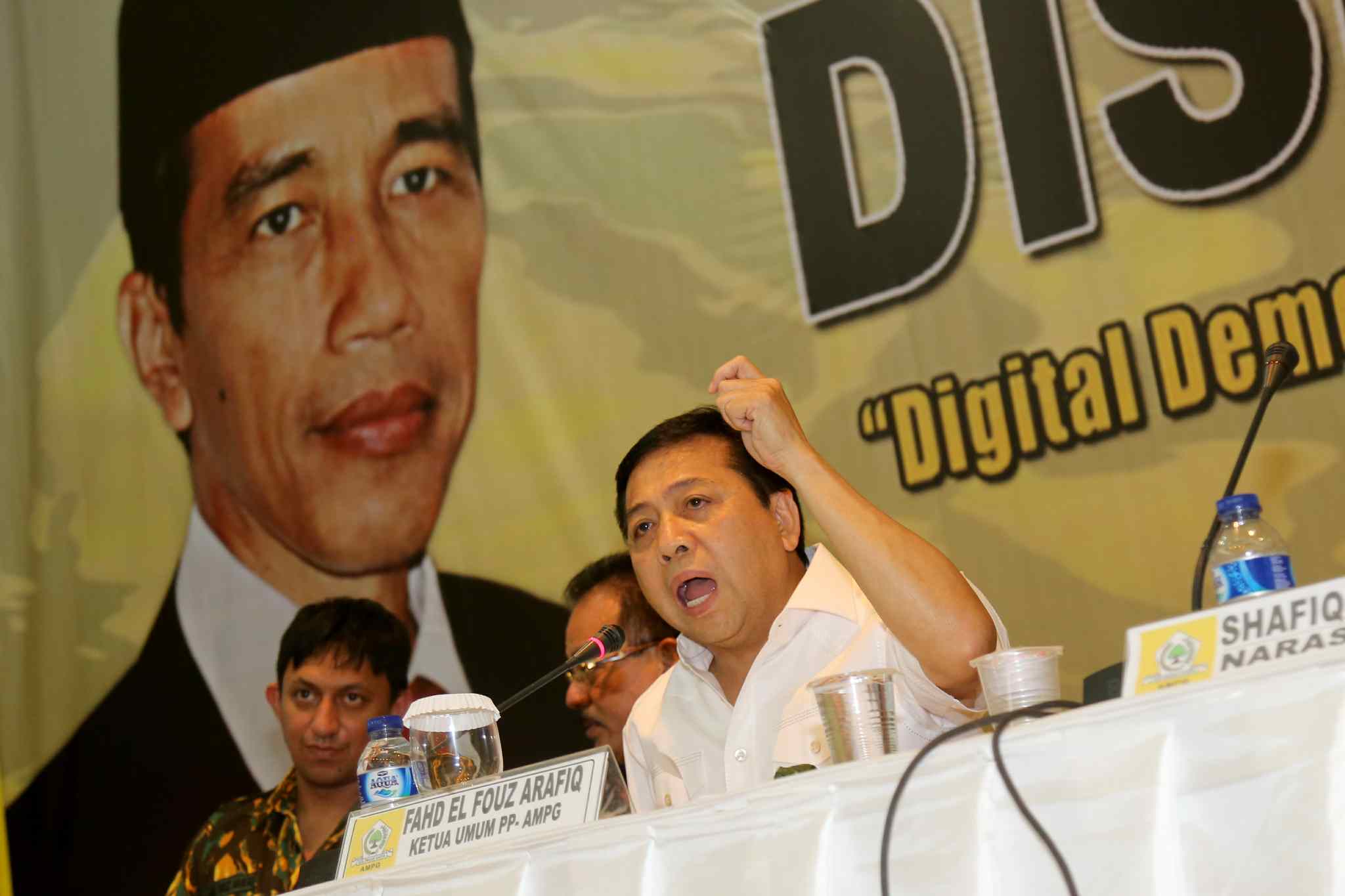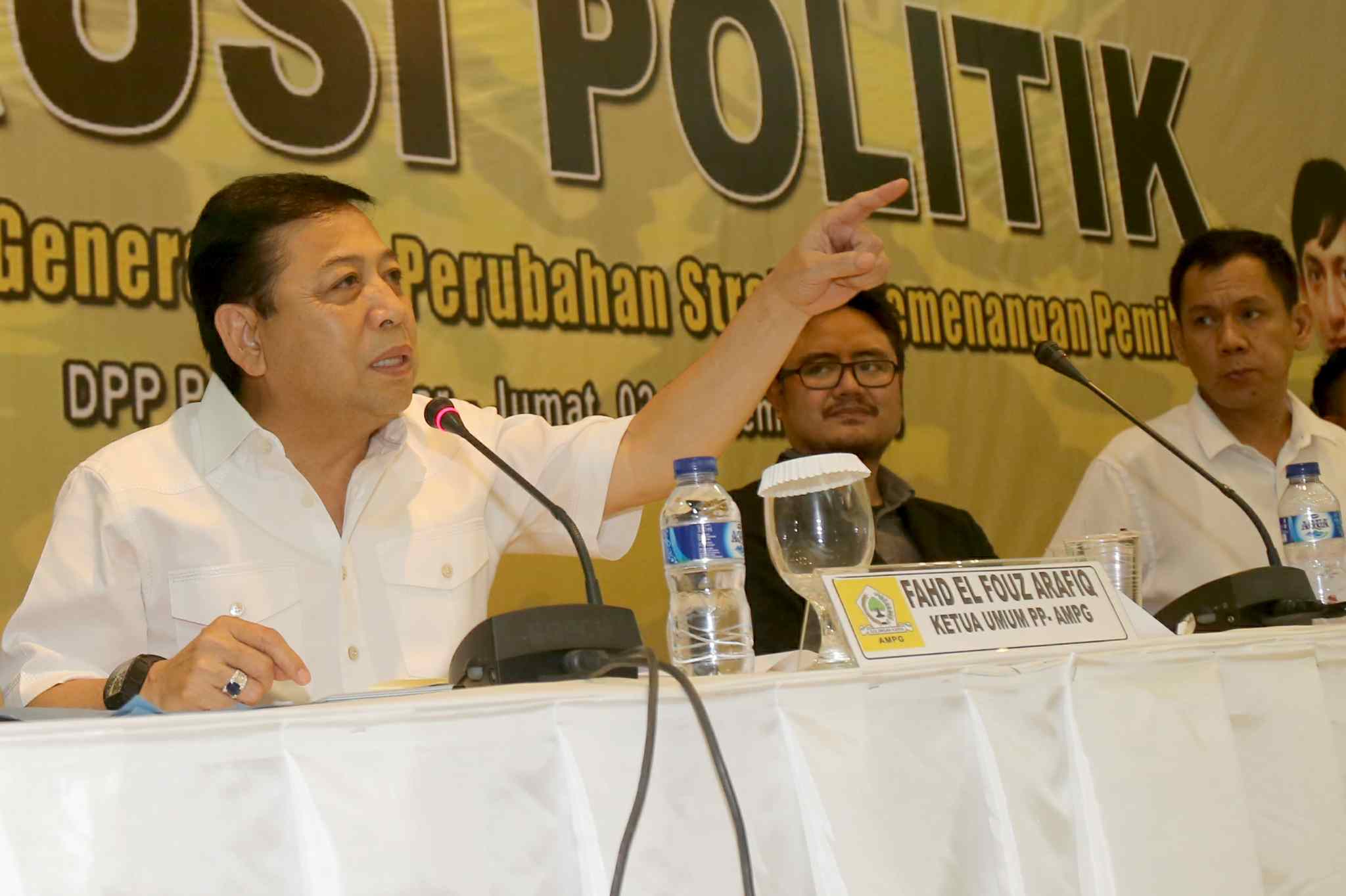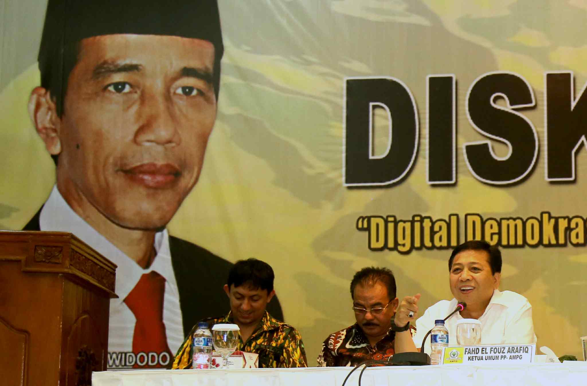 Ketua Umum Partai Golkar Setya Novanto intruksikan kader Golkar khususnya Angkatan Muda Partai Golkar (AMPG) saat diskusi politik dengan tema “Digital Demokrasi, Generasi Y & Perubahan Strategi Pemenangan Pemilu” di gedung DPP Partai Golkar, Jakarta, Jumat (2/8). Setya Novanto mengatakan, Joko Widodo bisa sukses menjadi Presiden RI karena media sosial, popularitas mengantarkan Jokowi jadi Gubernur DKI Jakarta dan akhirnya memenangkan pemilu Presiden 2014. Novanto pun menginstruksikan para kader menggunakan dan memanfaatkan media sosial guna kembali memenangkan Jokowi di Pilpres 2019 mendatang. AKTUAL/TINO OKTAVIANO