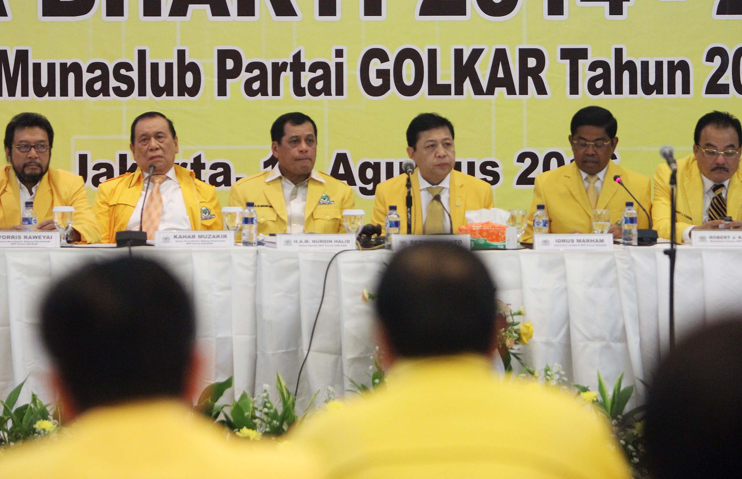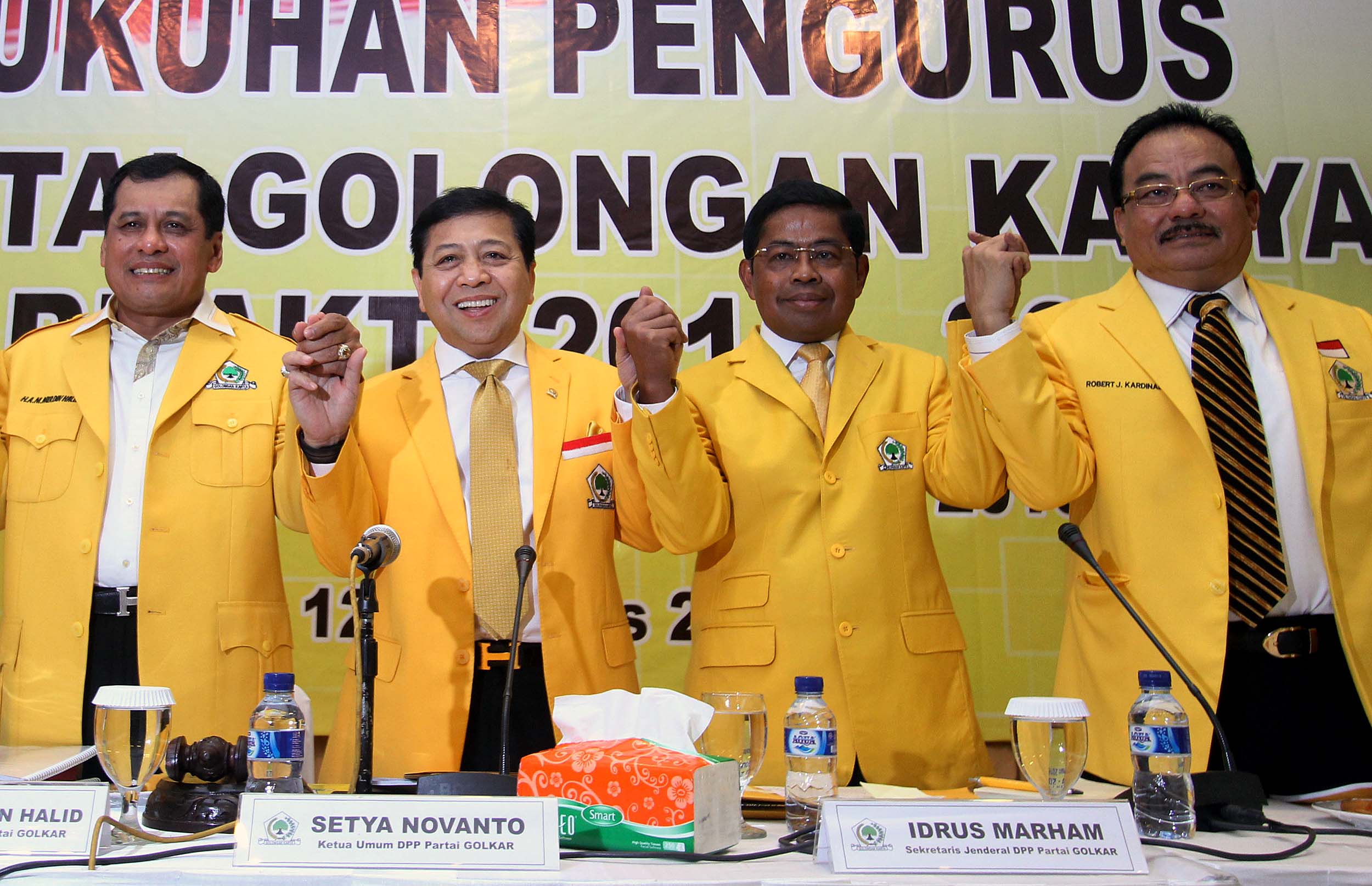 Ketua Umum DPP Partai Golkar Setya Novanto (tengah) didampingi Ketua Kordinator Bidang Kepartaian DPP Partai Golkar Kahar Muzakir, Ketua Harian DPP Partai Golkar Nurdin Halid, Sekretaris Jenderal DPP Partai Golkar Idrus Marham dan Bendahara Umum DPP Partai Golkar Robert J. Kardinal (kiri ke kanan memimpin acara pengukuhan pengurus DPP Partai Golkar di Kantor DPP Partai Golkar, Slipi, Jakarta, Jumat (12/8/2016). Pengukuhan 279 orang pengurus partai beringin untuk masa bakti 2014-2019 tersebut terdiri atas Pengurus Harian dan Pengurus Departemen Partai Golkar.