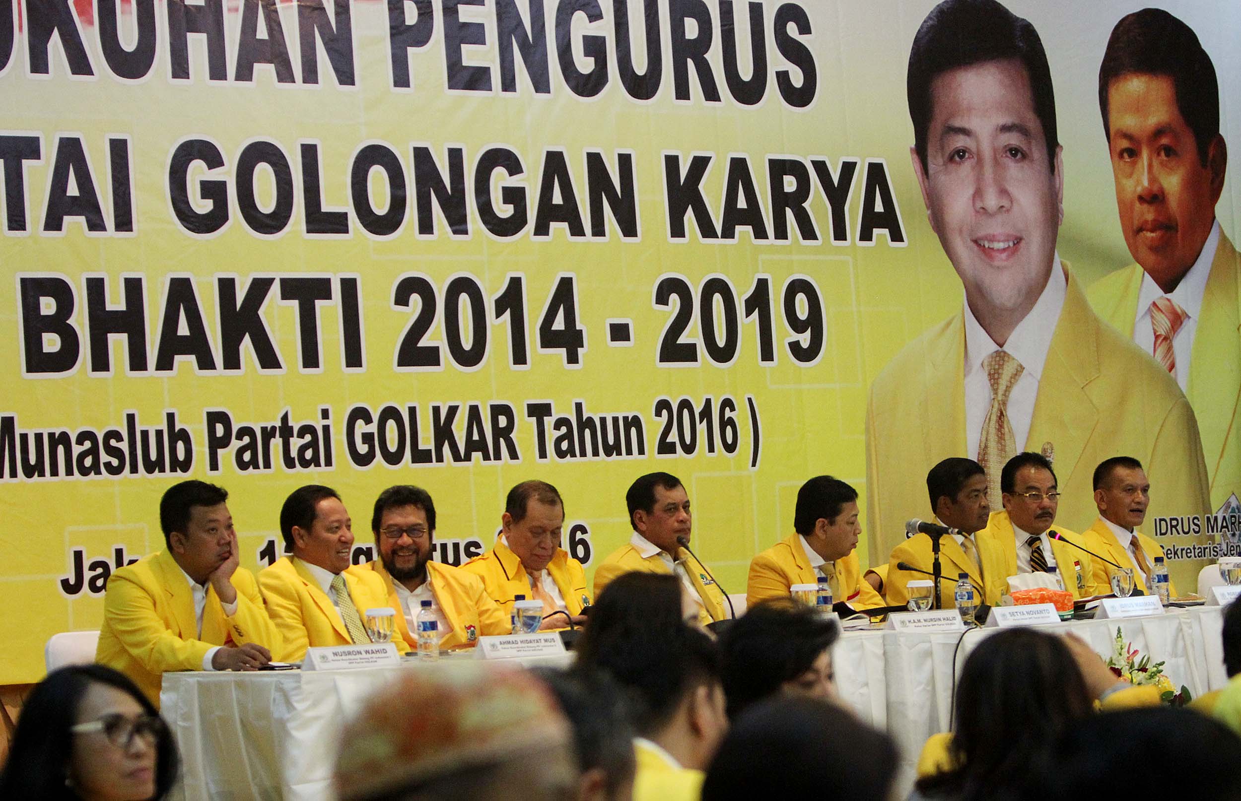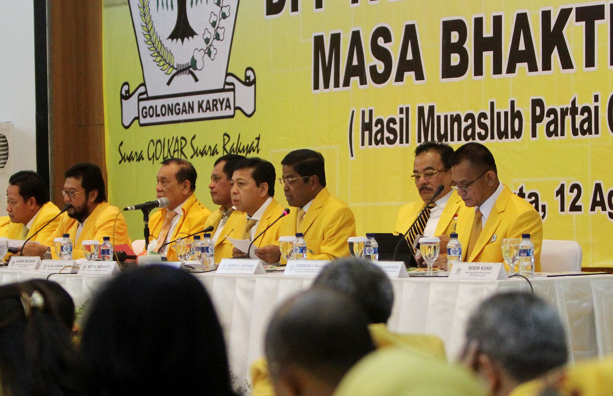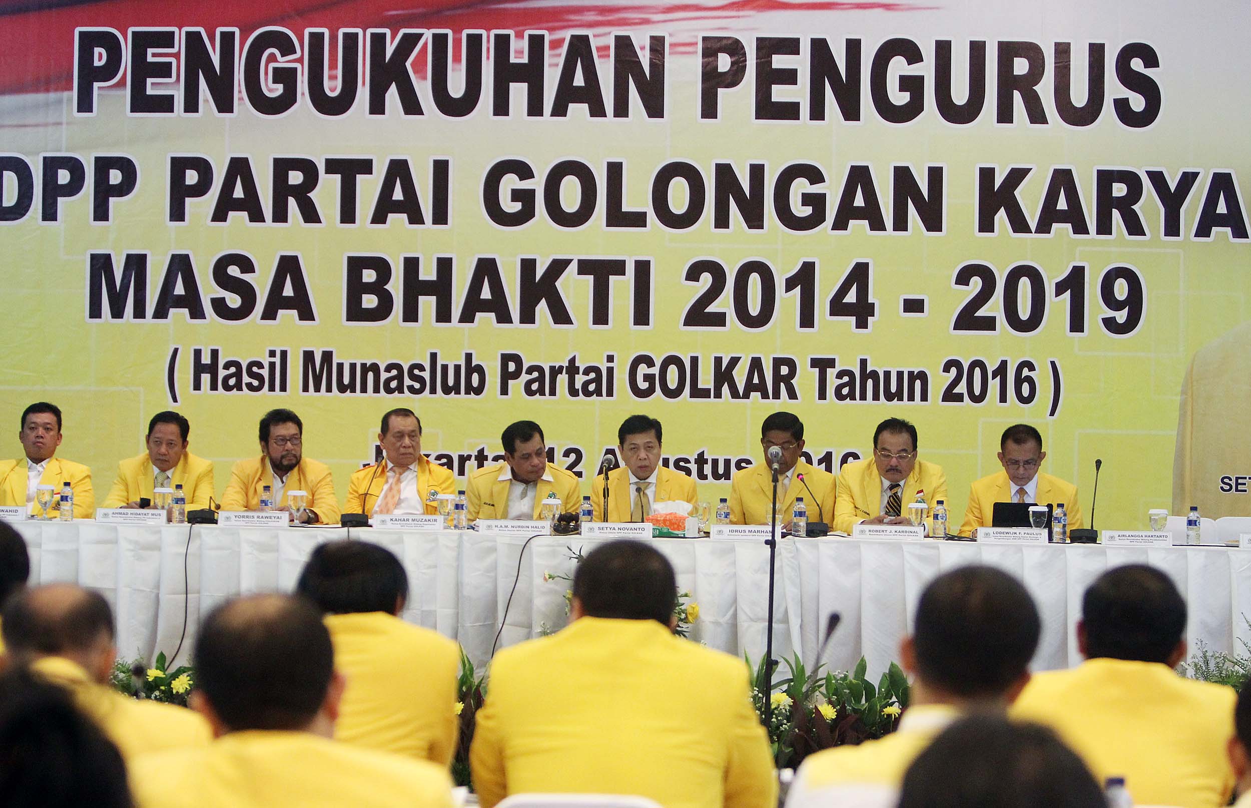 Ketua Umum DPP Partai Golkar Setya Novanto memimpin acara pengukuhan pengurus DPP Partai Golkar di Kantor DPP Partai Golkar, Slipi, Jakarta, Jumat (12/8/2016). Pengukuhan 279 orang pengurus partai beringin untuk masa bakti 2014-2019 tersebut terdiri atas Pengurus Harian dan Pengurus Departemen Partai Golkar.