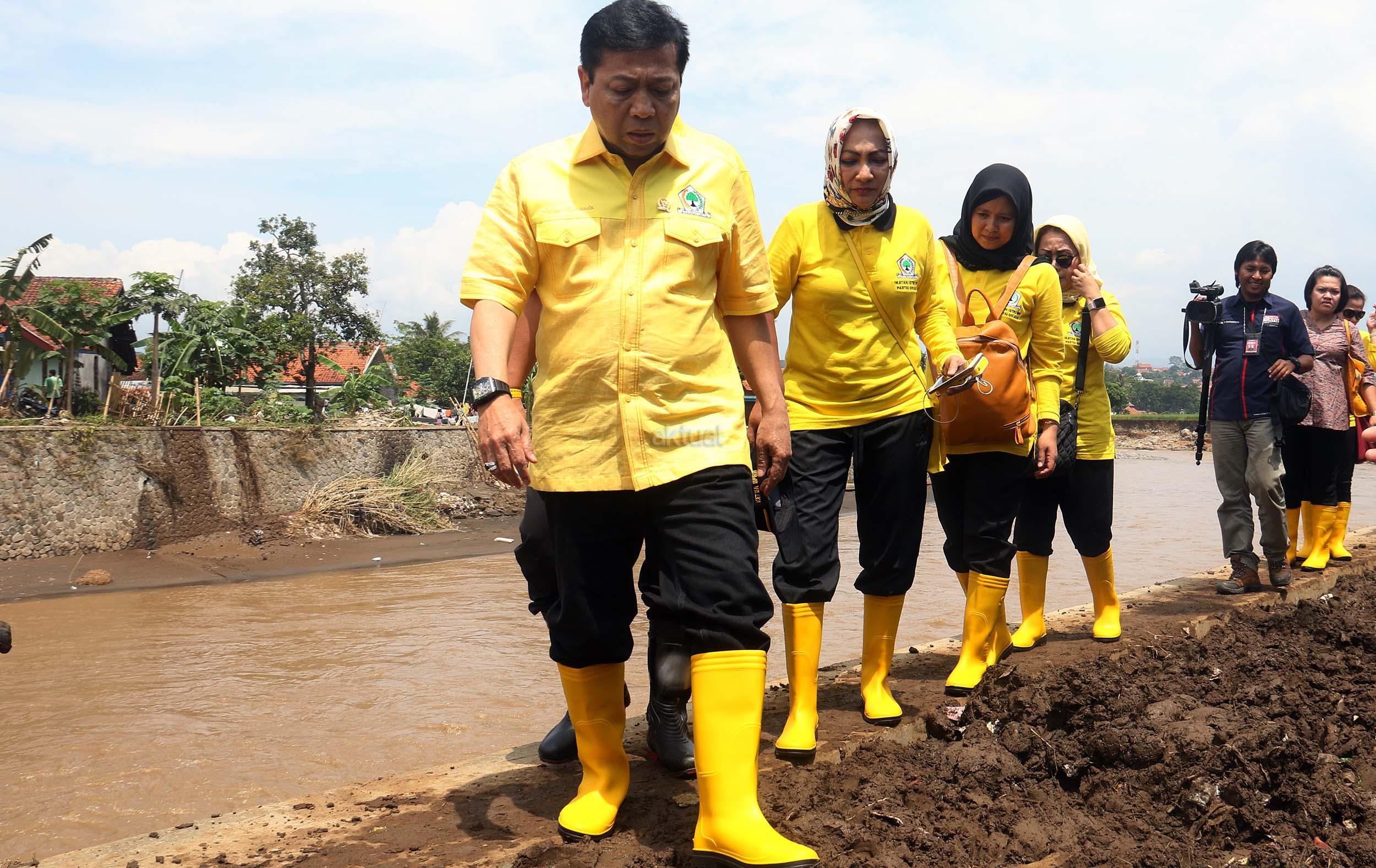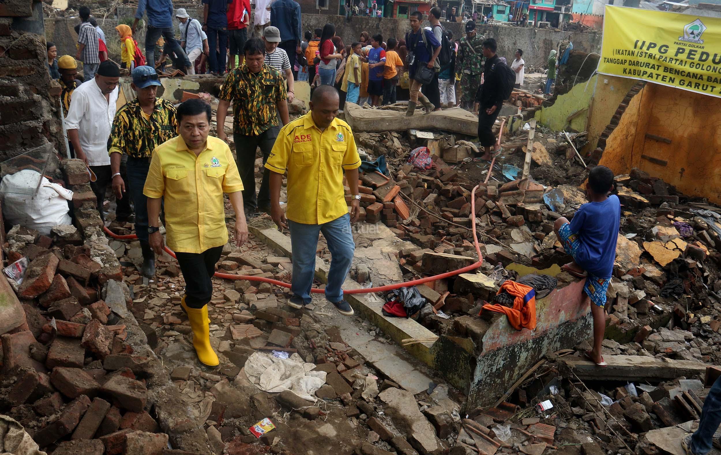 Ketua Umum Golkar Setya Novanto di damping Ketua DPD Partai Golkar Kabupaten Garut Ade Ginanjar dan bersama rombongan meninjau Desa Kaum Lebak, Kabupaten Garut,Jawa Barat, Jumat (23/9/2016). Kedatangan Ketua Umum Partai Golkar beserta rombongan pengurus DPP Partai Golkar, Ikatan Istri Partai Golkar dan AMPG untuk memberikan bantuan dari Ikatan Istri Partai Golkar,berupa pompa untuk menyedot air kotor, selimut, susu bayi, pakaian perempuan dan anak-anak. AKTUAL/MUNZIR