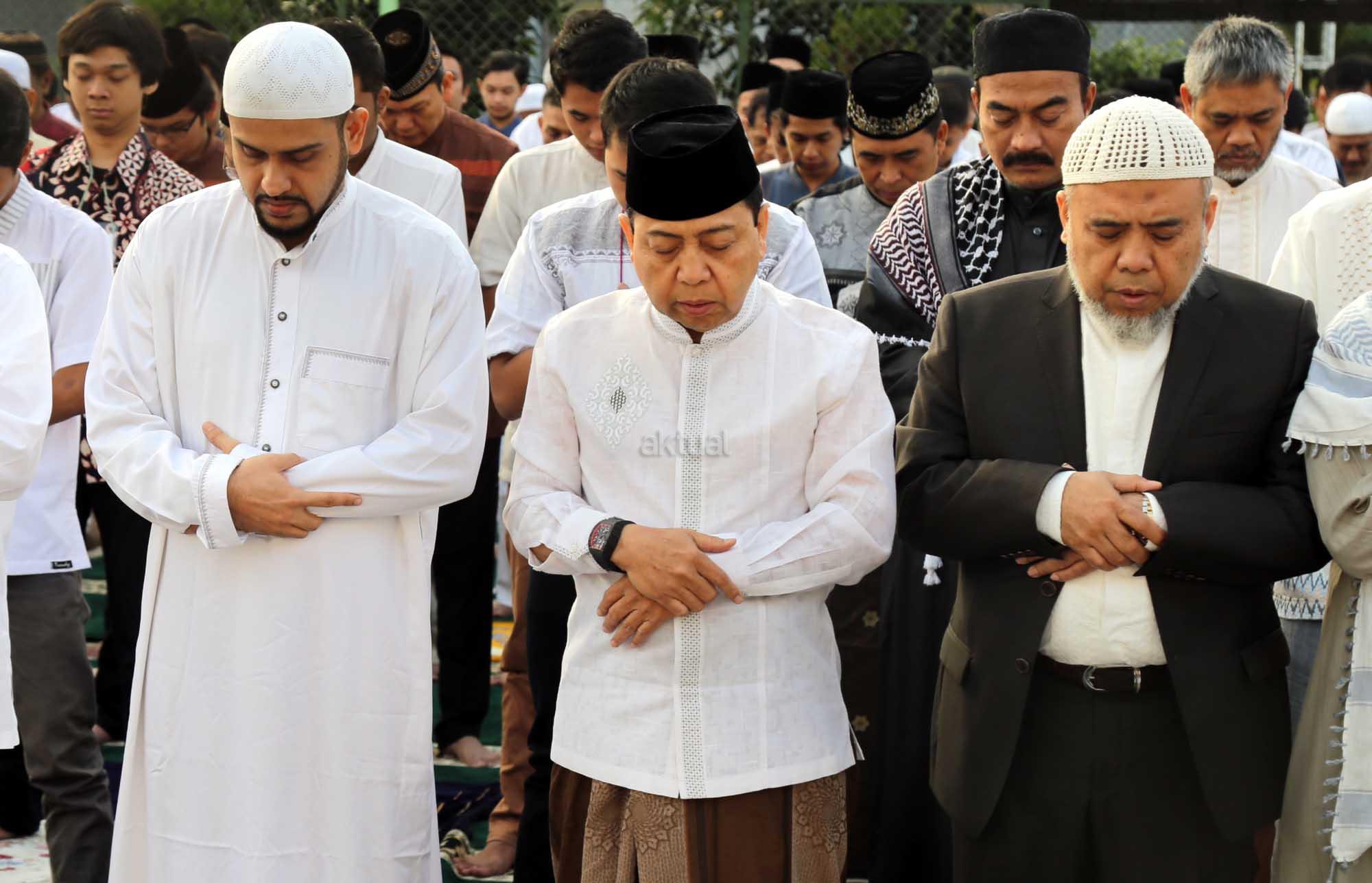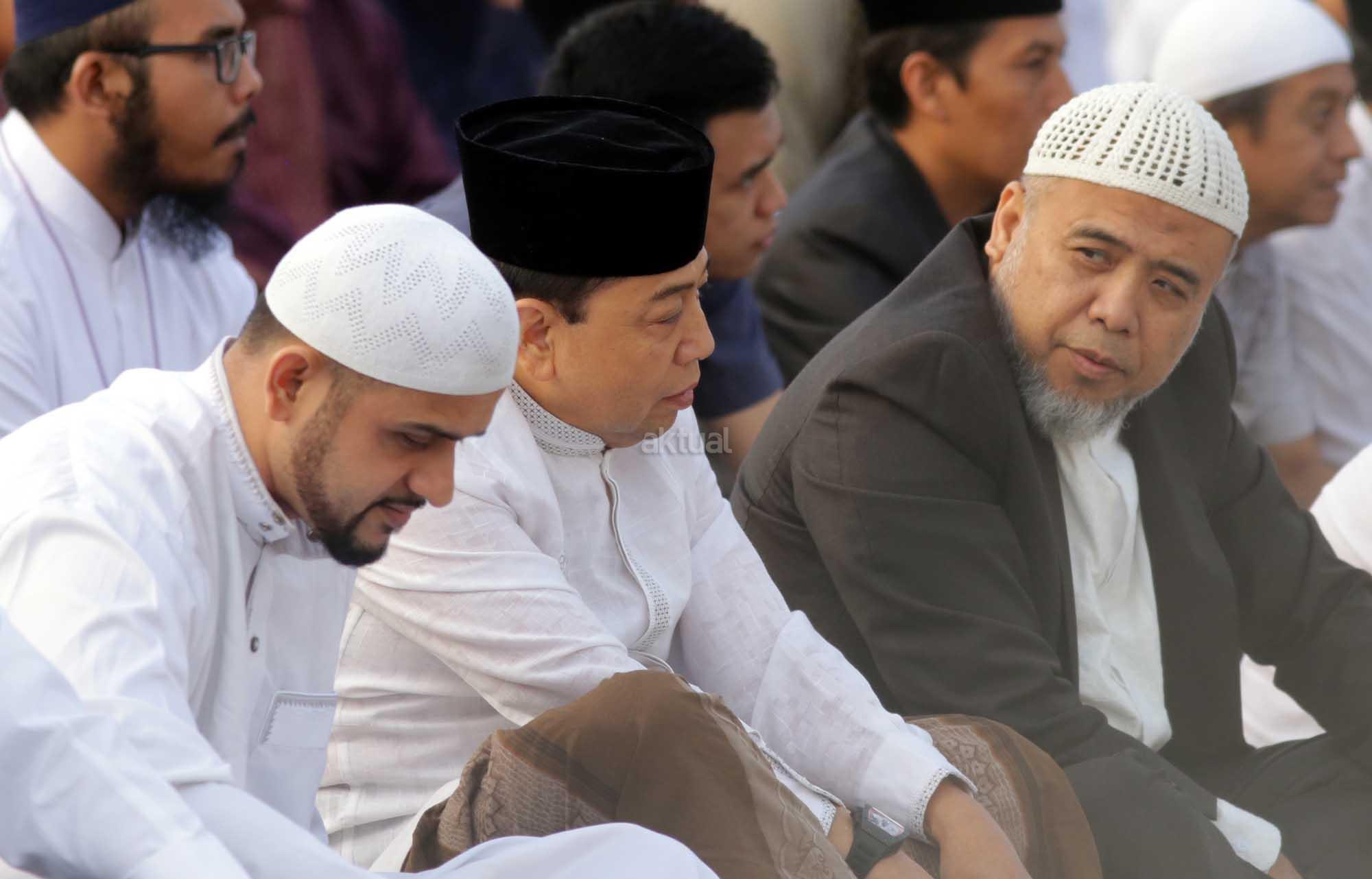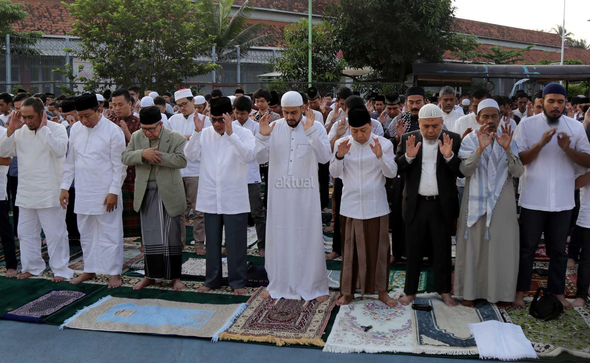 Terpidana kasus korupsi e-KTP Setya Novanto, bersama Terpidana kasus korupsi Wisma Atlet SEA Games tahun 2011, Muhammad Nazaruddin dan mantan Hakim Konstitusi Patrialis Akbar berada di saf paling depan saat melaksanakan Salat Idul Fitri di Lembaga Pemasyarakatan Sukamiskin, Bandung, Jawa Barat, Jumat (15/6/2018). Kementerian Hukum dan HAM menyetujui hanya tujuh narapidana kasus korupsi mendapatkan potongan hukuman atau remisi khusus dalam rangka Hari Raya Idul Fitri 2018. Di antara napi yang memperoleh remisi adalah mantan Muhammad Nazarudin. AKTUAL/Tino Oktaviano