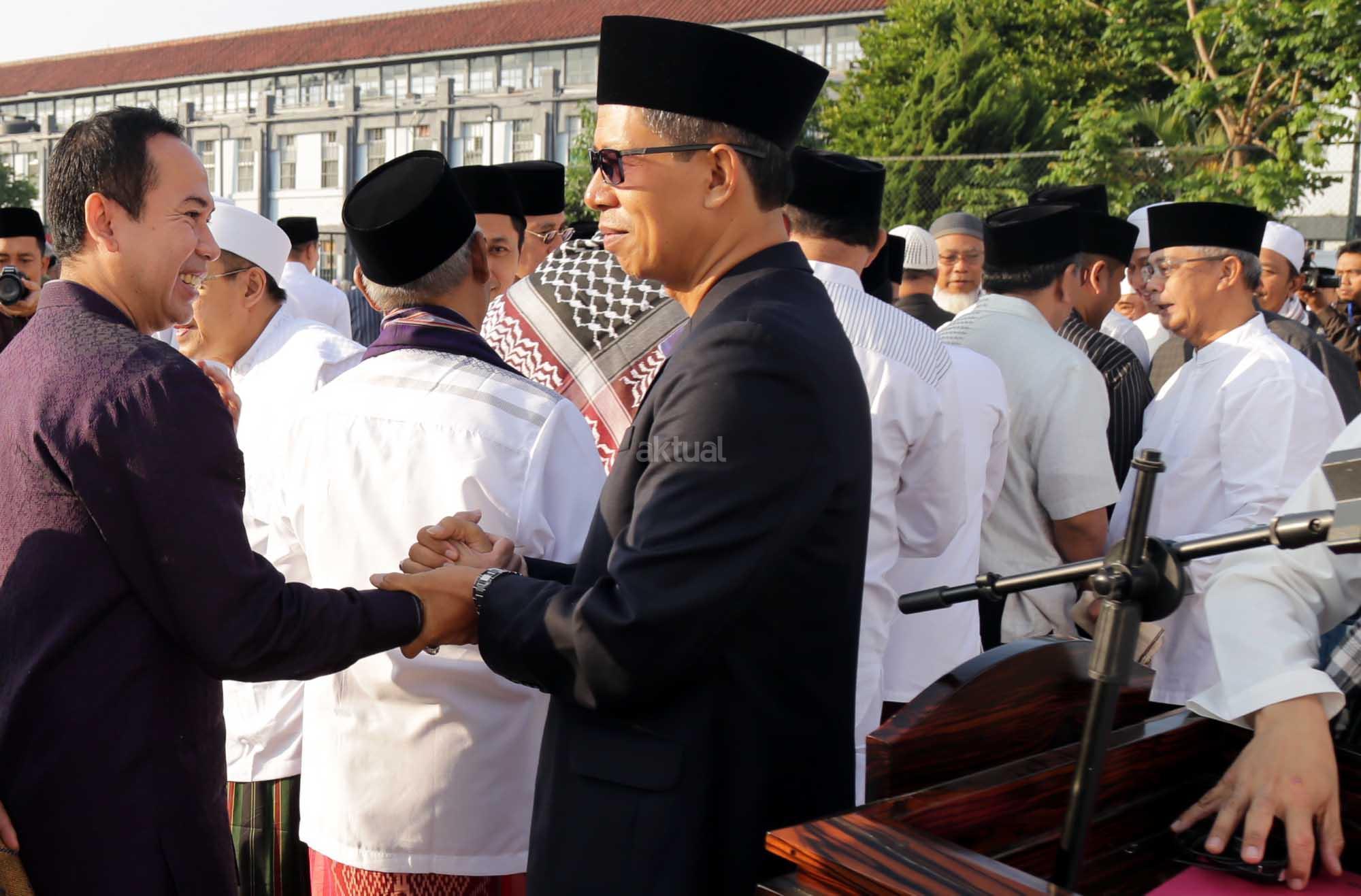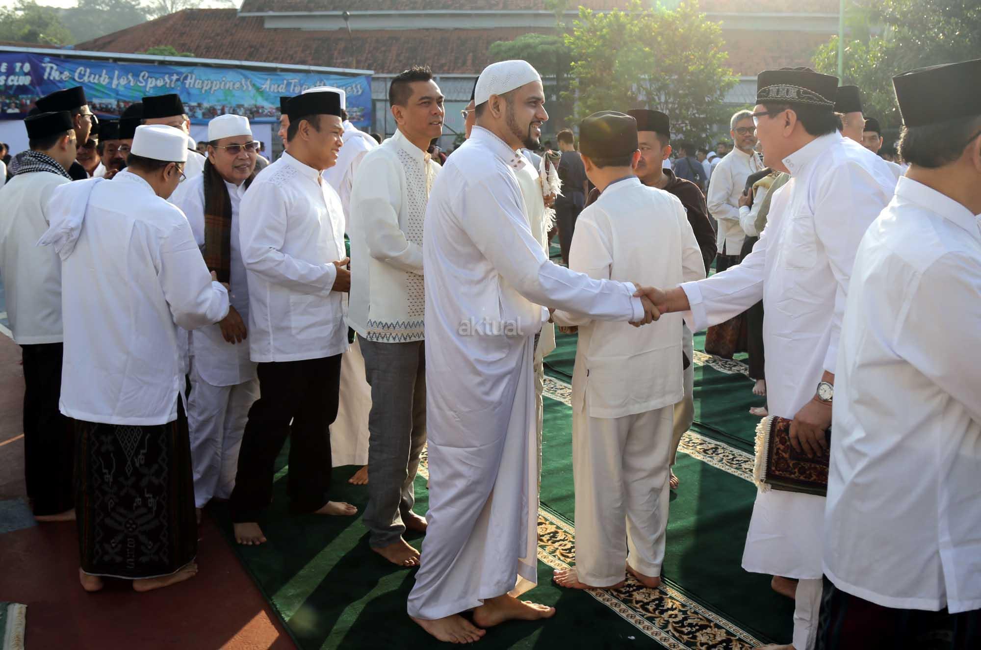 Kalapas Sukamiskin Wahid Husein saat bersalaman dengan terpidana kasus suap ke Mahkamah Konstitusi (MK) Tubagus Chaeri Wardana alias Wawan usai melaksanakan Salat Idul Fitri di Lembaga Pemasyarakatan Sukamiskin, Bandung, Jawa Barat, Jumat (15/6/2018). Kementerian Hukum dan HAM menyetujui hanya tujuh narapidana kasus korupsi mendapatkan potongan hukuman atau remisi khusus dalam rangka Hari Raya Idul Fitri 2018. Di antara napi yang memperoleh remisi adalah mantan Muhammad Nazarudin. AKTUAL/Tino Oktaviano
