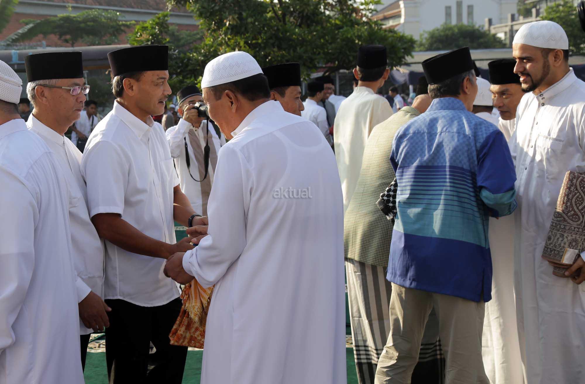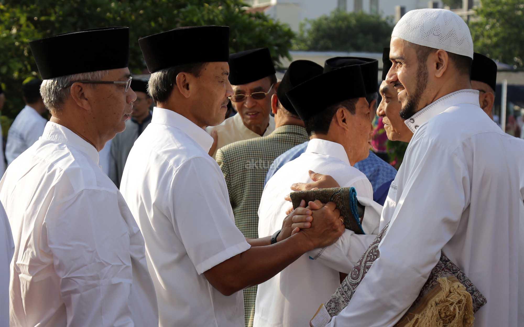 Terpidana kasus korupsi Wisma Atlet SEA Games tahun 2011, Muhammad Nazaruddin, Terpidana kasus dugaan suap raperda reklamasi di Pantai Utara Jakarta Mohammad Sanusi dan Terpidana kasus simulator SIM Kakorlantas Irjen Djoko Susilo saat bersalaman usai melaksanakan Salat Idul Fitri di Lembaga Pemasyarakatan Sukamiskin, Bandung, Jawa Barat, Jumat (15/6/2018). Kementerian Hukum dan HAM menyetujui hanya tujuh narapidana kasus korupsi mendapatkan potongan hukuman atau remisi khusus dalam rangka Hari Raya Idul Fitri 2018. Di antara napi yang memperoleh remisi adalah mantan Muhammad Nazarudin. AKTUAL/Tino Oktaviano