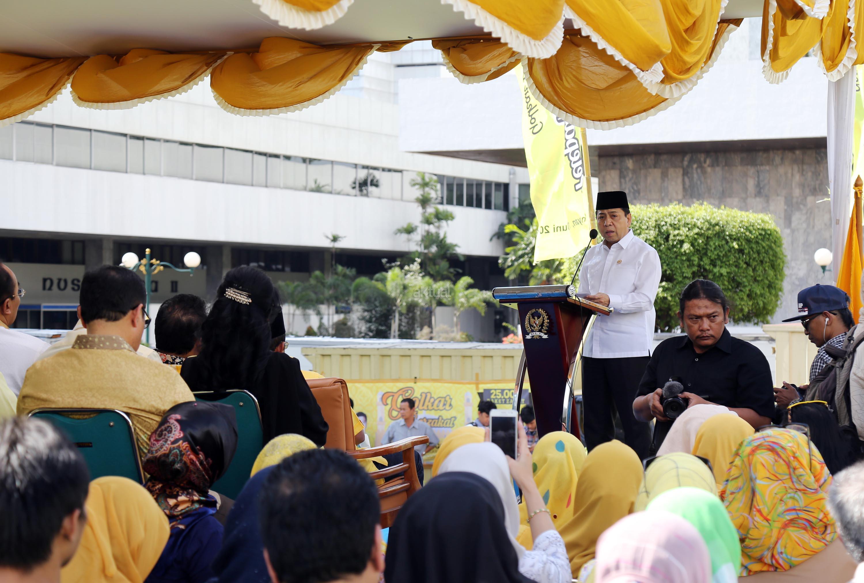 Ketua Umum Golkar Setya Novanto saat memberikan sambutan pelepasan dan pendistribusian zakat di Gedung DPR, Senayan, Jakarta, Jumat (16/6/17). DPP Partai Golkar mendistribusikan sebanyak 125 ton bantuan sembako yang diangkut menggunakan 60 truk ke seluruh wilayah di DKI Jakarta. AKTUAL/Tino Oktaviano
