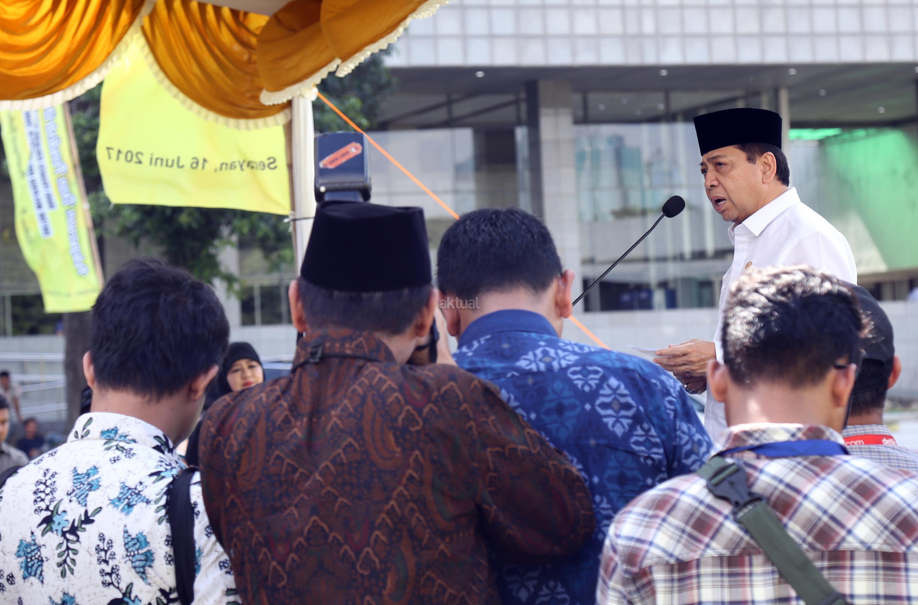 Ketua Umum Golkar Setya Novanto saat akan memberikan sambutan pelepasan dan pendistribusian zakat di Gedung DPR, Senayan, Jakarta, Jumat (16/6/17). DPP Partai Golkar mendistribusikan sebanyak 125 ton bantuan sembako yang diangkut menggunakan 60 truk ke seluruh wilayah di DKI Jakarta. AKTUAL/Tino Oktaviano