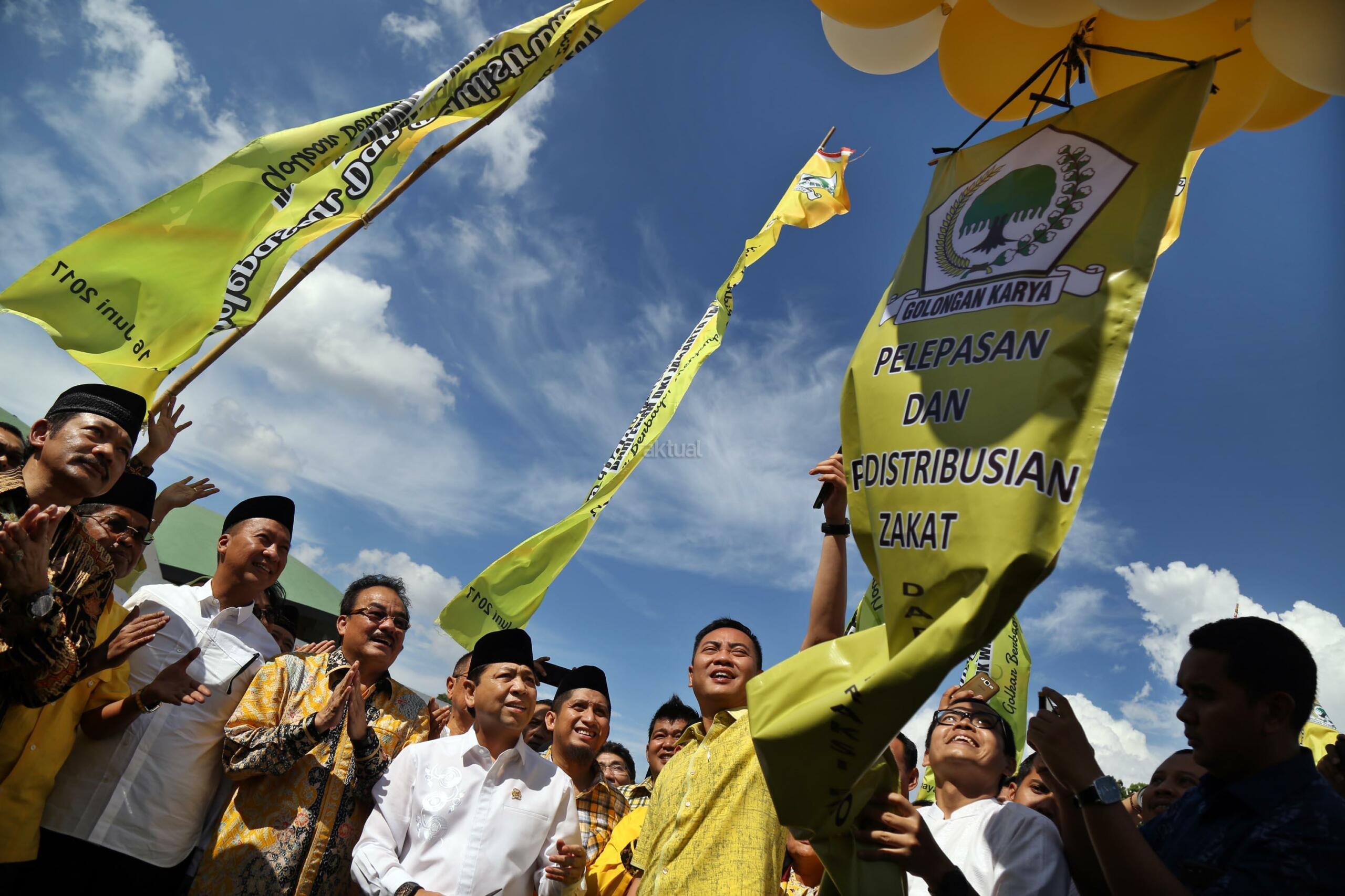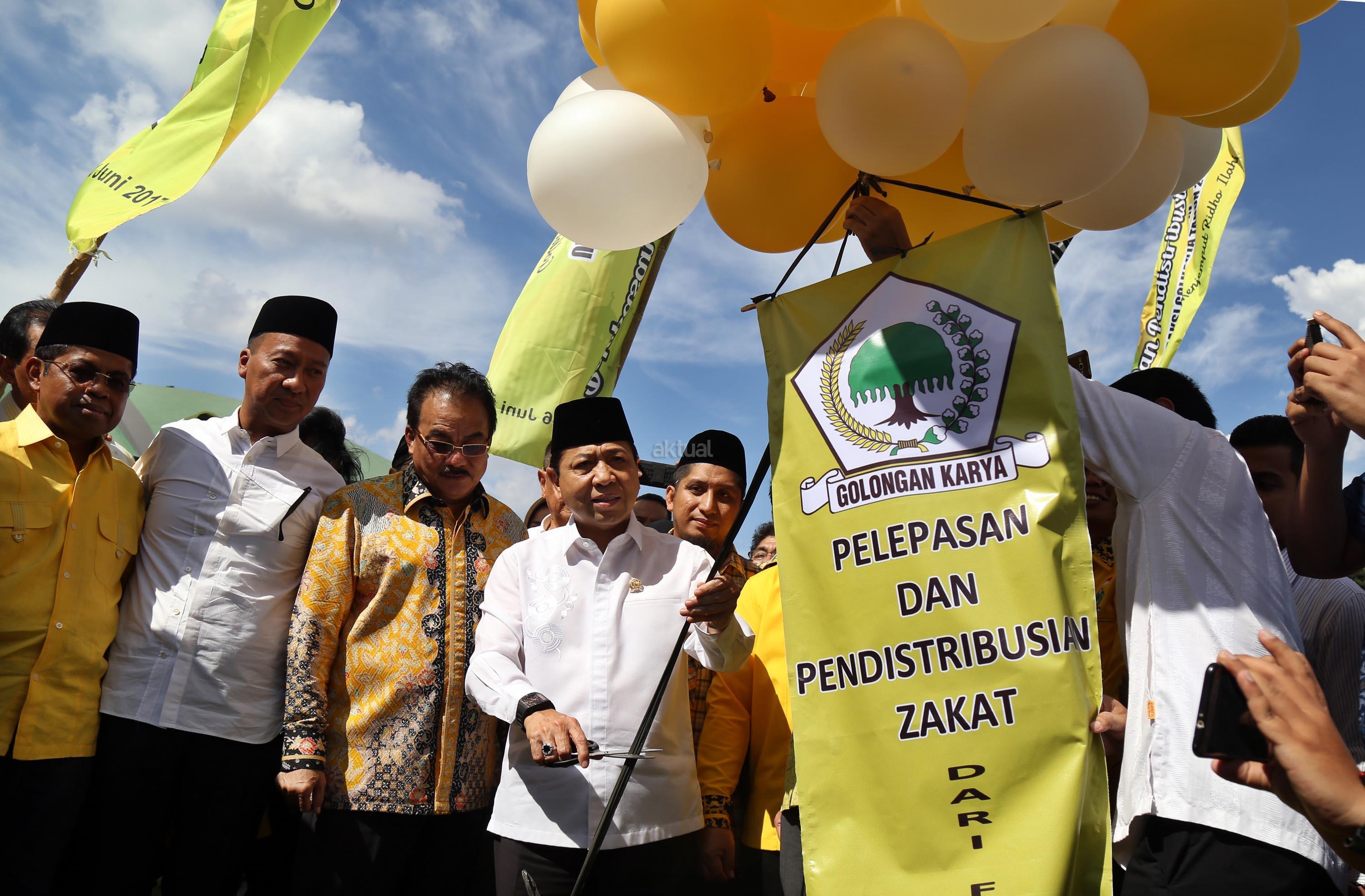 Ketua Umum Golkar Setya Novanto didampingi Ketua Fraksi Golkar DPR Robert Kardinal dan Ketua DPD Golkar DKI Jakarta Fayakhun Andriadi melepas balon sebagai tanda pelepasan dan pendistribusian zakat di Gedung DPR, Senayan, Jakarta, Jumat (16/6/17). DPP Partai Golkar mendistribusikan sebanyak 125 ton bantuan sembako yang diangkut menggunakan 60 truk ke seluruh wilayah di DKI Jakarta. AKTUAL/Tino Oktaviano