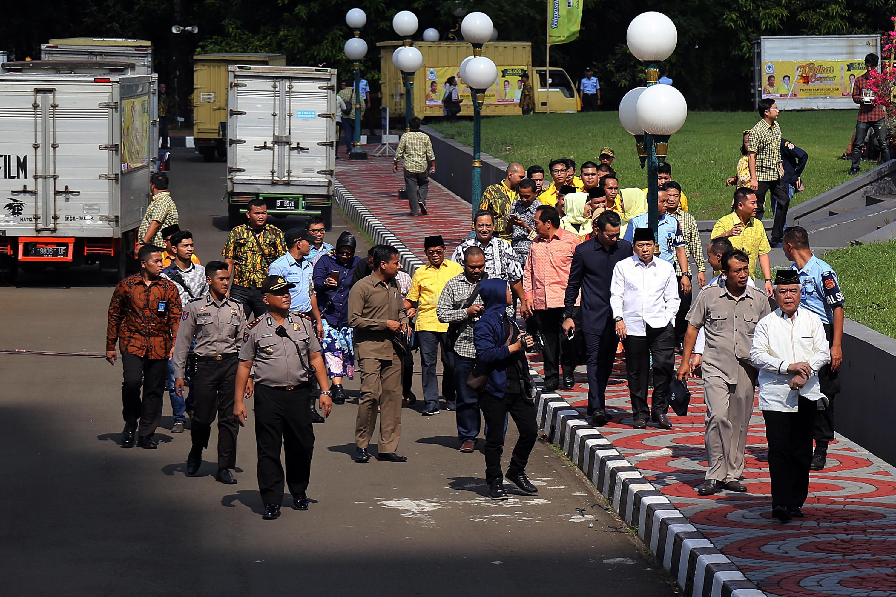 Ketua Umum Golkar Setya Novanto saat melepas pendistribusian zakat di Gedung DPR, Senayan, Jakarta, Jumat (16/6/17). DPP Partai Golkar mendistribusikan sebanyak 125 ton bantuan sembako yang diangkut menggunakan 60 truk ke seluruh wilayah di DKI Jakarta. AKTUAL/Tino Oktaviano