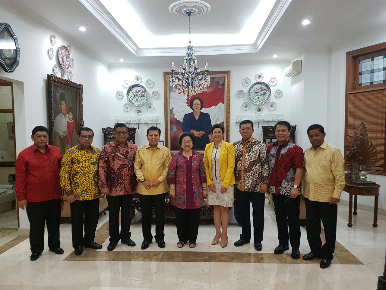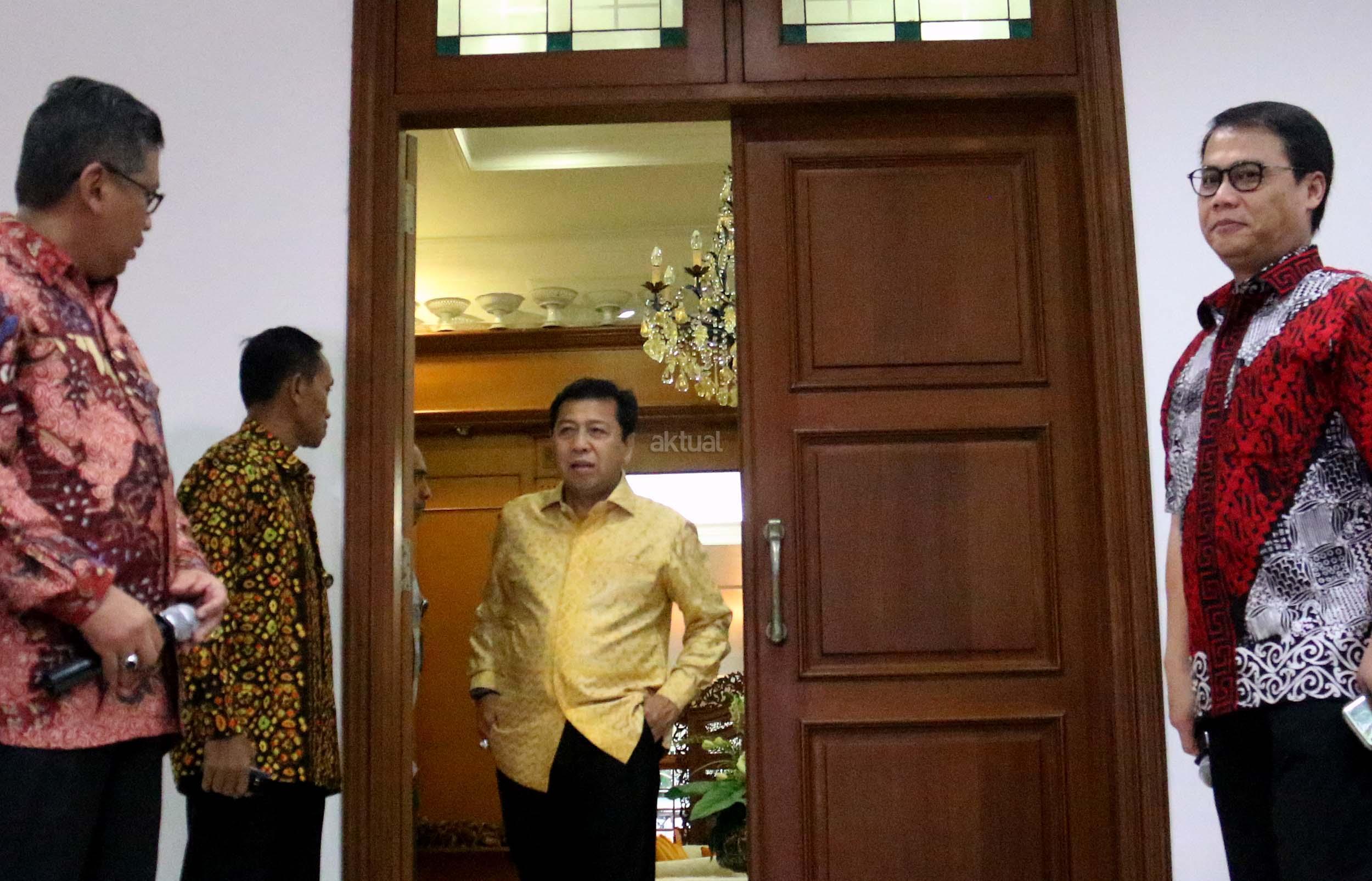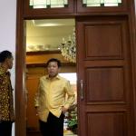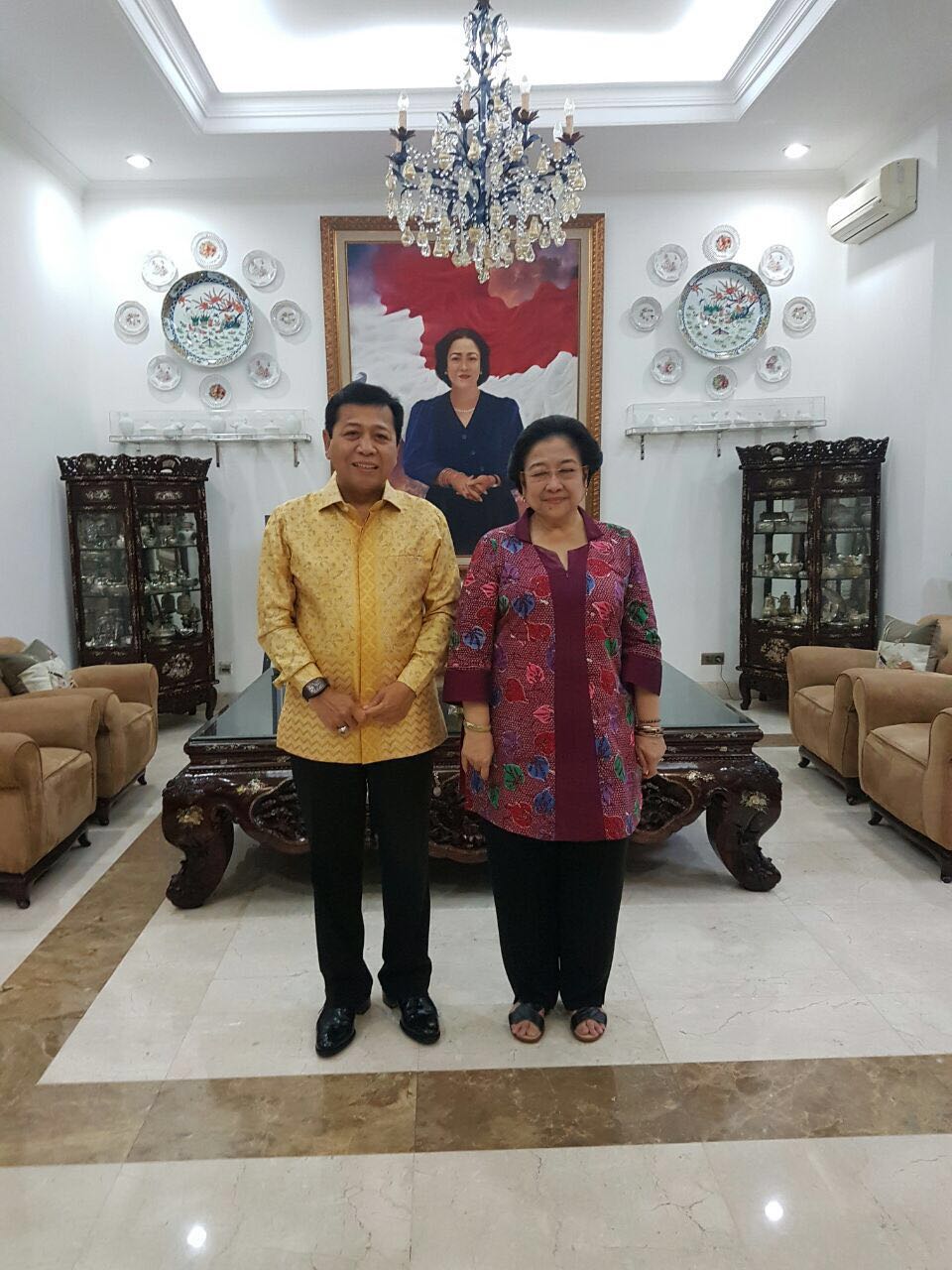 Ketua Umum Partai Golkar Setya Novanto (kiri) saat menemui Ketua Umum PDIP Megawati Soekarnoputri di kediamannya di Jalan Teuku Umar No. 27, Jakarta Pusat, Minggu (20/11). Pertemuan tersebut membahas seputar situasi politik nasional, di antaranya susasana pertarungan para pasangan calon dalam Pilgub DKI 2017. AKTUAL/HO