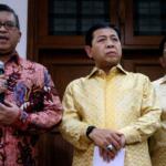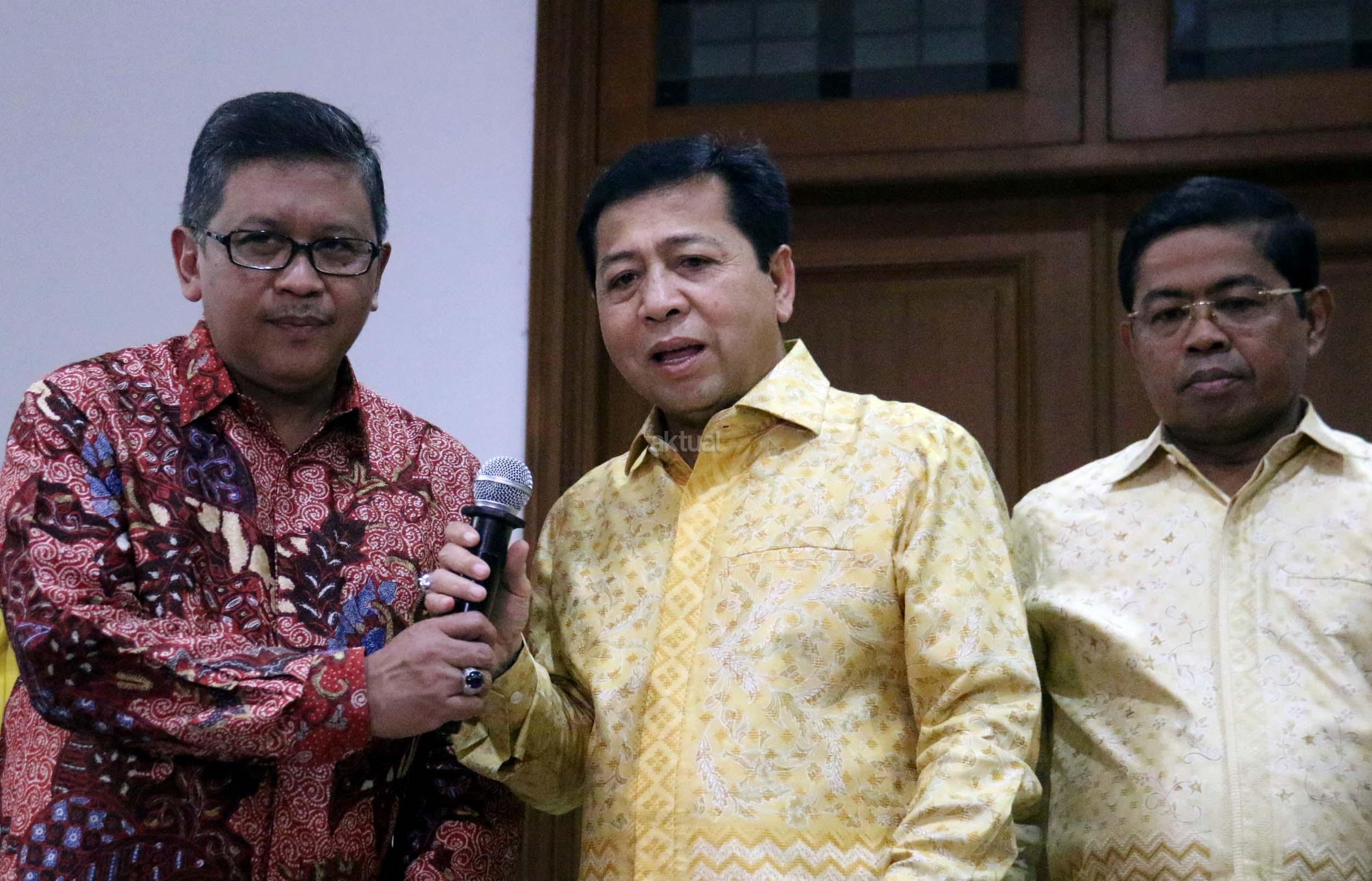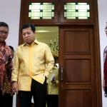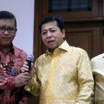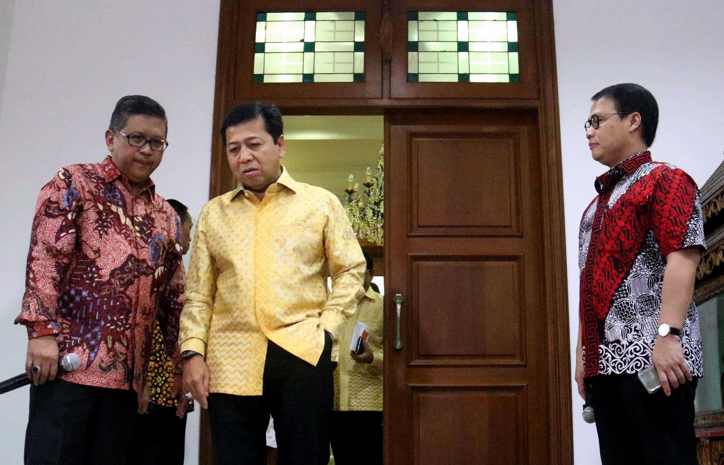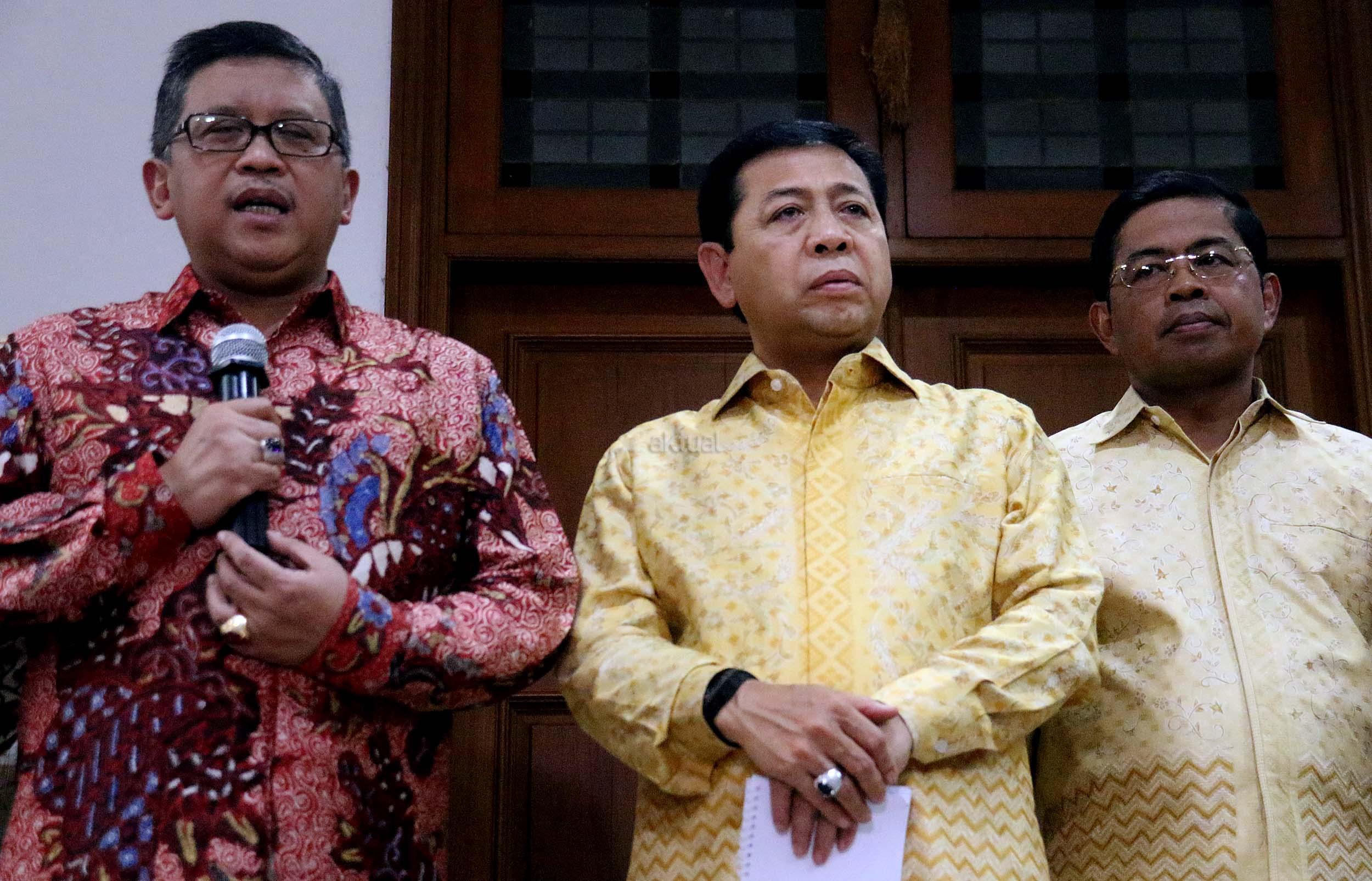 Kiri-kanan ; Sekjen DPP PDIP Hasto Kristiyanto, Ketua Umum Partai Golkas Setya Novanto, Sekjen Partai Golkar Idrus Marham, memberikan keterangan persnya usai melakukan pertemuan di rumah Ketua Umum PDIP Megawati Seokarnoputri di Jalan. Teuku Umar, Jakarta Pusat, Minggu (20/11/2016). Pertemuan tersebut membahas seputar situasi politik nasional, di antaranya susasana pertarungan para pasangan calon dalam Pilgub DKI 2017. AKTUAL/Munzir