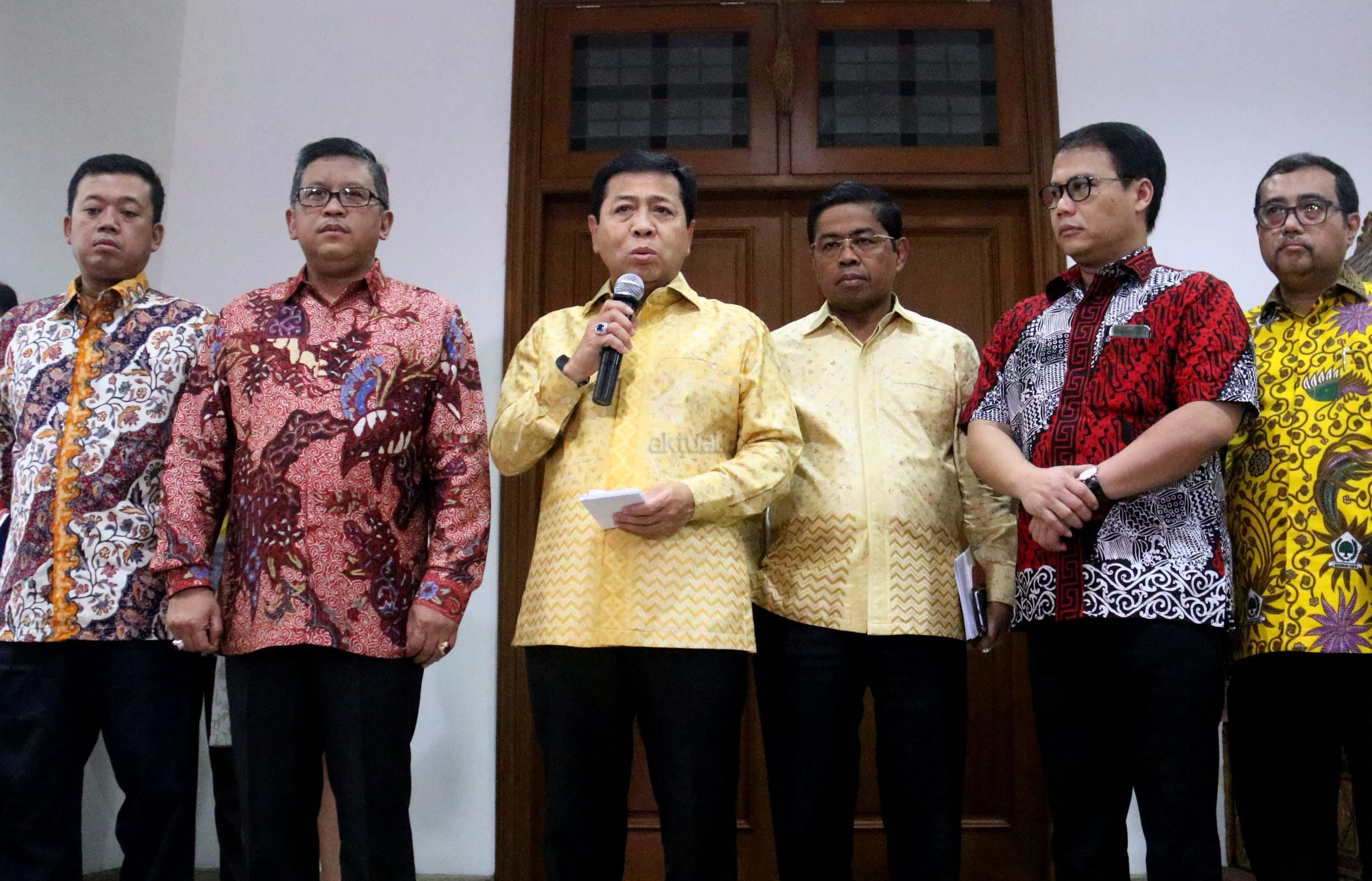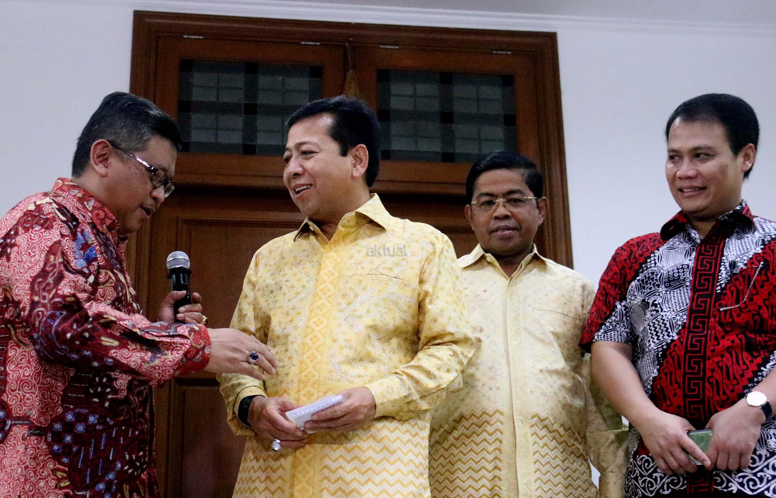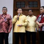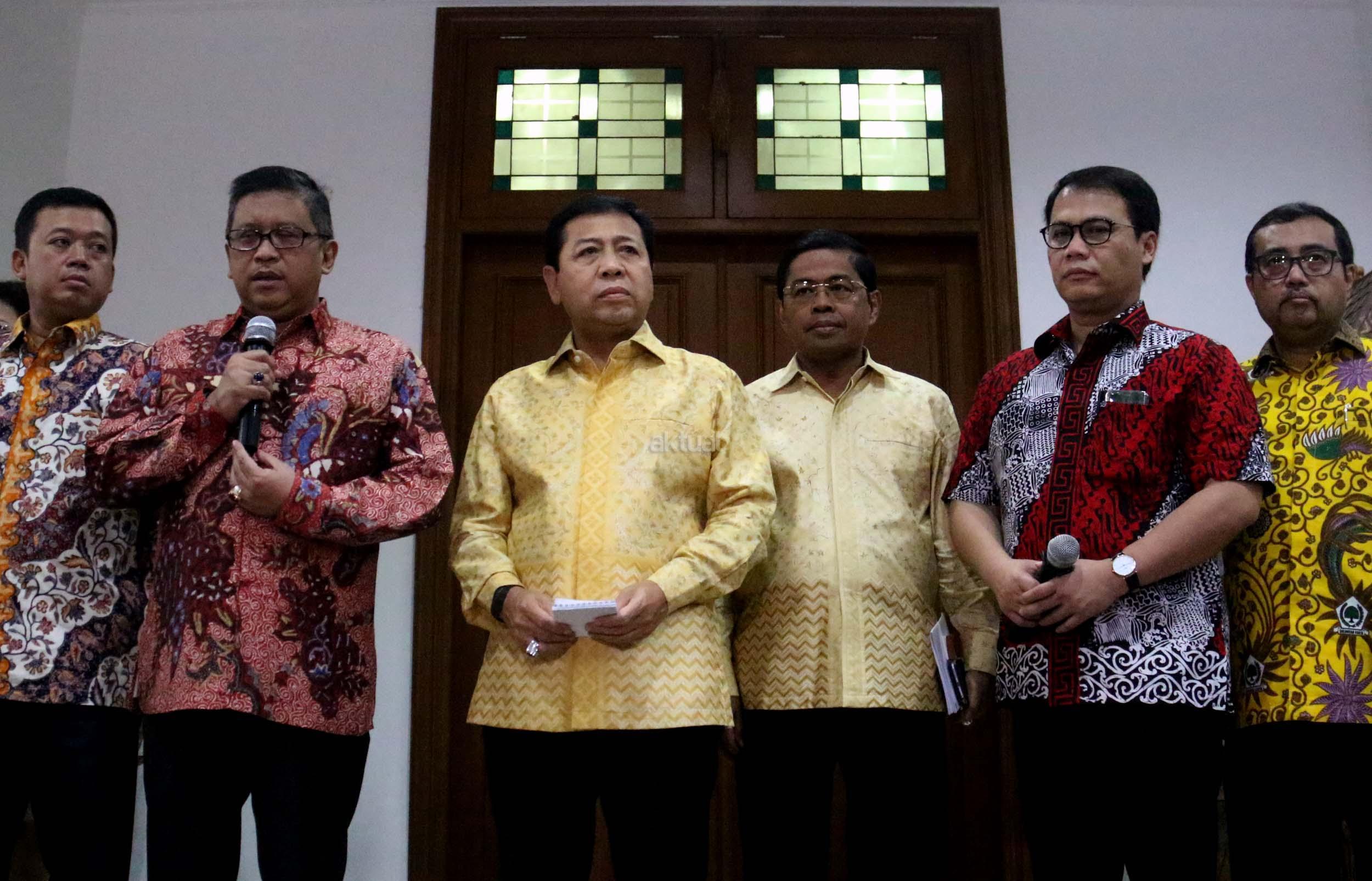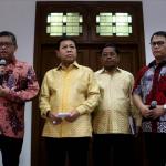 Kiri-kanan ; Sekjen DPP PDIP Hasto Kristiyanto, Ketua Umum Partai Golkas Setya Novanto, Sekjen Partai Golkar Idrus Marham, Wakil Sekjen DPP PDIP Ahmad Basarah, memberikan keterangan persnya usai melakukan pertemuan di rumah Ketua Umum PDIP Megawati Seokarnoputri di Jalan. Teuku Umar, Jakarta Pusat, Minggu (20/11/2016). Pertemuan tersebut membahas seputar situasi politik nasional, di antaranya susasana pertarungan para pasangan calon dalam Pilgub DKI 2017. AKTUAL/Munzir