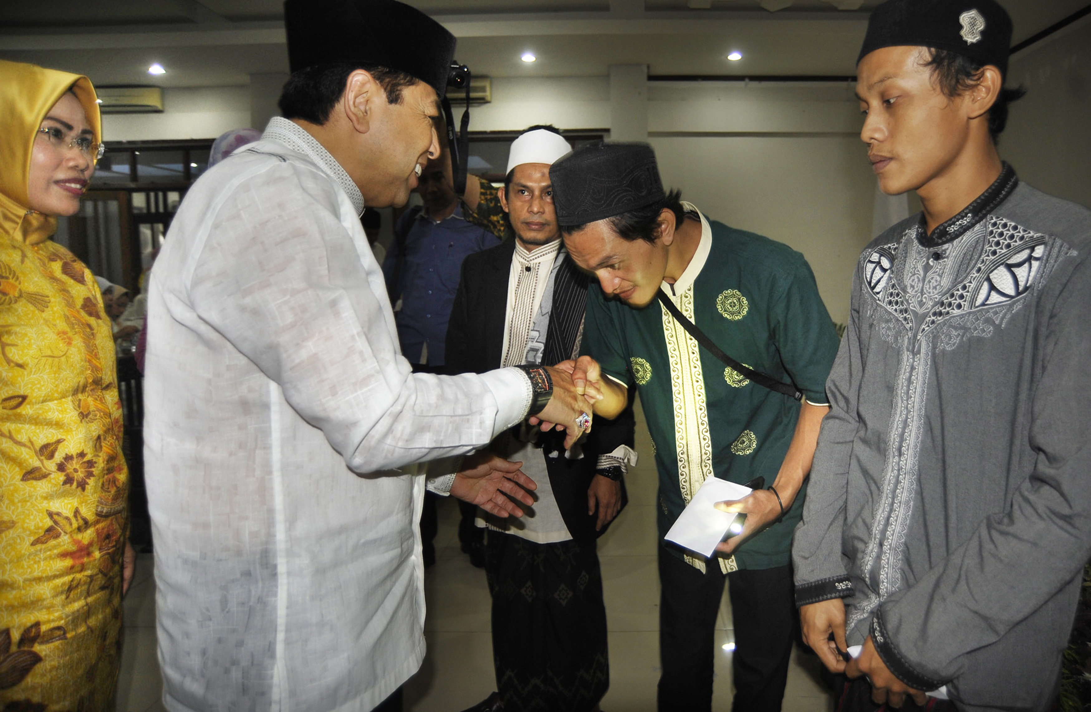 Ketua Umum Partai Golkar Setya Novanto (kedua kiri) didampingi Ketua DPD Golkar Banten Tatu Chasanah (kiri) menyerahkan santunan untuk tiga orang Hafidz (Penghapal) Alquran di Serang, Minggu (26/6). Acara tersebut merupakan bagian dari agenda Safari Ramadan Setya Novanto ke daerah-daerah. ANTARA FOTO/Asep Fathulrahman/pd/16