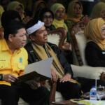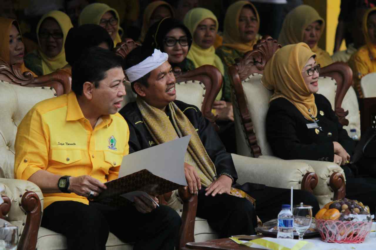 Ketua Umum Partai Golkar Setya Novanto (kiri) bersama Bupati Purwakarta Dedi Mulyadi (tengah) dan Bupati Indramayu Anna Sophanah (kanan) menghadiri Temu Kader Golkar di Indramayu, Jawa Barat, Jumat (29/7). Setya Novanto menemui Kader Partai Golkar untuk memberikan semangat dalam mendukung pemerintahan Presiden Joko Widodo. ANTARA FOTO/Dedhez Anggara/aww/16.