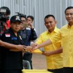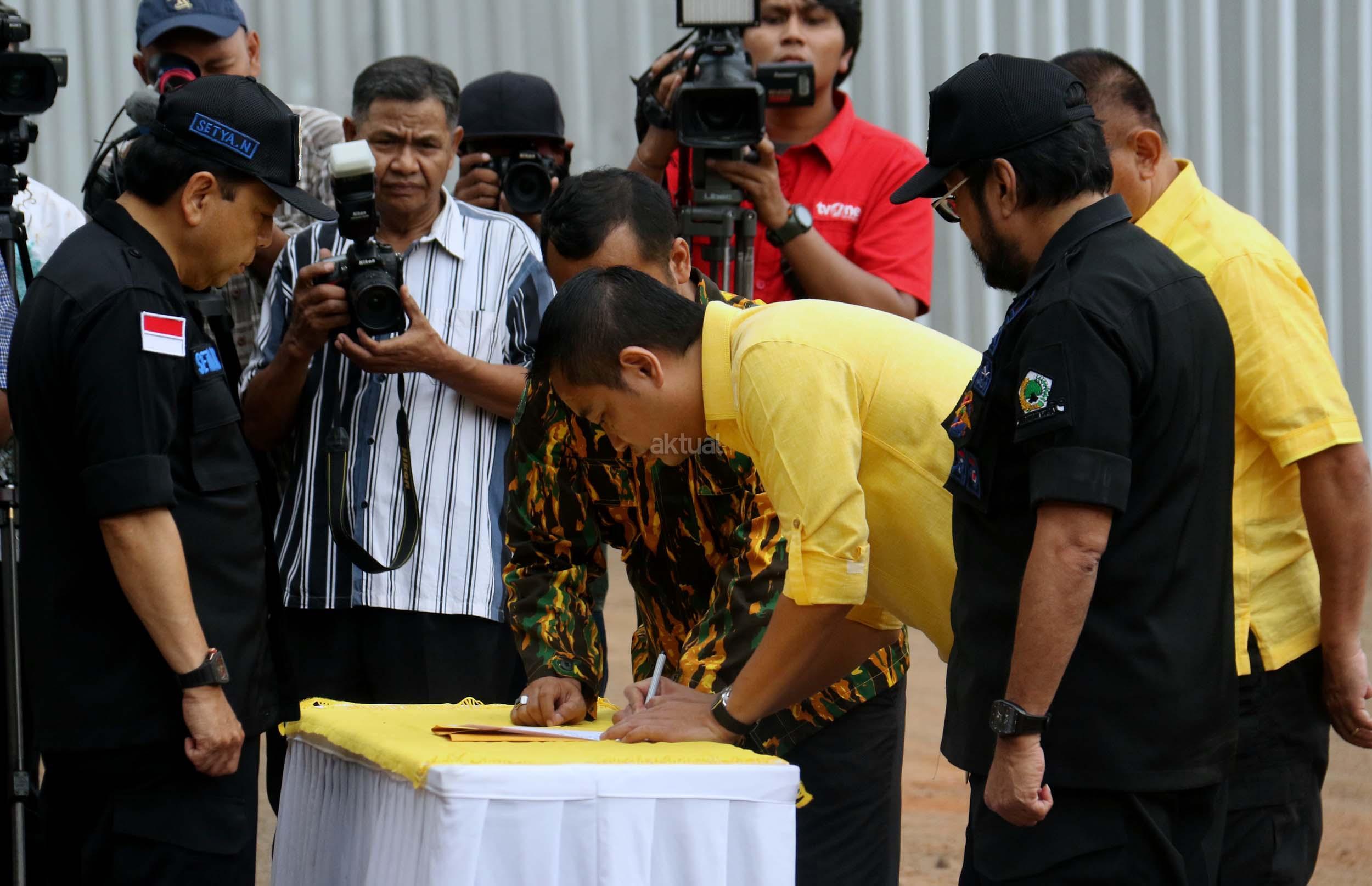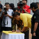Ketua DPD Golkar DKI Jakarta Fayakhun Andriadi menanda tangani berkas penyerahan Satsus Brigade Beringin kepada Ketua Umum Partai Golkar Setya Novanto di halaman kantor DPP Partai Golkar, Jakarta, Jumat (10/3/2017). DPD Golkar DKI Jakarta menyerahkan 215 anggota Satsus Brigade Beringin kepada Ketua Umum Partai Golkar usai mengikuti pelatihan Kesamaptaan dan Bela Negara yang berlangsung 28 Januari 10 Februari 2017 lalu. AKTUAL/Munzir