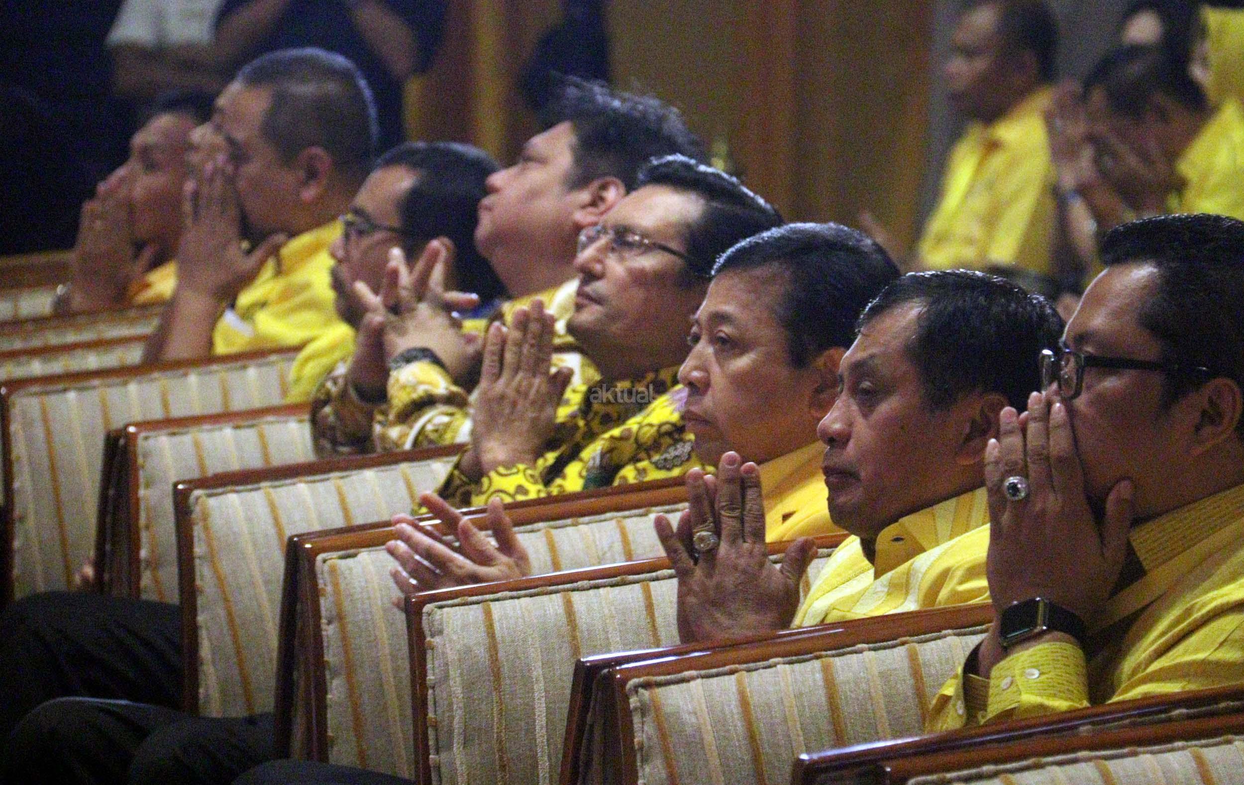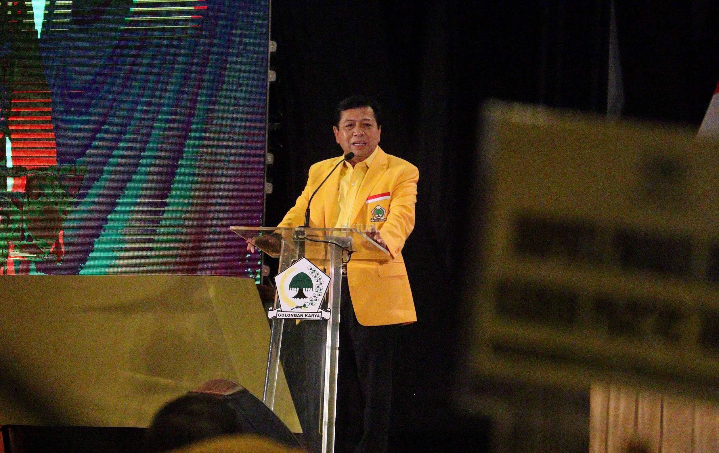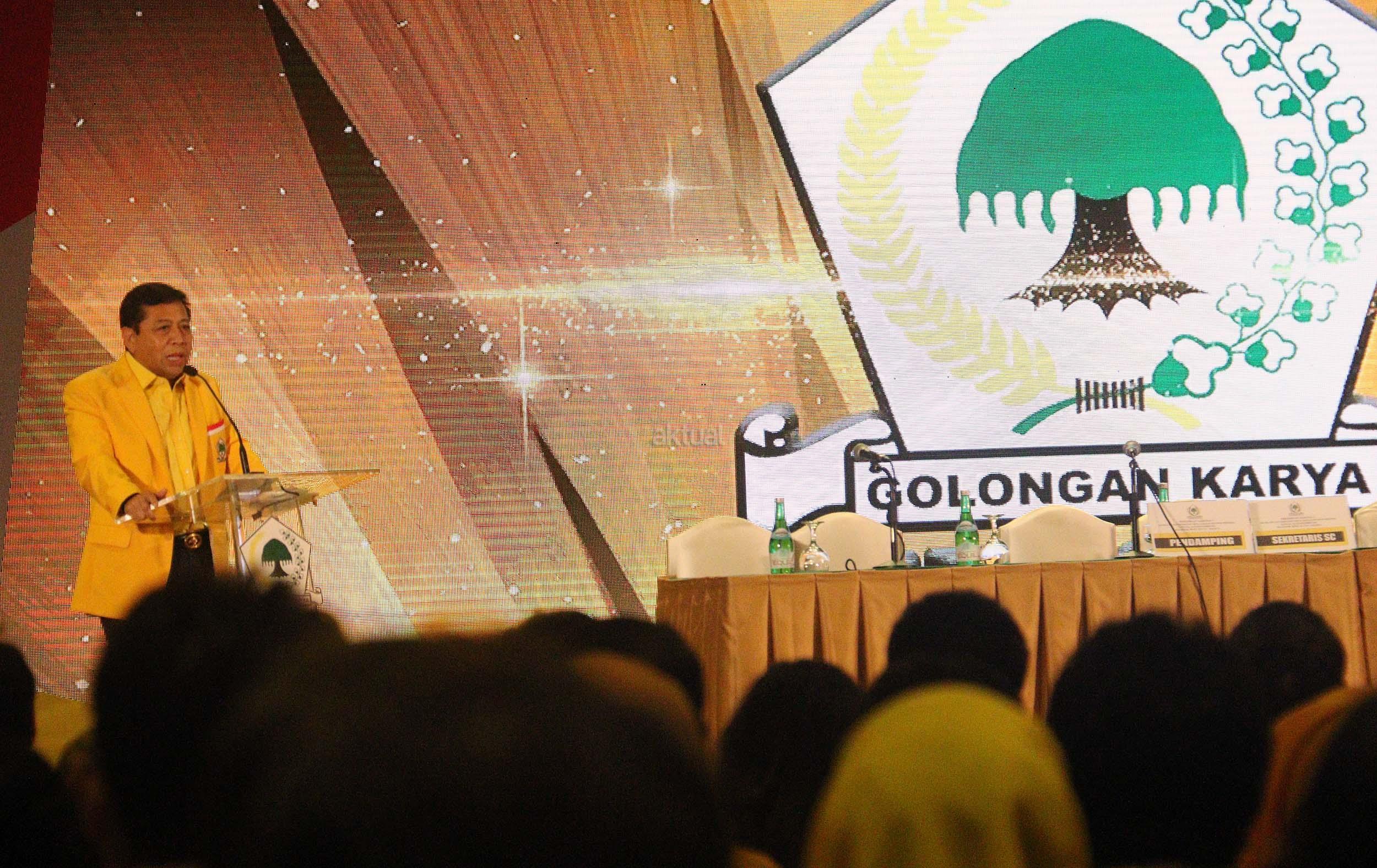 Ketua Umum Partai Golkar Setya Novanto memberikan pidato pengarahannya dan sekaligus menutup acara Pertemuan Nasional Eksekutif dan Legislatif Partai Golkar di Jakarta, Selasa (27/9/2016). Dalam pertemuan yang digelar dua hari tersebut, Partai Golkar mengeluarkan lima rekomendasi.