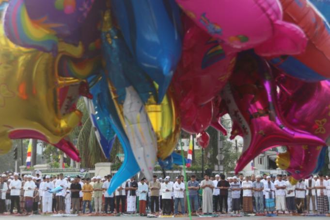 Sejumlah warga muslim di Jakarta melaksanakan Salat Idul Adha di Monumen Perjuangan Jatinegara, Jakarta Timur, Rabu (22/8/2018). Umat Islam memperi gati Idul Adha dengan menyembelih hewan kurban seperti sapi, kambing, unta, biri-biri, ataupun domba. Orang yang berkurban adalah orang yang ingin mendekatkan dirinya kepada Allah SWT sekaligus mendekatkan dirinya kepada sesama manusia. AKTUAL/Tino Oktaviano