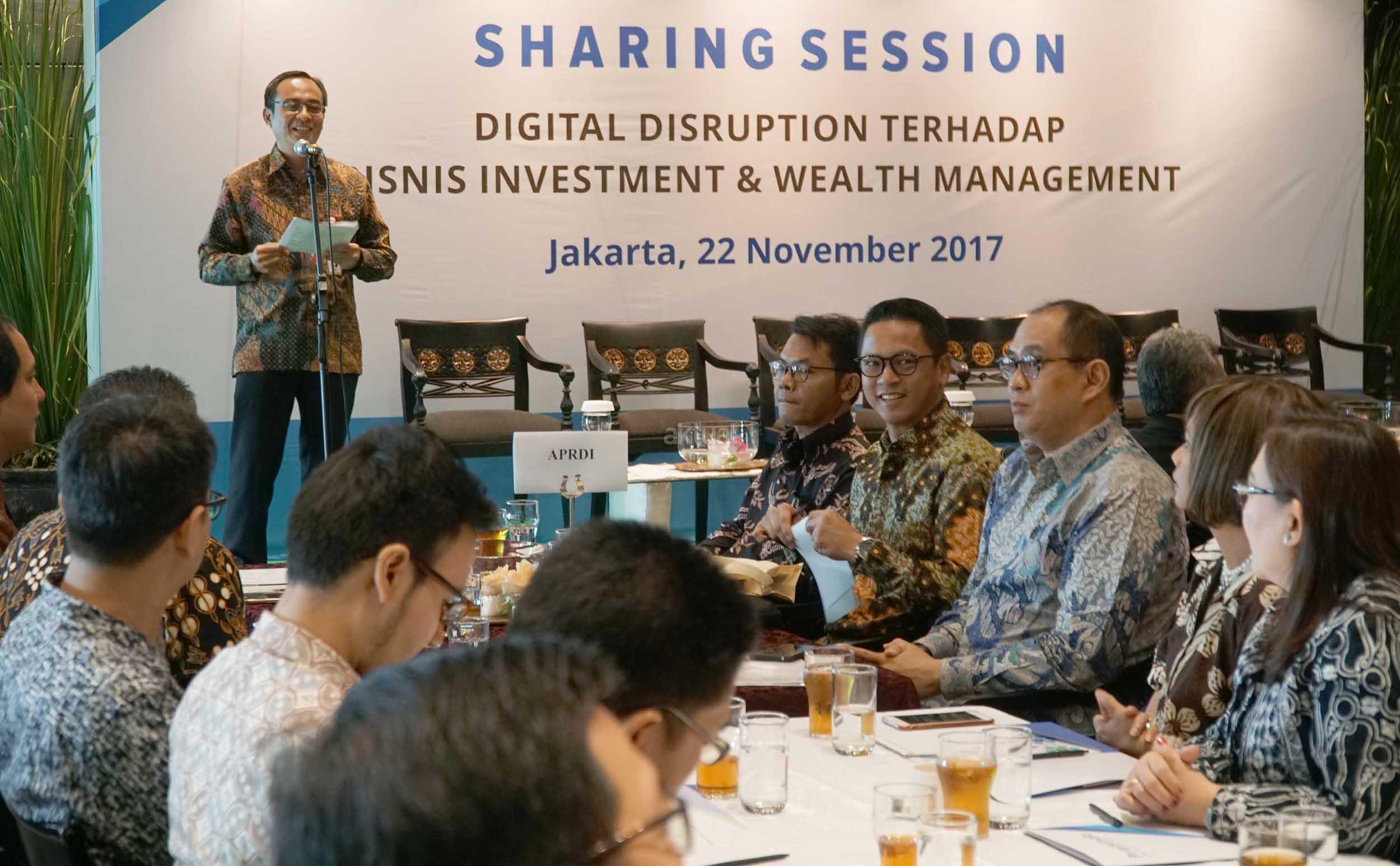 Direktur Pengelola Investasi OJK, Sujanto saat menjadi keynote speech disela kegiatan sharing session kerjasama APRDI dengan Praisindo di Jakarta, Rabu (22/11). Kegiatan bertajuk ” Digital Disruption terhadap Bisnis Investment & Wealth Management” mengundang sekitar 50 klien yang terdiri dari Bank dan Manager Investasi. AKTUAL/Eko S Hilman