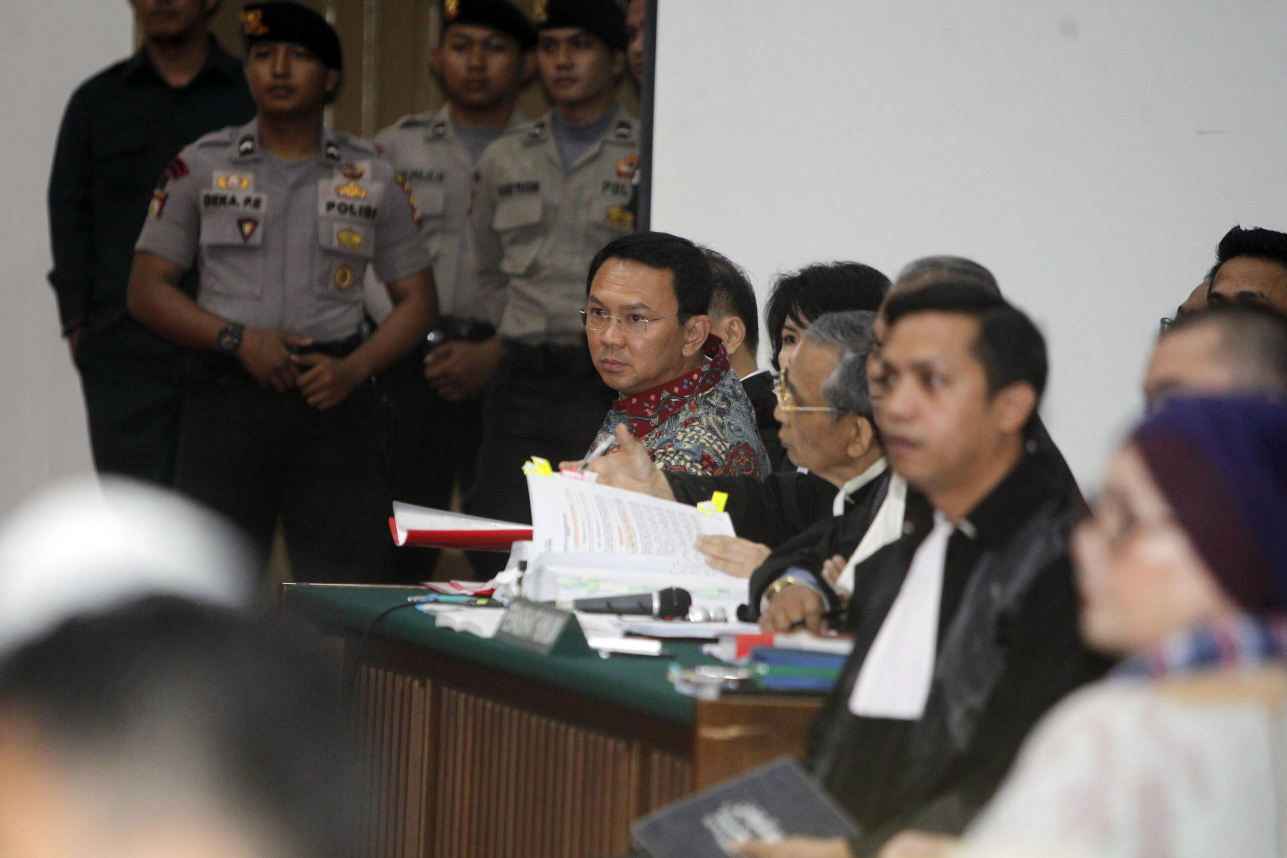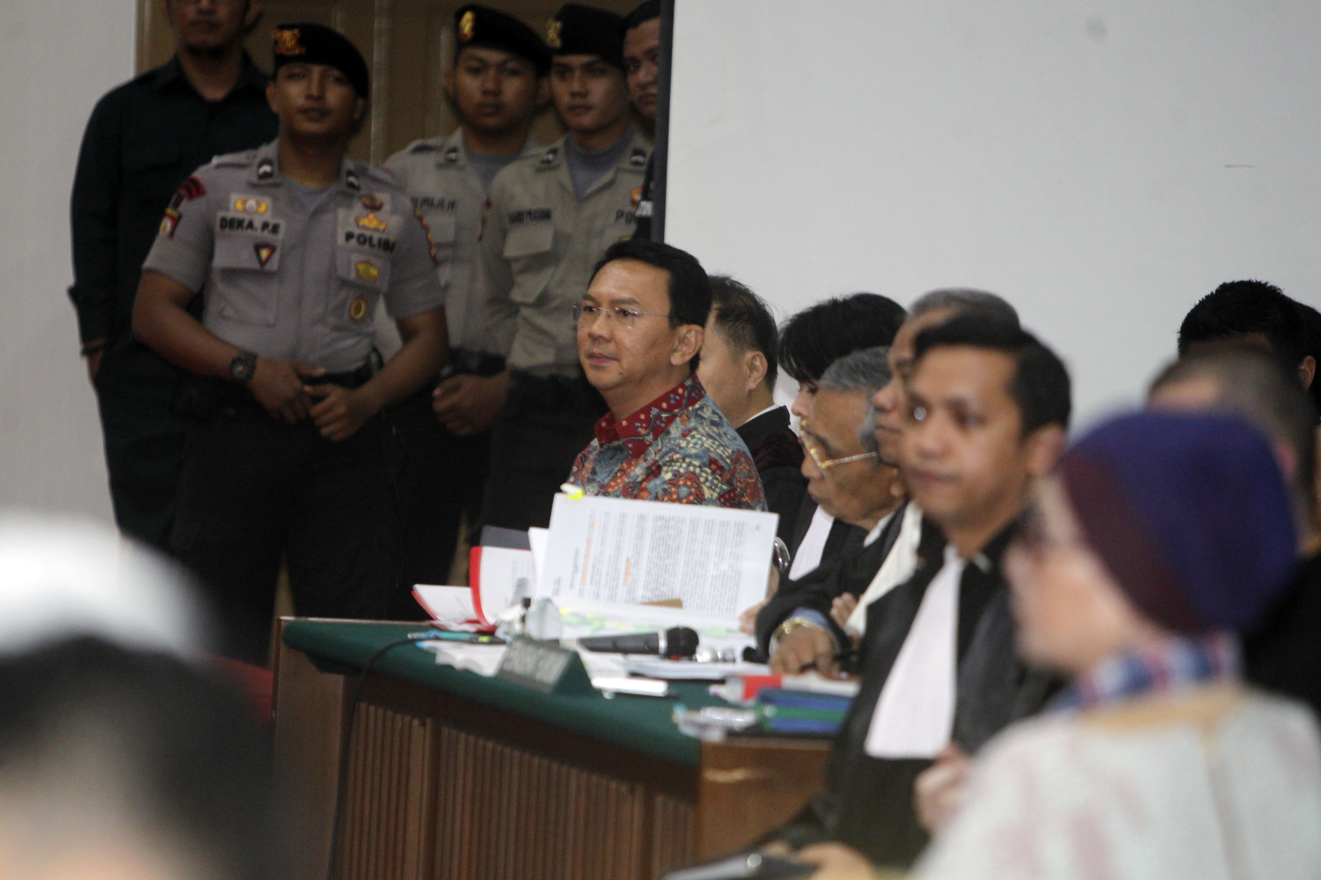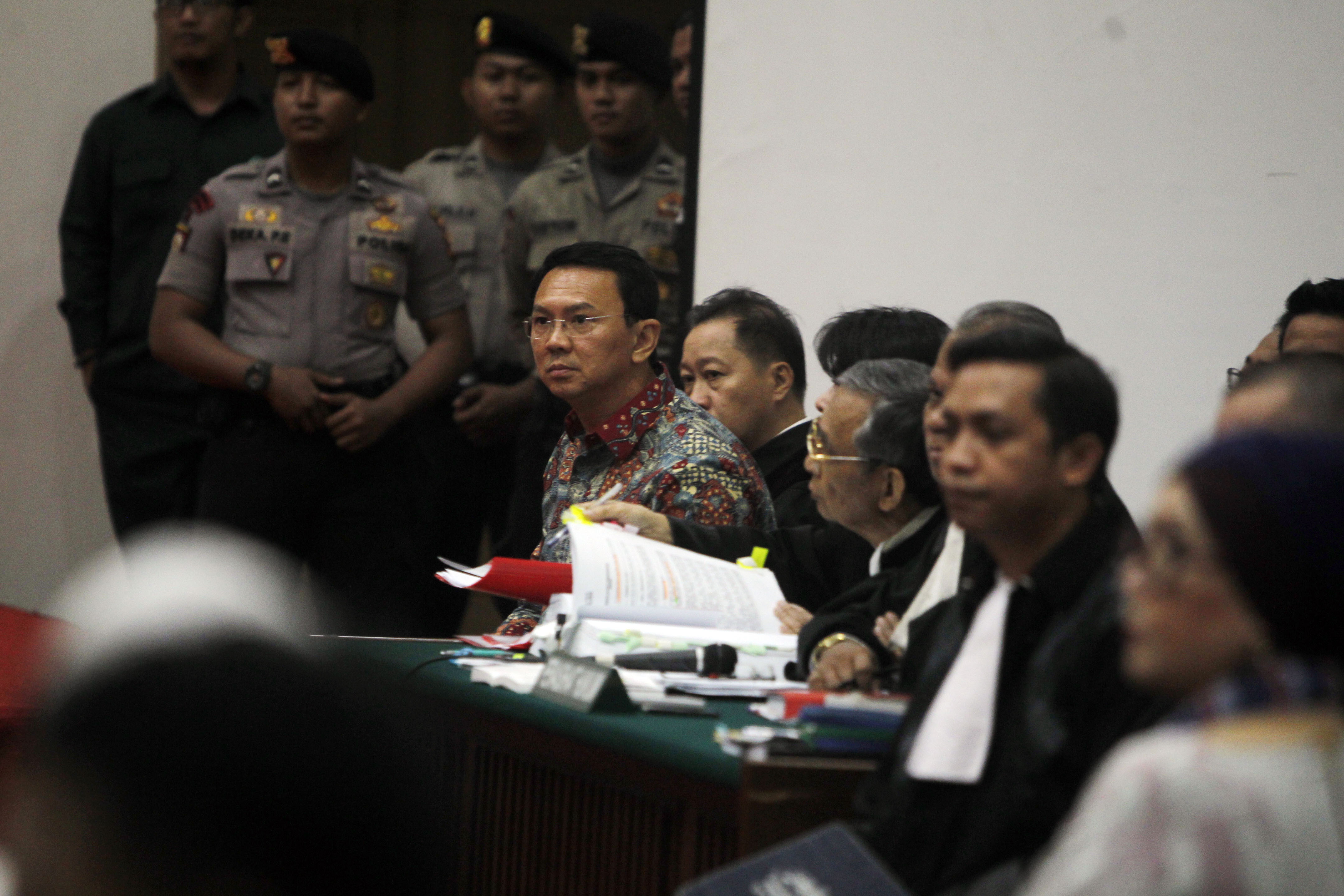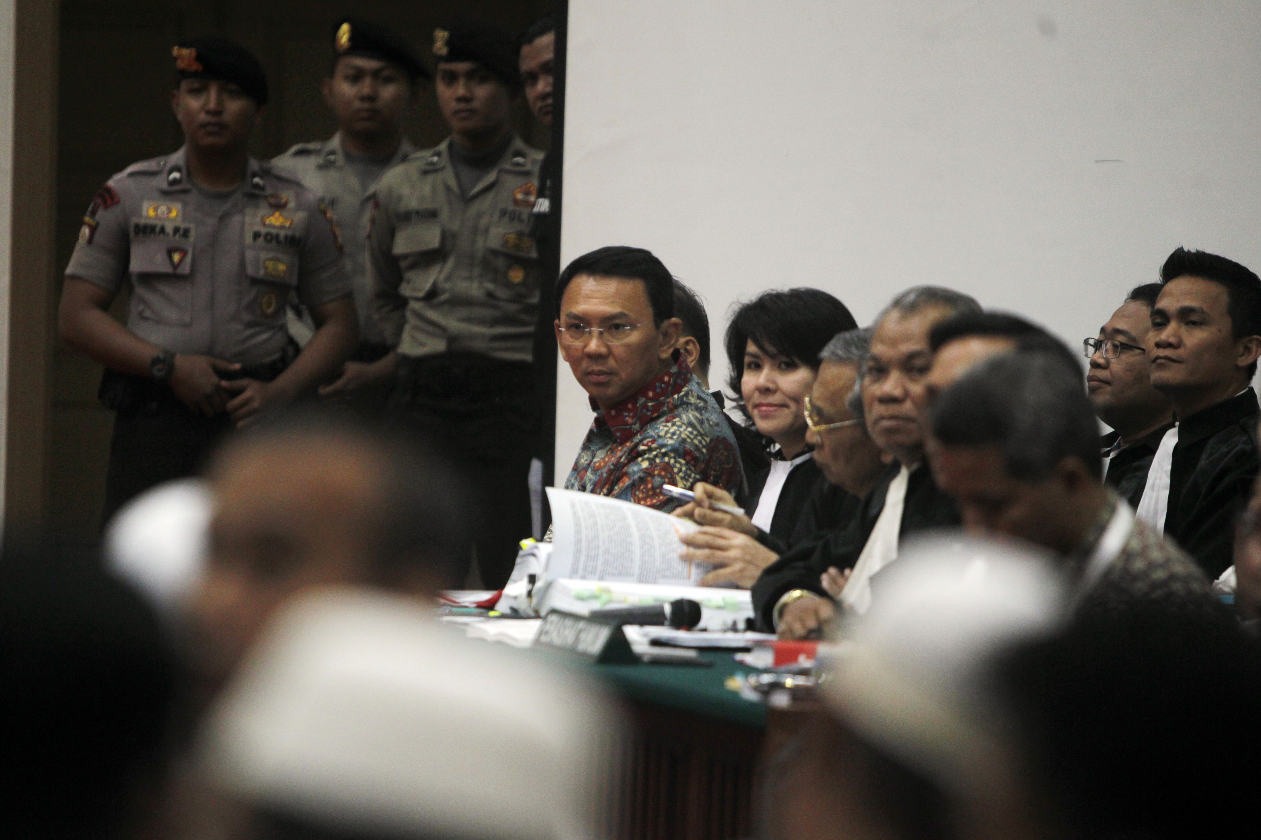 Terdakwa kasus penistaan agama Gubernur DKI Jakarta non aktif Basuki Tjahaja Purnama atau Ahok kembali menjalani persidangan ke-9 yang digelar Pengadilan Negeri Jakarta Utara (PN Jakut) di ruang sidang di Auditorium Kementan, Jakarta. Selasa (7/2/17). Persidangan kali ini beragendakan mendengarkan keterangan dua saksi fakta dan satu saksi ahli dari MUI. Foto/sindonews.com-Pool/Isra TriansyahPersidangan kali ini beragendakan mendengarkan keterangan dua saksi fakta dan satu saksi ahli dari MUI