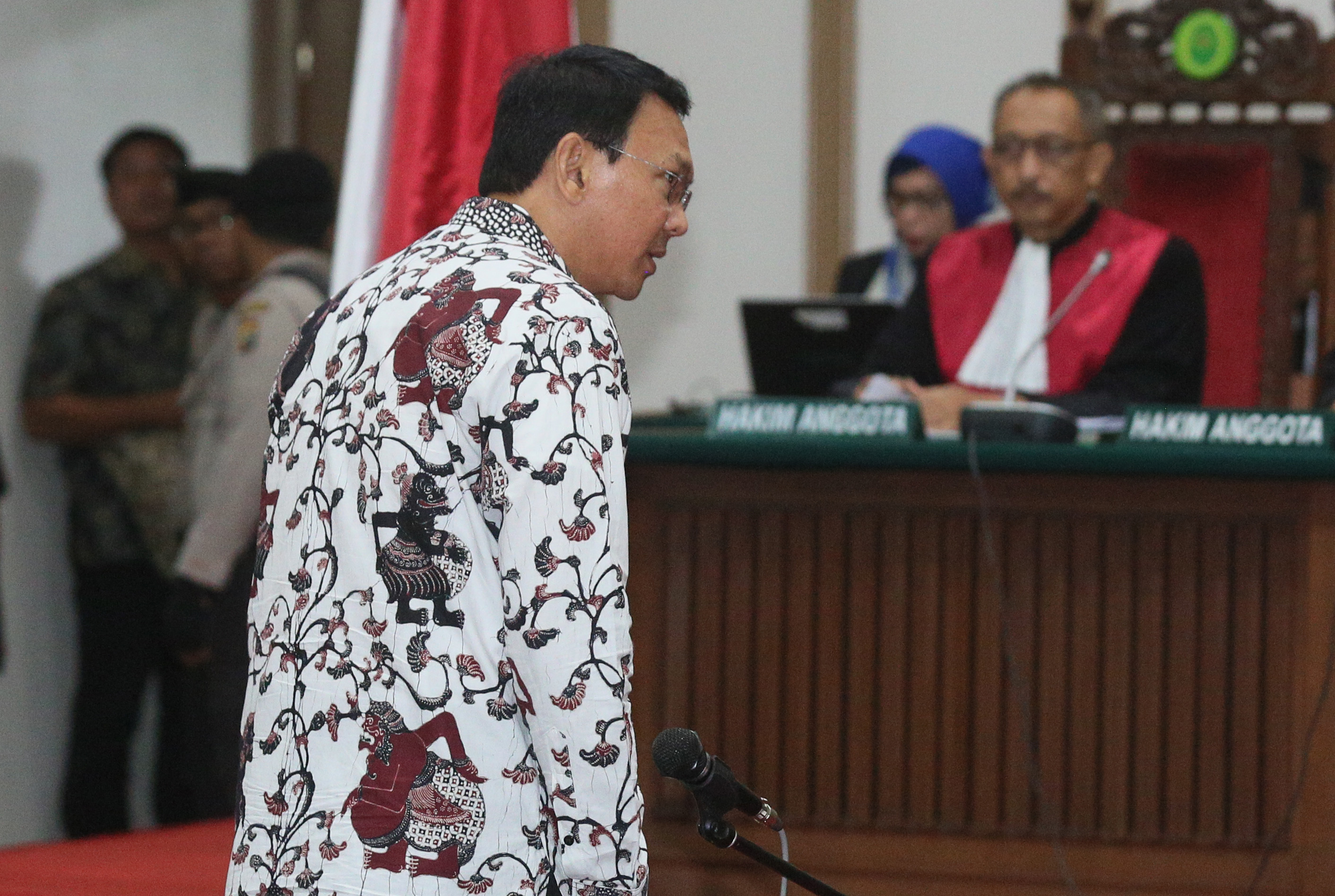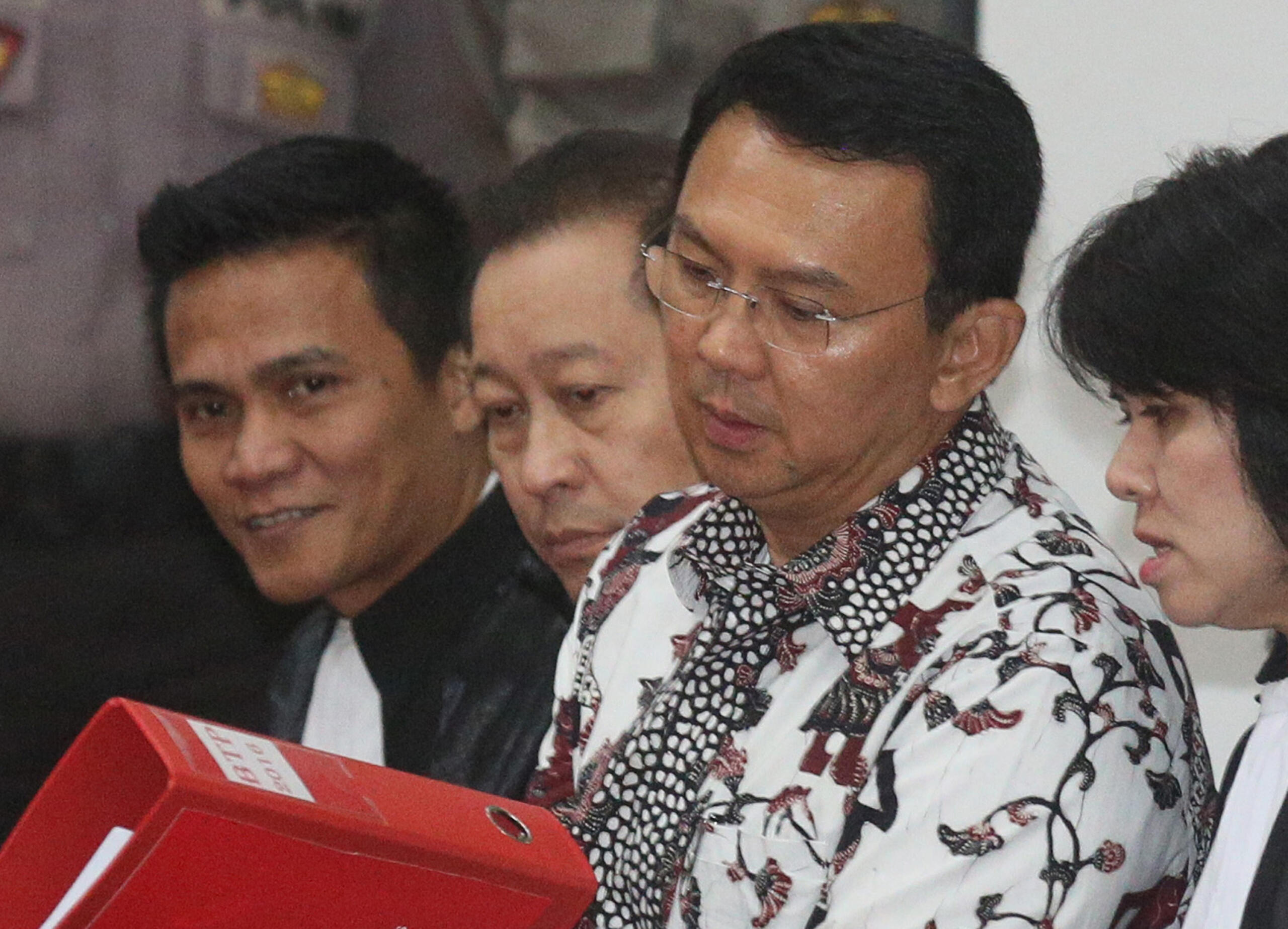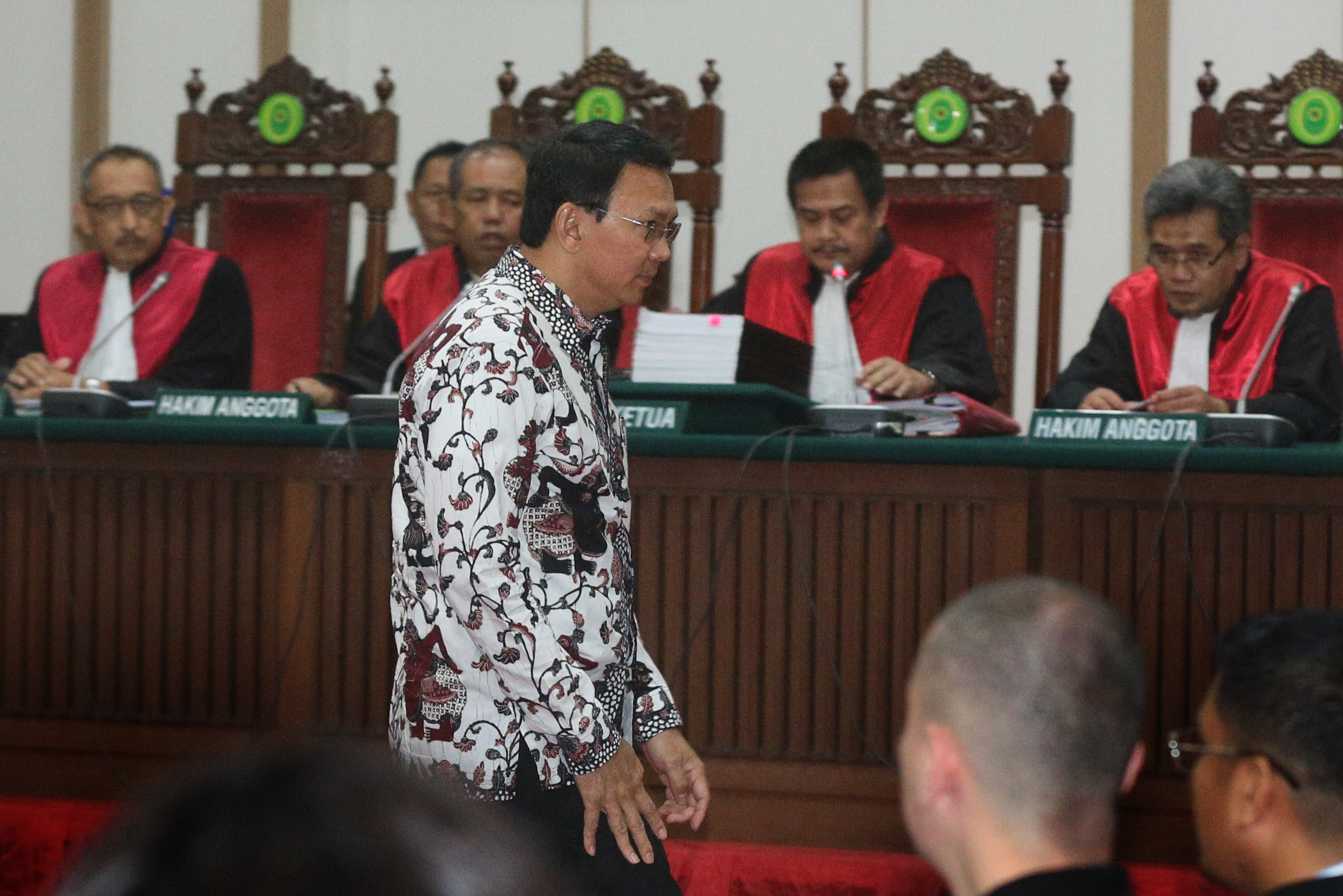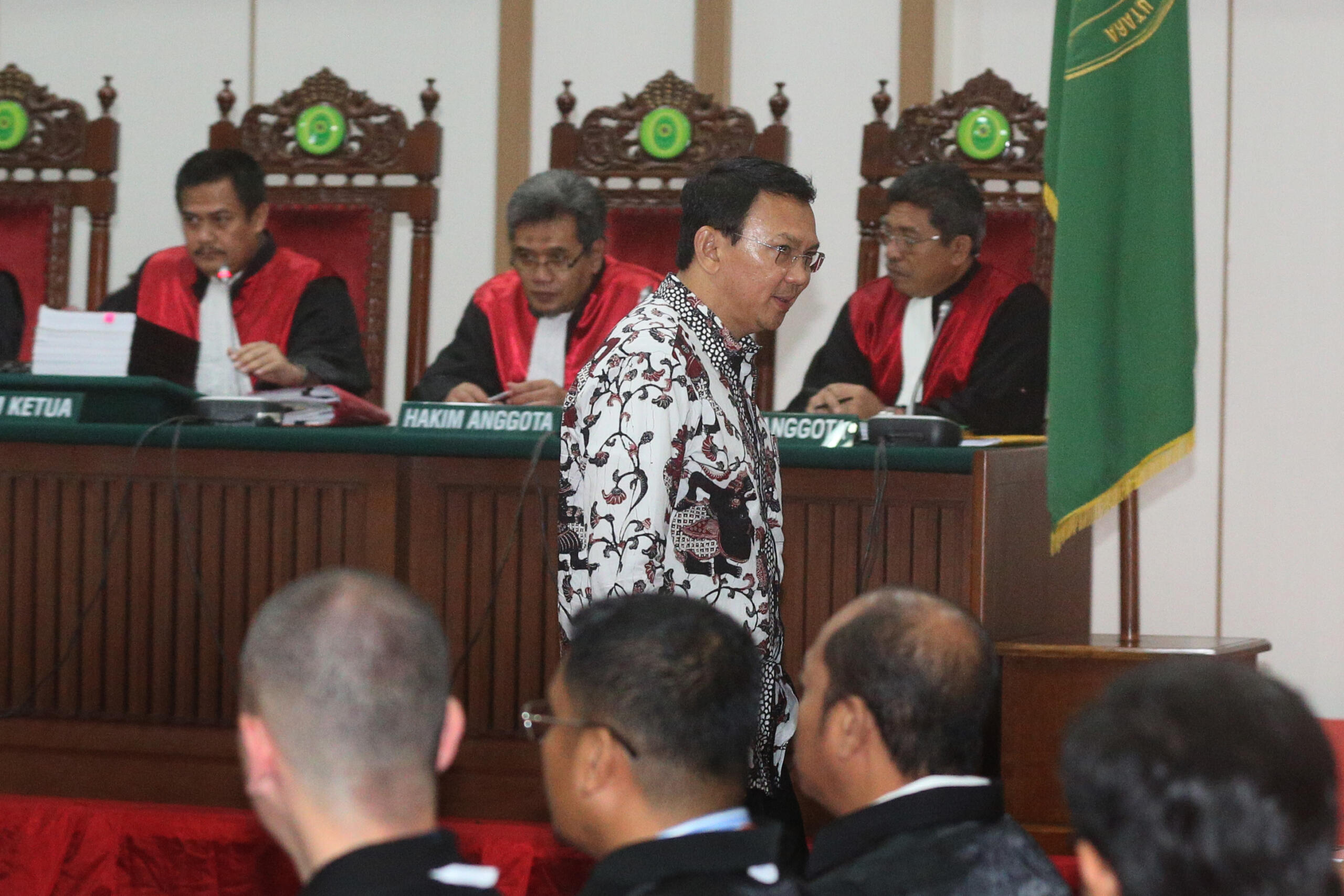 Terdakwa kasus dugaan penistaan Agama Basuki Tjahaja Purnama atau Ahok memasuki ruang sidang di Auditorium Kementerian Pertanian, Jakarta, Senin (13/2). Dalam sidang ke-10 kasus penitasan agama tersebut Jaksa Penuntut Umum rencananya menghadirkan 4 saksi ahli. Media Indonesia-Pool/RAMDANI