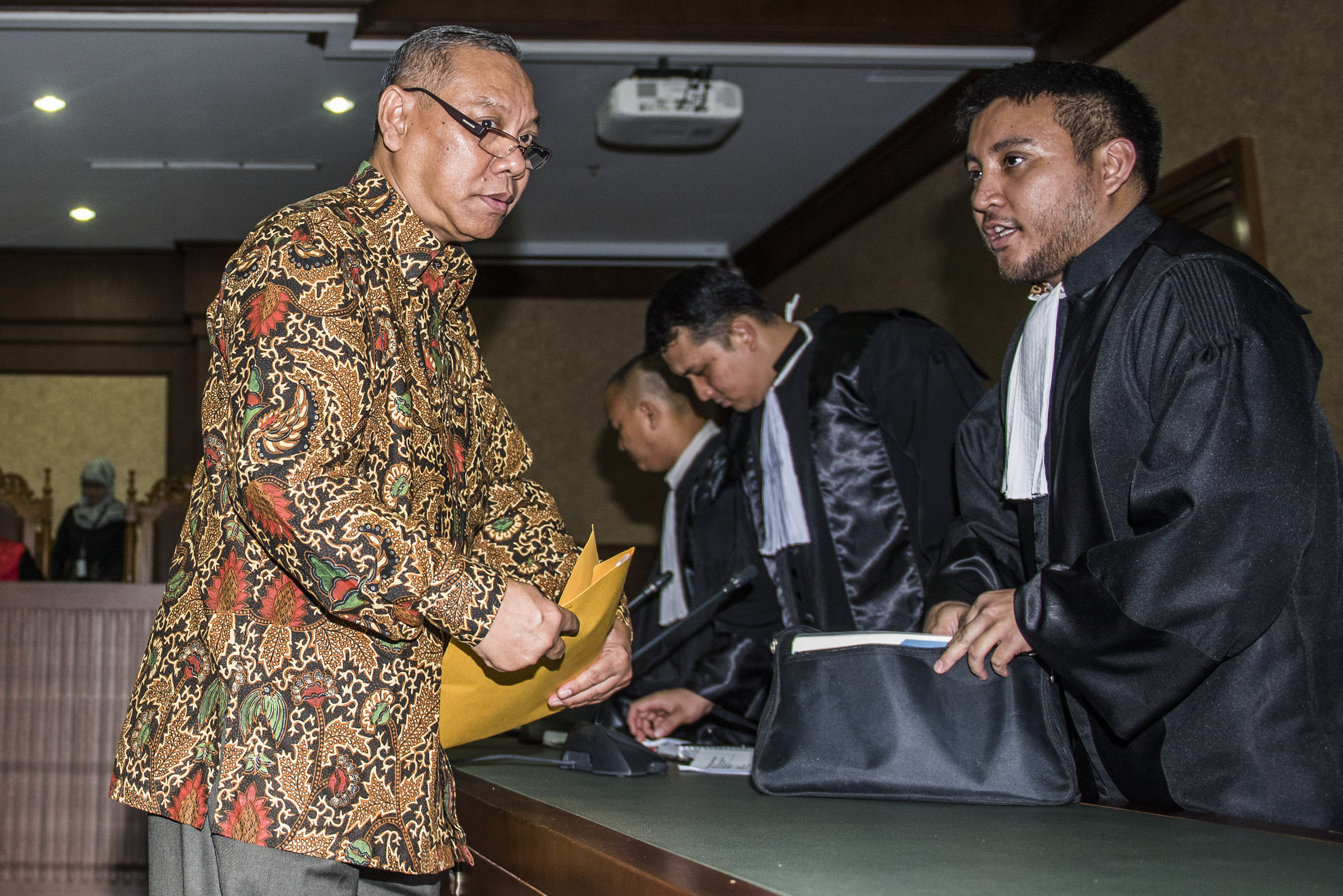 Terdakwa kasus dugaan pemberian suap penanganan peninjauan kembali (PK) terhadap Pengadilan Negeri Jakarta Pusat Doddy Aryanto berbincang dengan kuasa hukumnya seusai menjalani sidang lanjutan dengan agenda pembacaan eksepsi atau atau nota keberatan di Pengadilan Tipikor, Jakarta, Senin (11/7). Doddy Aryanto membantah segala dakwaan jaksa penuntut umum (JPU) yang ditujukan kepadanya. ANTARA FOTO/M Agung Rajasa/Spt/16