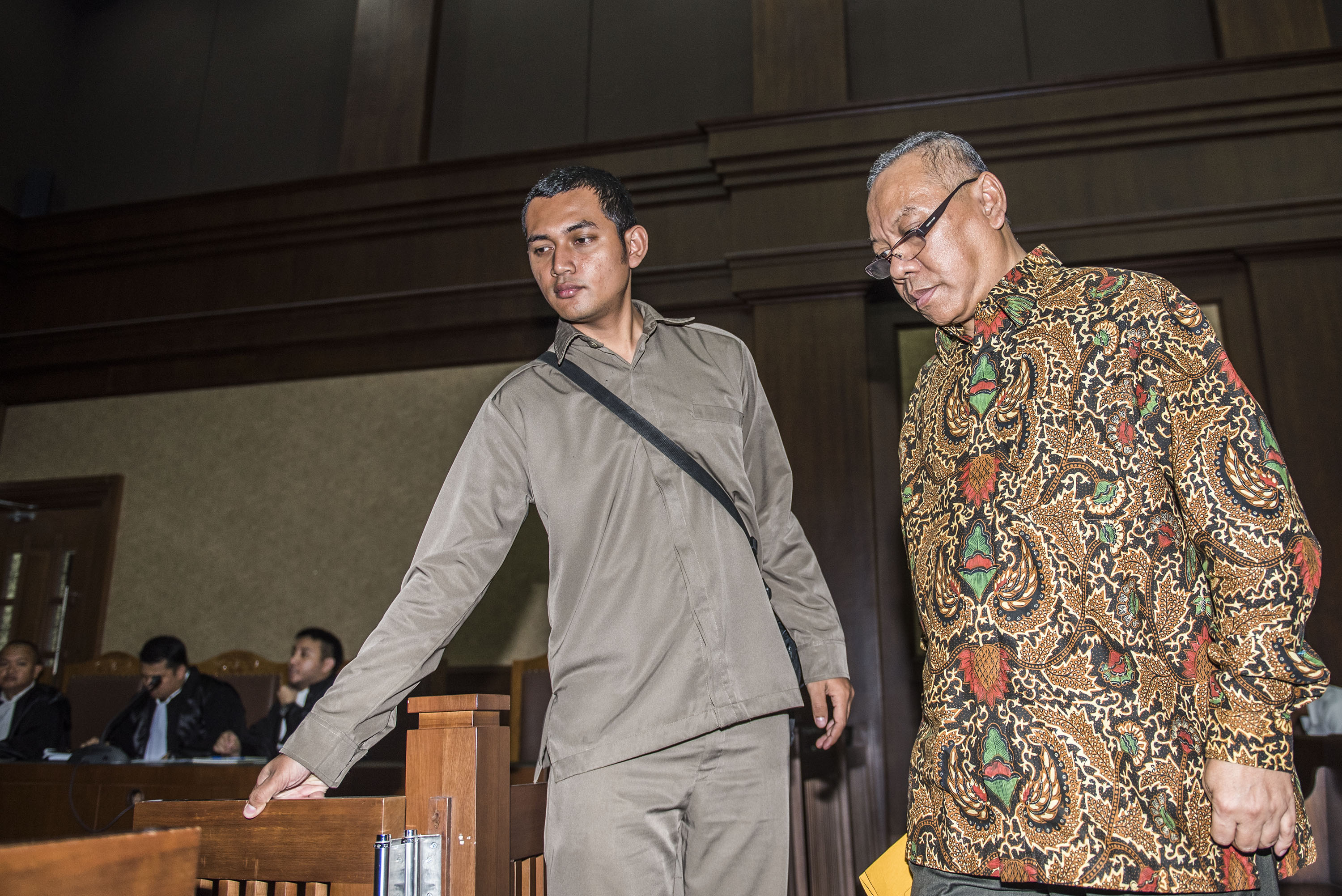 Terdakwa kasus dugaan pemberian suap penanganan peninjauan kembali (PK) terhadap Pengadilan Negeri Jakarta Pusat Doddy Aryanto (kanan) berjalan keluar ruang sidang seusai menjalani sidang lanjutan dengan agenda pembacaan eksepsi atau atau nota keberatan di Pengadilan Tipikor, Jakarta, Senin (11/7). Doddy Aryanto membantah segala dakwaan jaksa penuntut umum (JPU) yang ditujukan kepadanya. ANTARA FOTO/M Agung Rajasa/Spt/16