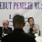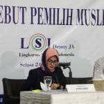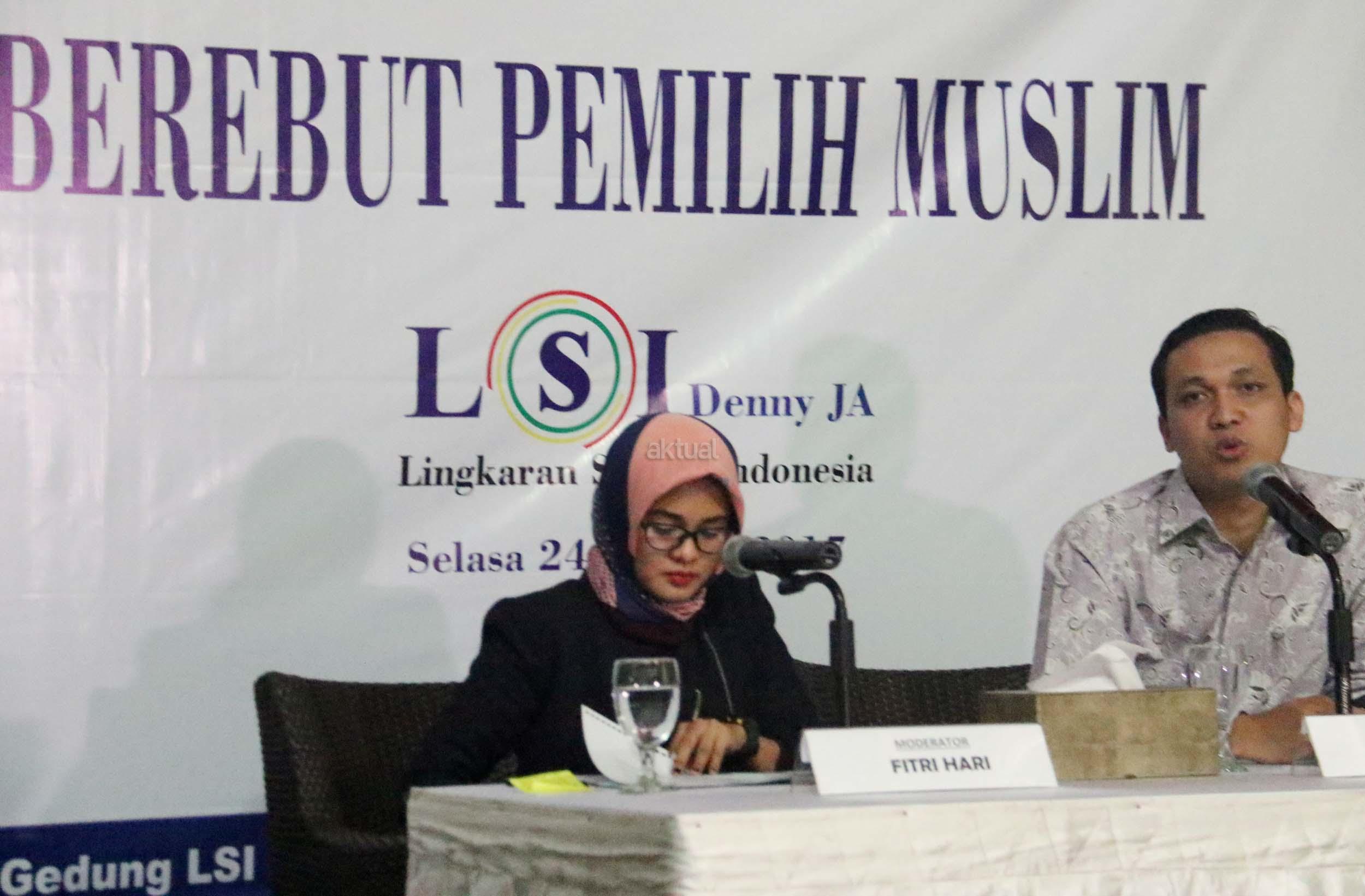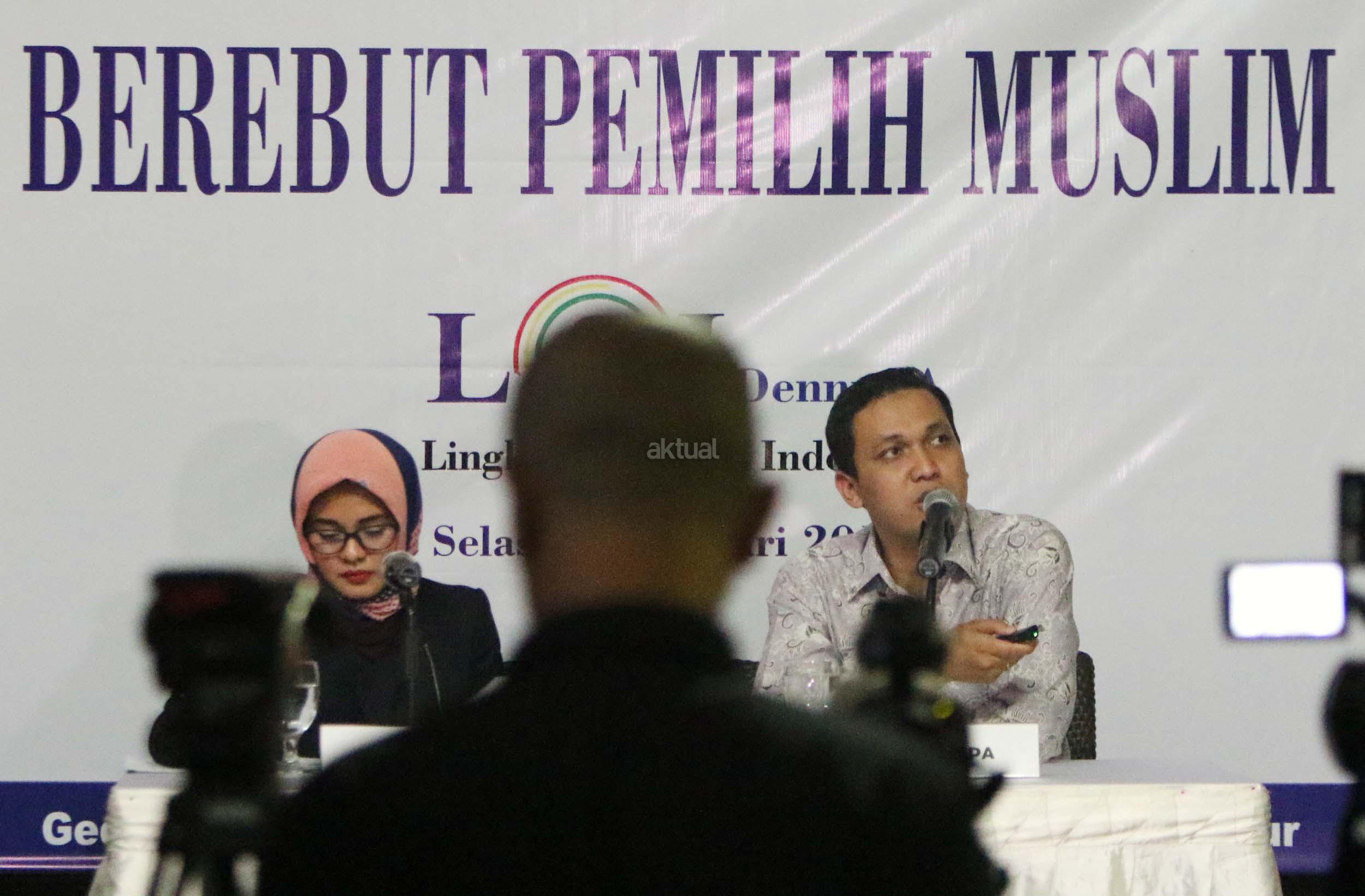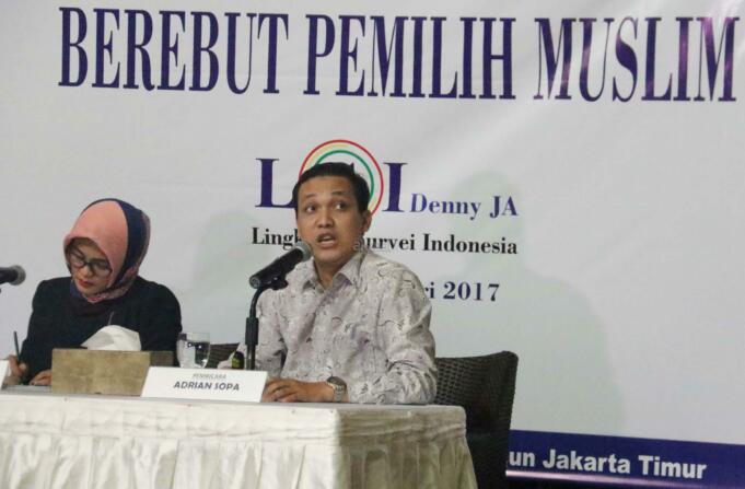 Peneliti Senior LSI Adrian Sopa (kanan) didampingi Peneliti LSI Fitri Hari (kiri) saat menggelar jumpa pers terkait Berebut Pemilih Muslism, di Jakarta, Selasa (24/1/2017). Dalam hasil survie LSI- Denny JA, Ahok kehilangan banyak pemilih muslim akibat menjadi terdakwa penistaan agama, sehingga keberagaman Jakarta berada pada angka terendah dalam pilihan responden.