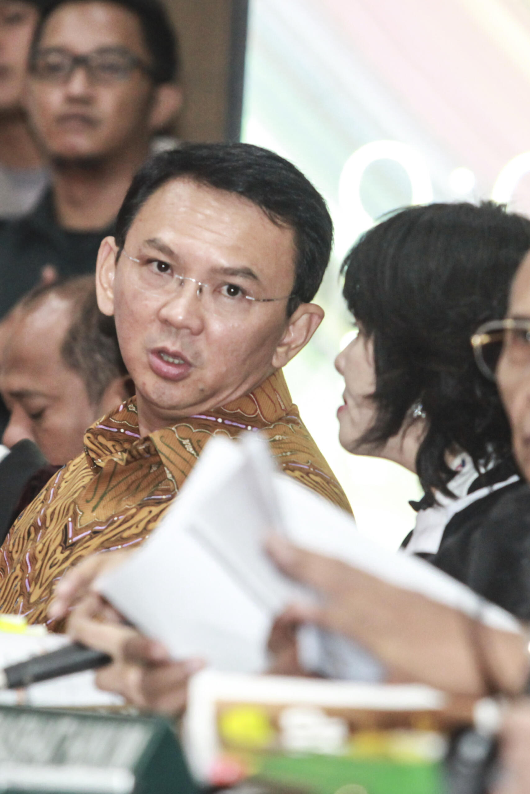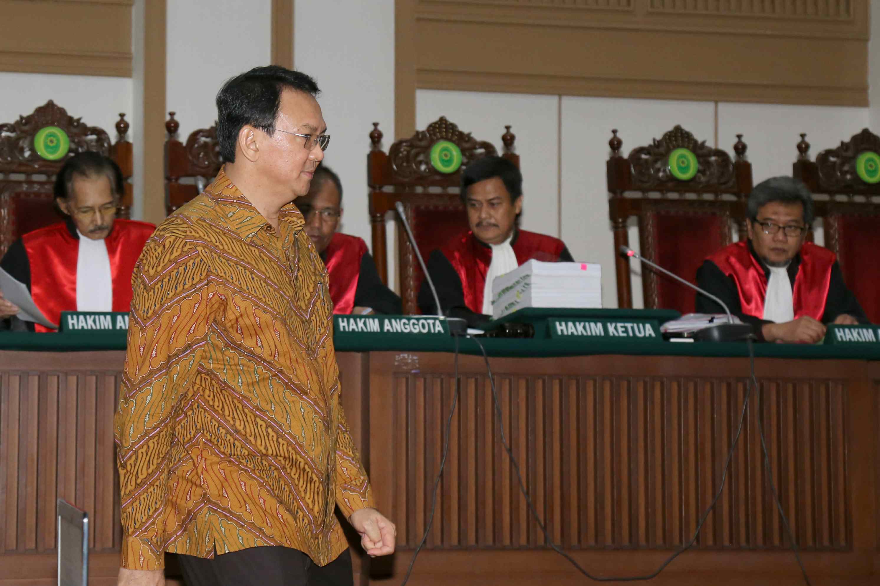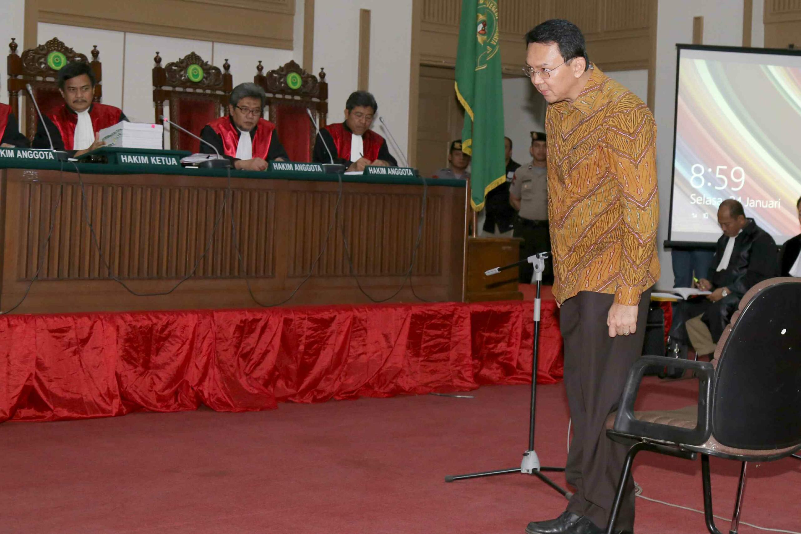 Gubernur nonaktif DKI Jakarta Basuki Tjahaja Purnama (Ahok) menjalani sidang lanjutan dugaan penistaan agama di Auditorium Kementerian Pertanian, Jakarta Selatan, Selasa (24/1). Pengadilan Negeri Jakarta Utara menggelar sidang kasus penistaan agama oleh Ahok dengan agenda mendengarkan lima keterangan saksi dari pihak Jaksa Penuntut Umum. Foto/aktual.com-Pool/Tino Oktaviano