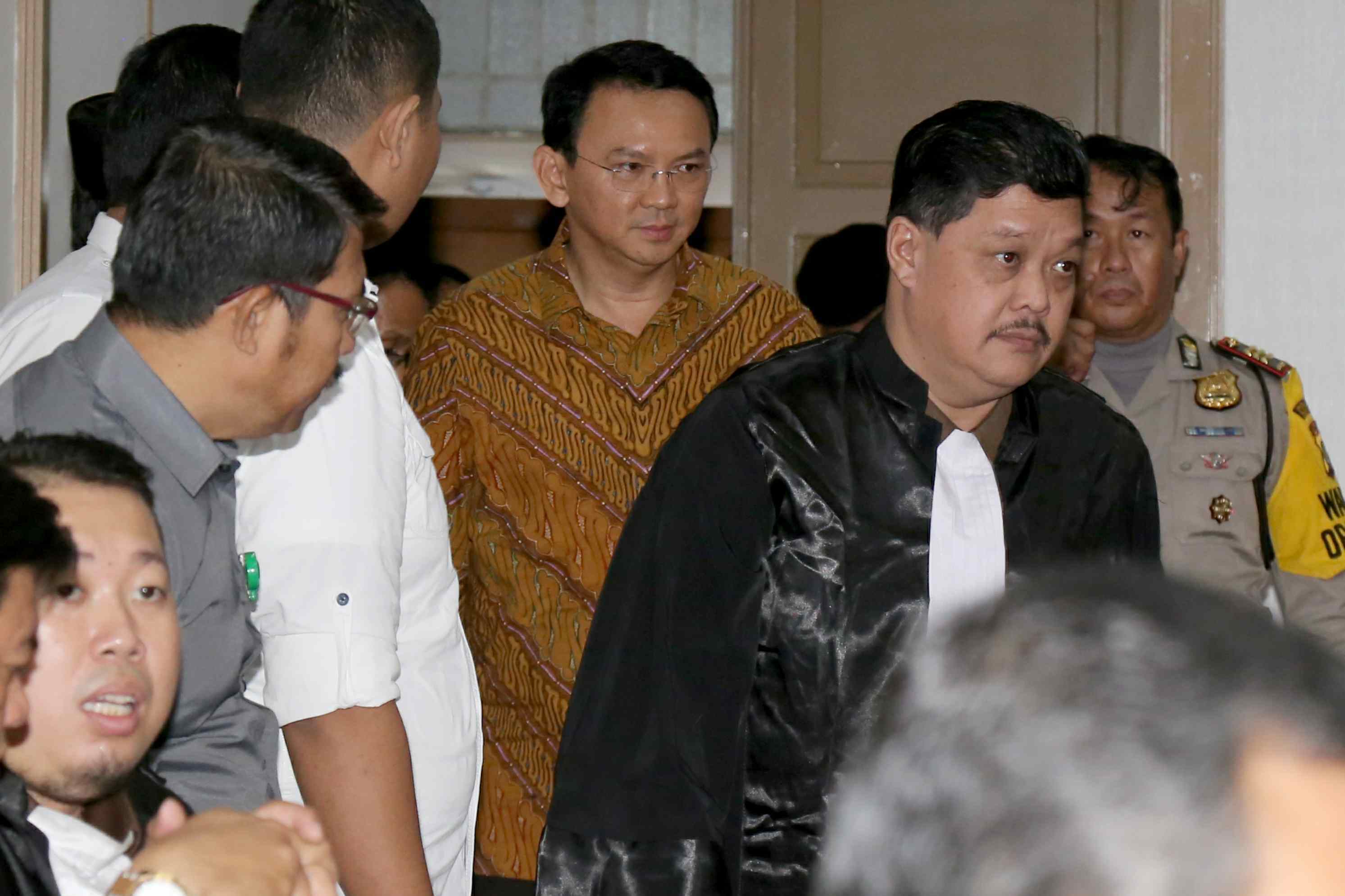 Gubernur DKI Jakarta nonaktif Basuki Tjahaja Purnama alias Ahok memasuki ruang sidang untuk menjalani sidang lanjutan kasus dugaan penistaan agama di Auditorium Kementerian Pertanian, Jakarta, Selasa (24/1). Sidang ketujuh tersebut masih mengagendakan mendengarkan keterangan lima saksi dari pihak Jaksa Penuntut Umum. ANTARA FOTO/Pool/Muhammad Adimaja/17
