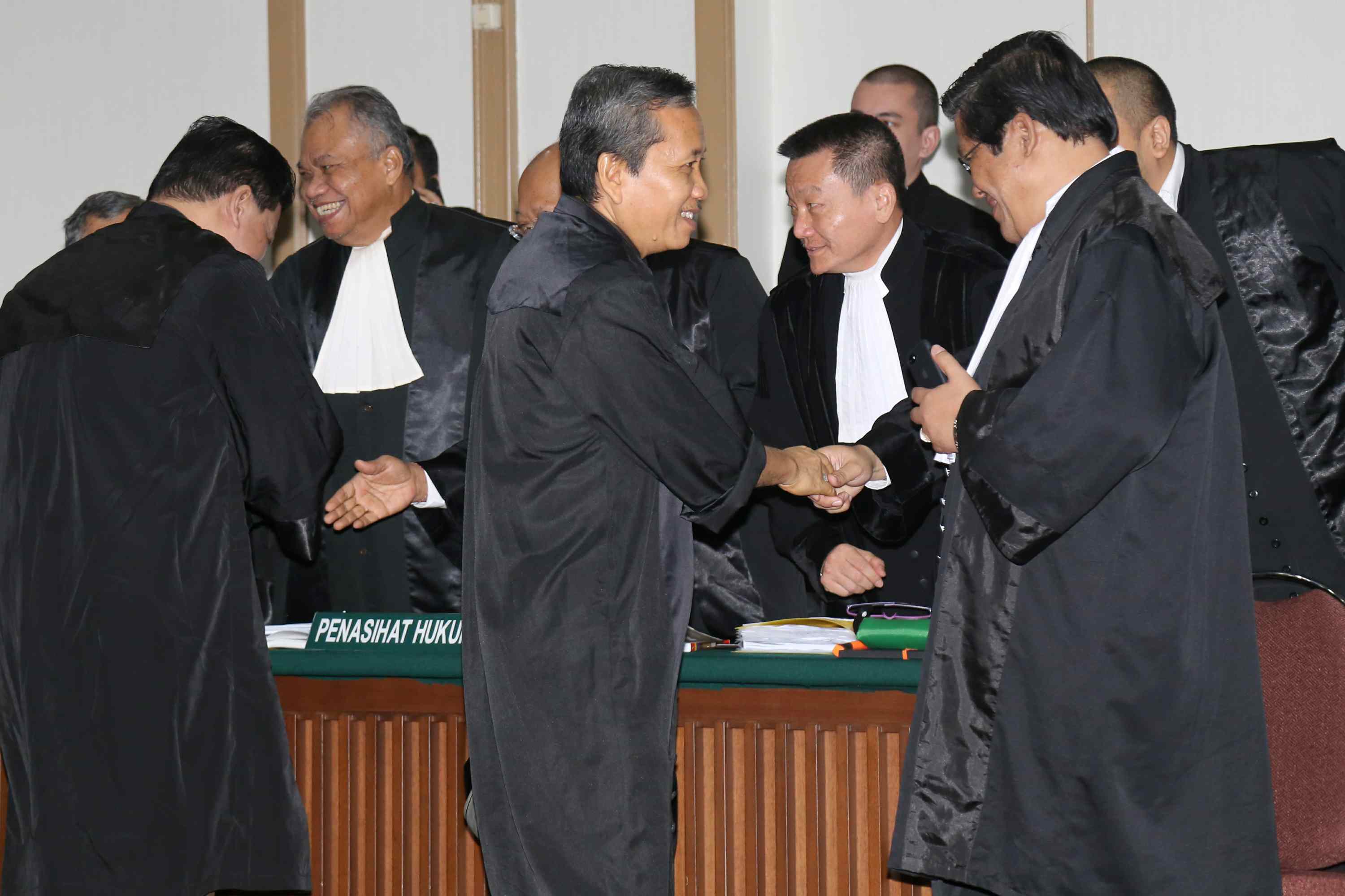 Tim Jaksa Penuntut Umum bersalaman dengan tim kuasa hukum terdakwa penistaan agama Basuki Tjahaja Purnama (Ahok) saat sidang lanjutan dugaan penistaan agama di Auditorium Kementerian Pertanian, Jakarta Selatan, Selasa (24/1). Pengadilan Negeri Jakarta Utara menggelar sidang kasus penistaan agama oleh Ahok dengan agenda mendengarkan lima keterangan saksi dari pihak Jaksa Penuntut Umum. Foto/aktual.com-Pool/Tino Oktaviano