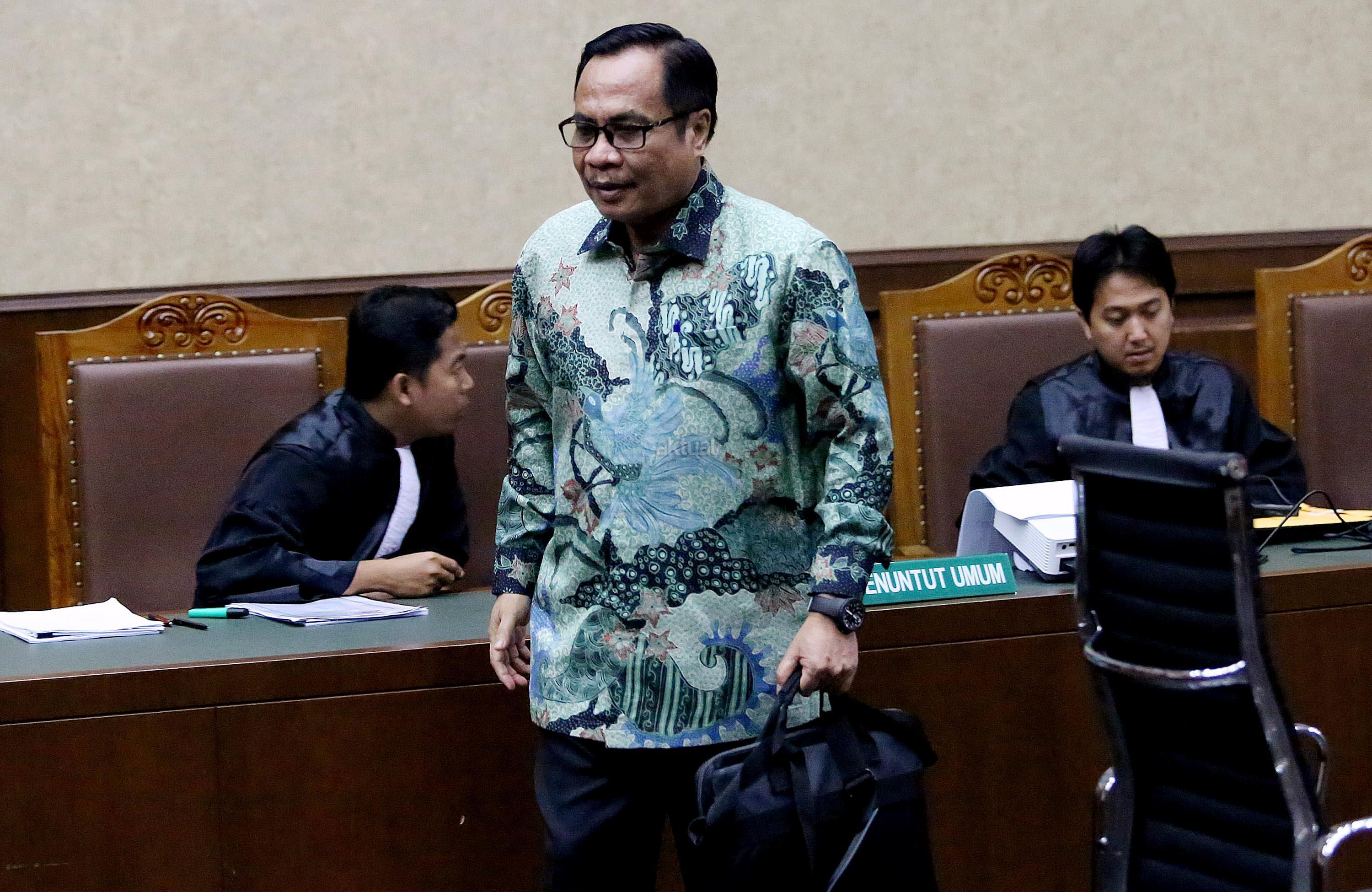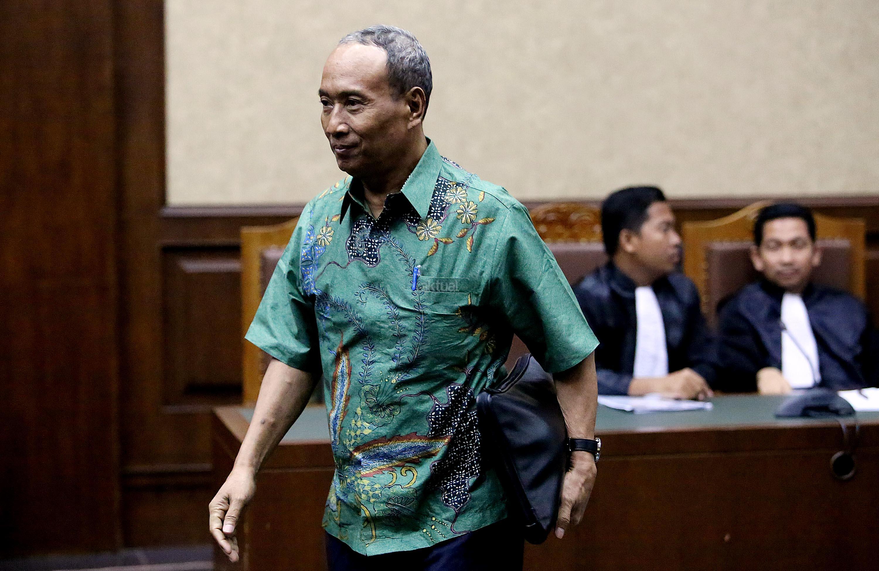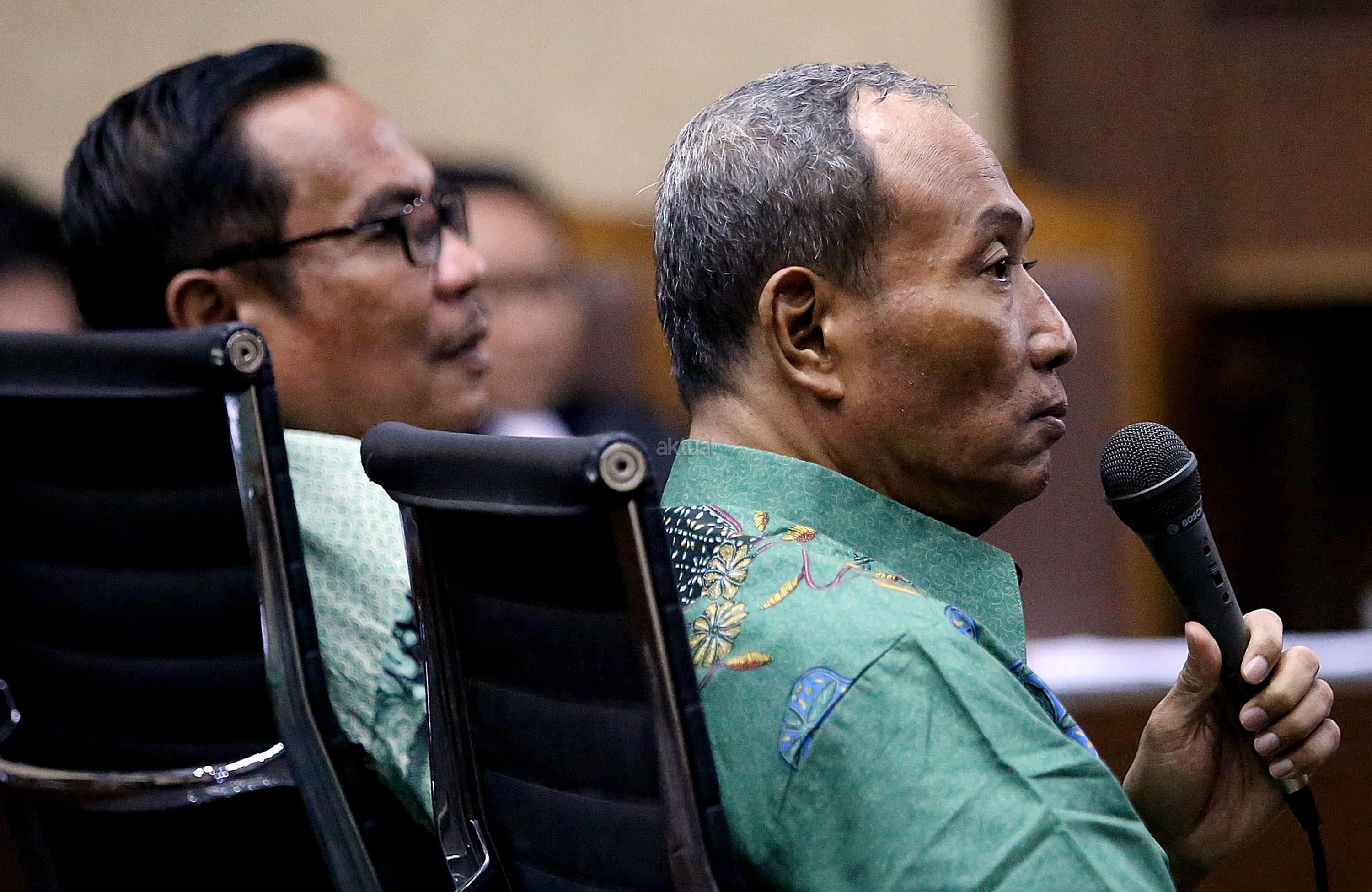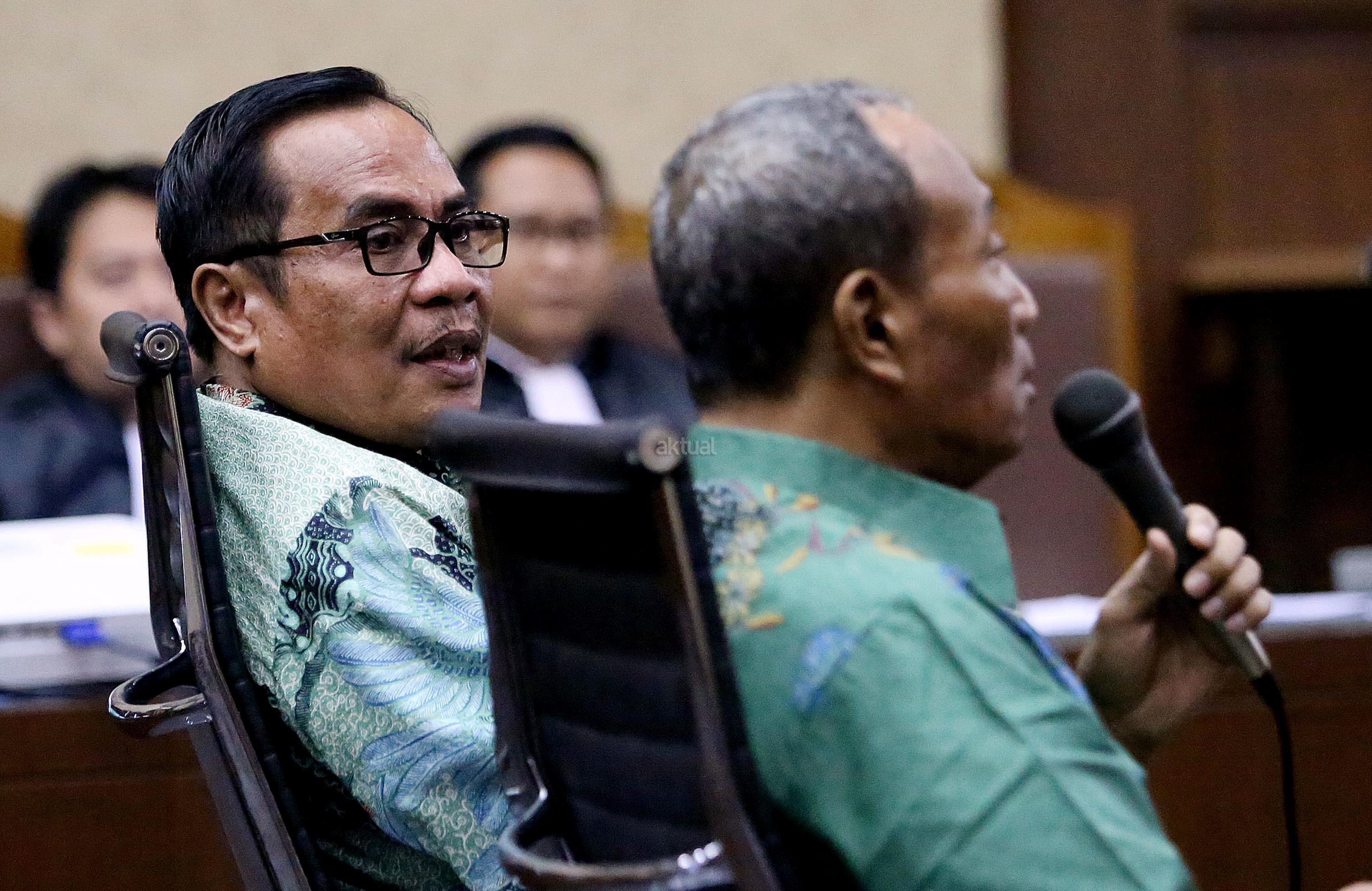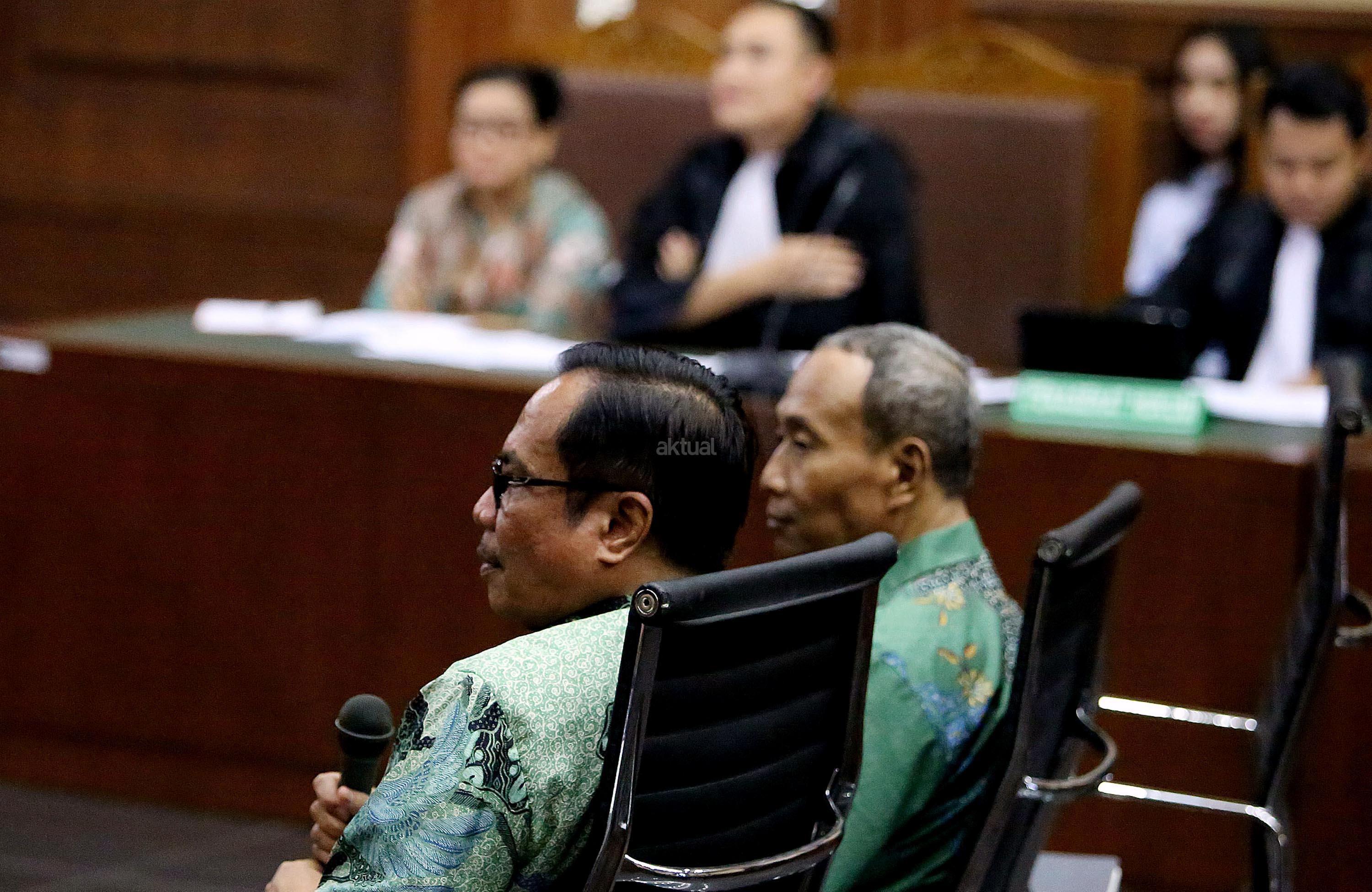 Mantan Direktur Pengelola Informasi Administrasi Kependudukan Kemendagri Sugiharto (kanan) dan mantan Dirjen Kependudukan dan Catatan Sipil (Dukcapil) Kemendagri Irman (kiri) bersaksi dalam sidang lanjutan kasus dugaan pemberian keterangan palsu dalam sidang kasus KTP Elektronik dengan terdakwa Miryam S Haryani di Pengadilan Tipikor, Jakarta, Senin (28/8/2017). Sidang tersebut beragendakan pemeriksaan saksi. AKTUAL/Munzir