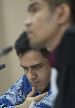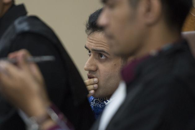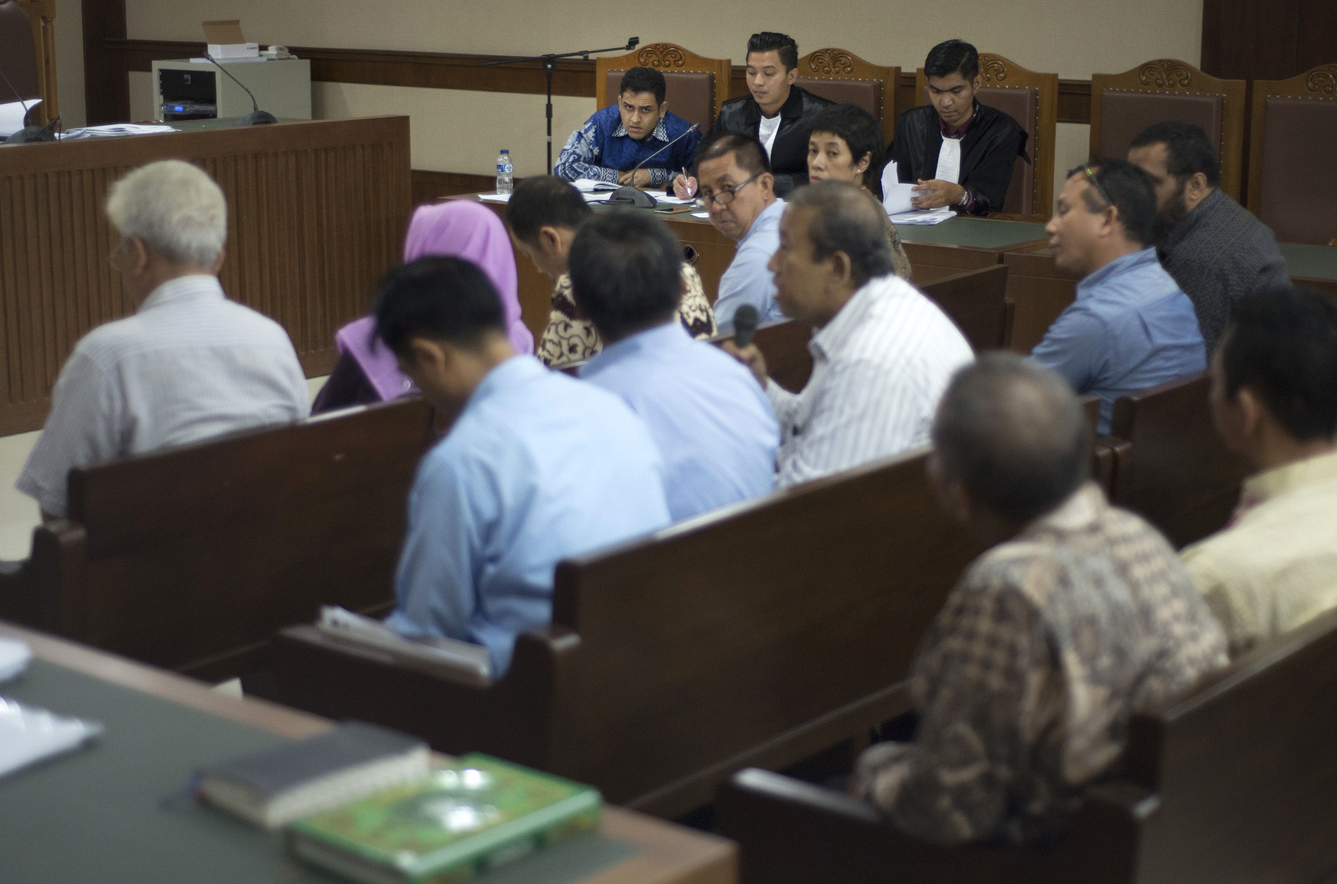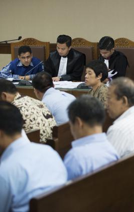 Mantan Bendahara Umum Partai Demokrat M Nazaruddin (kiri belakang) mendengarkan keterangan saksi dalam sidang perkara dugaan tindak pidana pencucian Uang (TPPU) APBN 2010 di Pengadilan Tipikor, Jakarta, Rabu (16/3). Dalam sidang tersebut, jaksa menghadirkan 21 saksi yaitu pihak-pihak yang diketahui menjual aset berupa tanah dan bangunan kepada Nazaruddin serta beberapa pejabat pembuat akta tanah. ANTARA FOTO/Rosa Panggabean/foc/16.