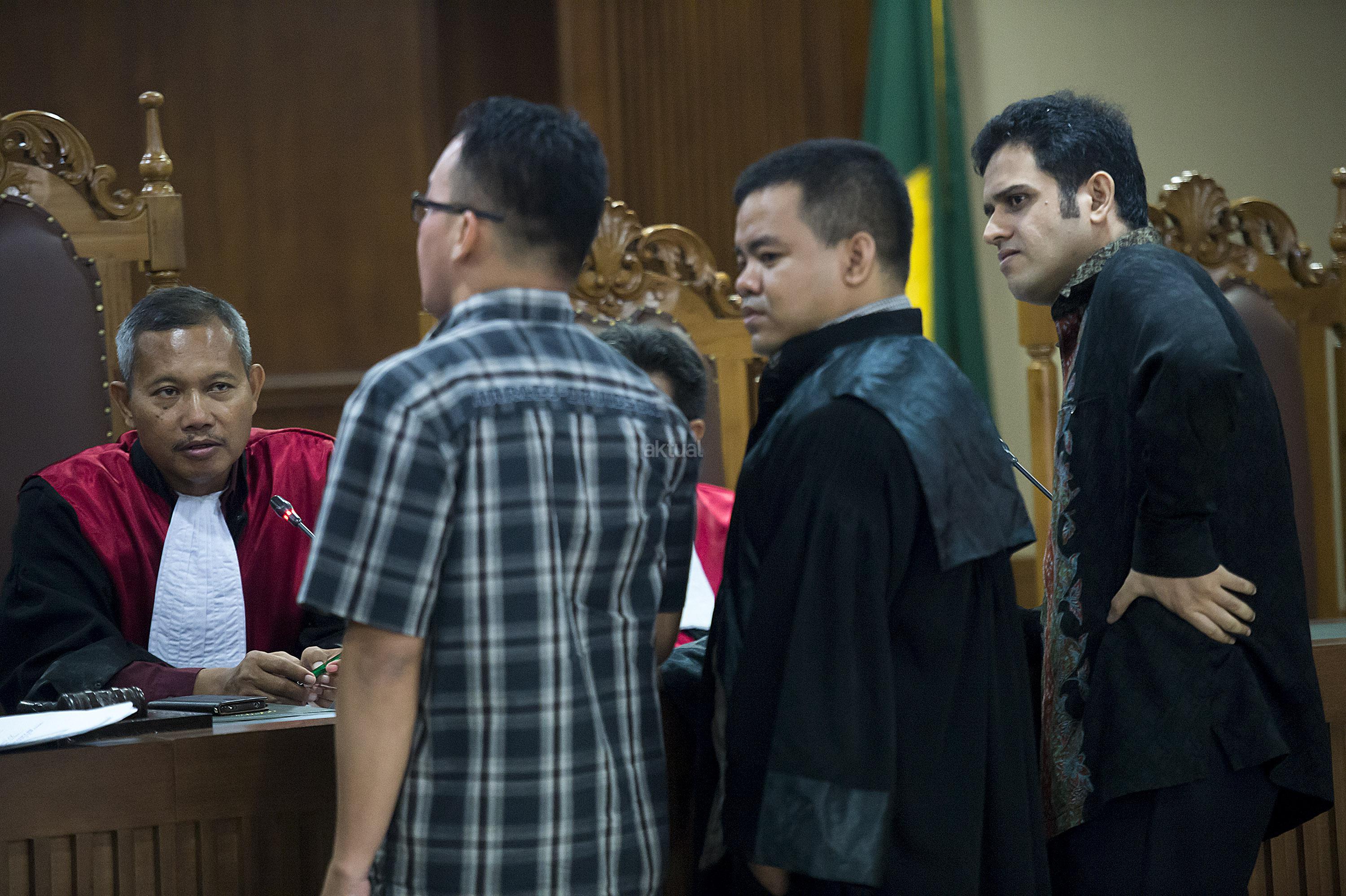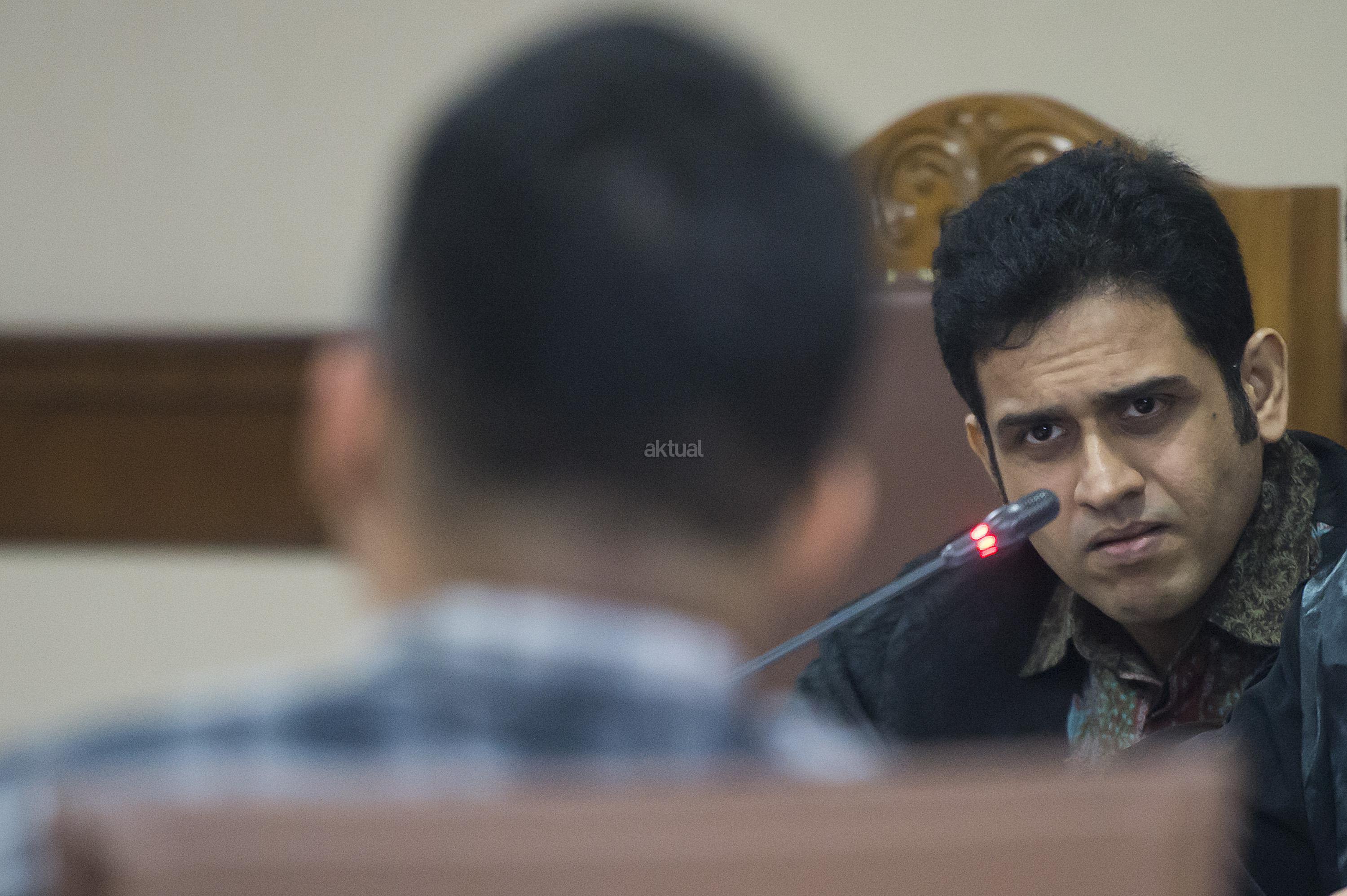 Terdakwa kasus dugaan tindak pidana pencucian uang (TPPU) Muhammad Nazaruddin (kanan) menyimak keterangan yang diberikan saksi dalam sidang lanjutan di Pengadilan Tipikor, Jakarta, Rabu (20/4). Jaksa Penuntut Umum menghadirkan dua orang saksi untuk dimintai keterangannya terkait perkara tersebut. ANTARA FOTO/Widodo S. Jusuf/Spt/16.