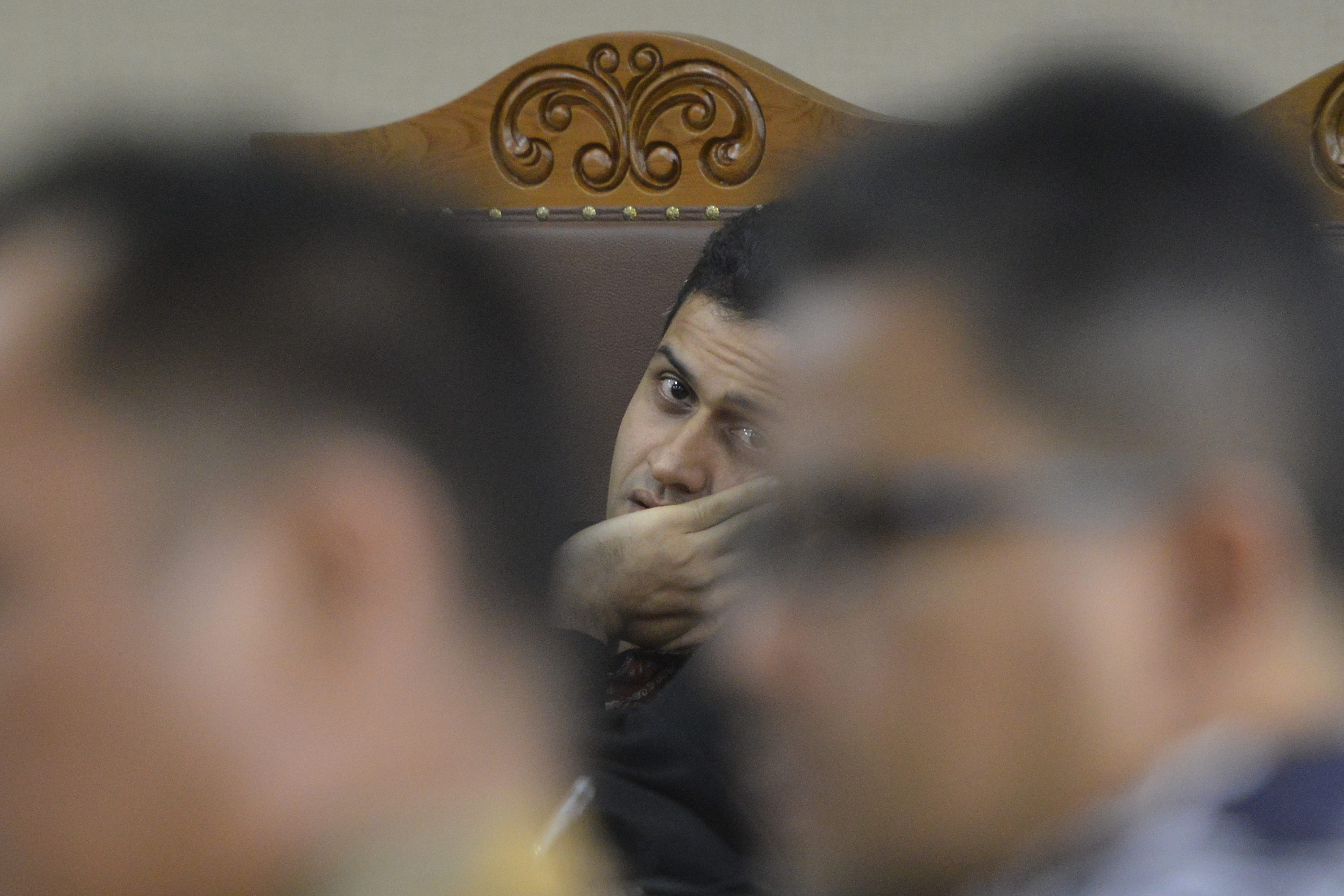 Mantan Bendahara Umum Partai Demokrat Muhammad Nazaruddin mendengarkan keterangan saksi dalam sidang lanjutan di Pengadilan Tipikor, Jakarta, Rabu (27/1). Sidang untuk perkara dugaan pencucian uang pembelian saham Garuda itu menghadirkan sejumlah saksi dari pihak sekuritas. ANTARA FOTO/Rosa Panggabean/ama/16.