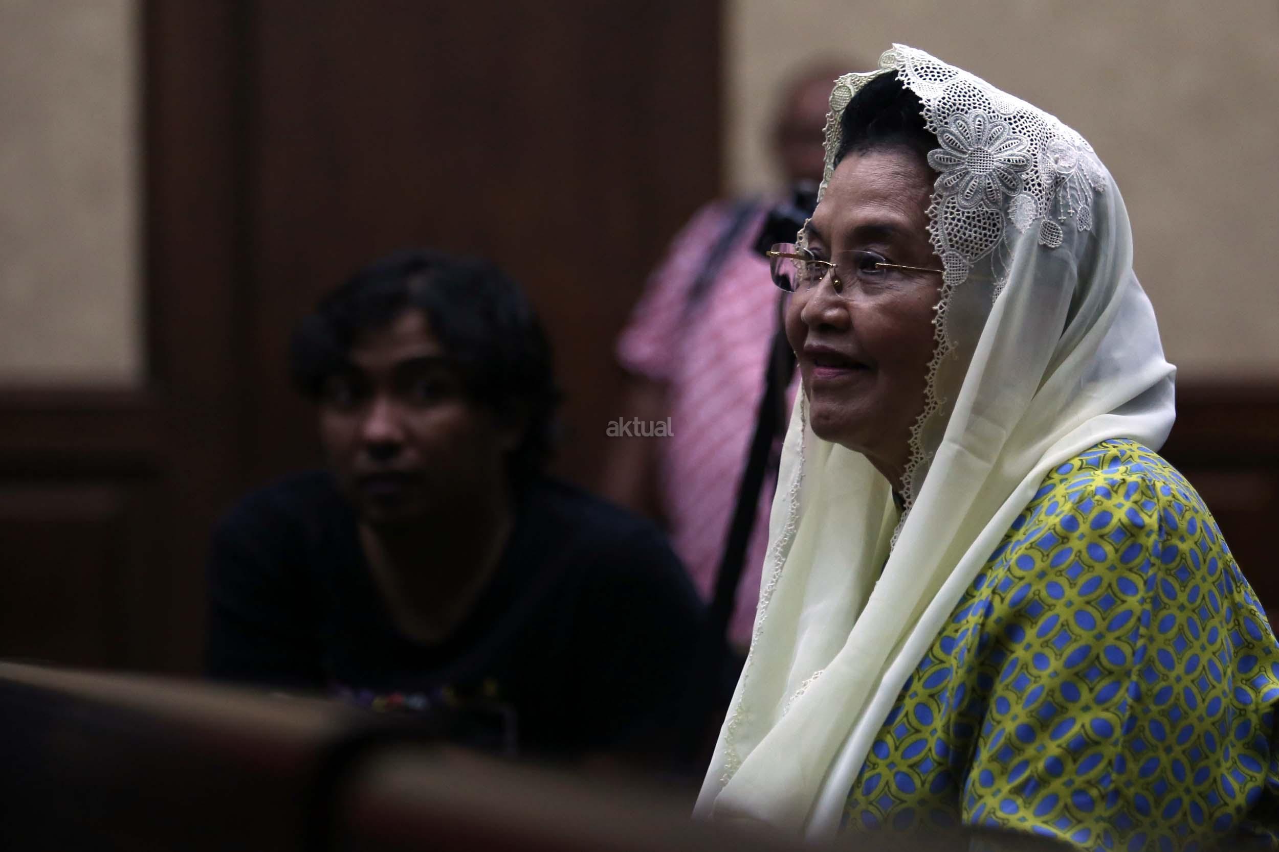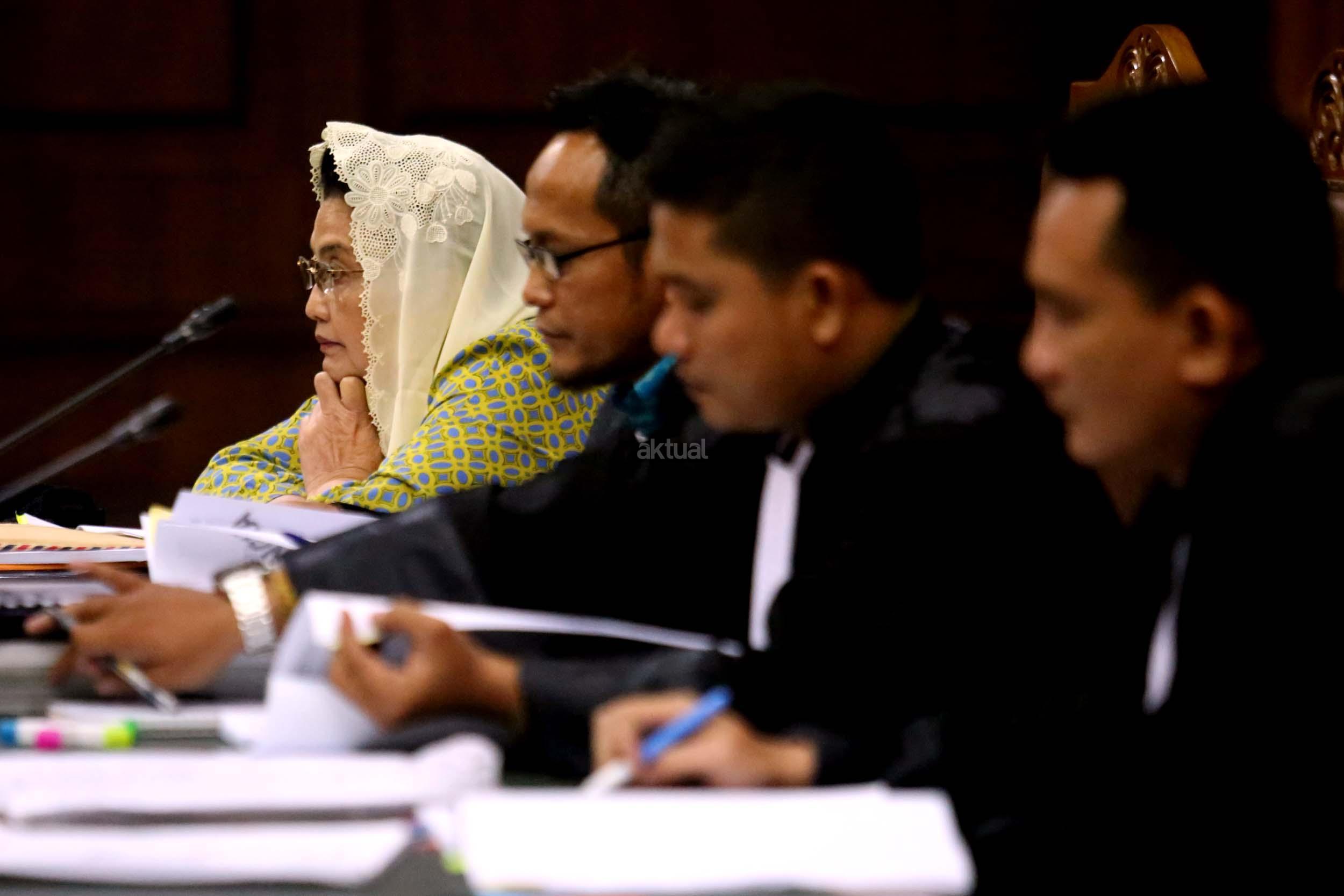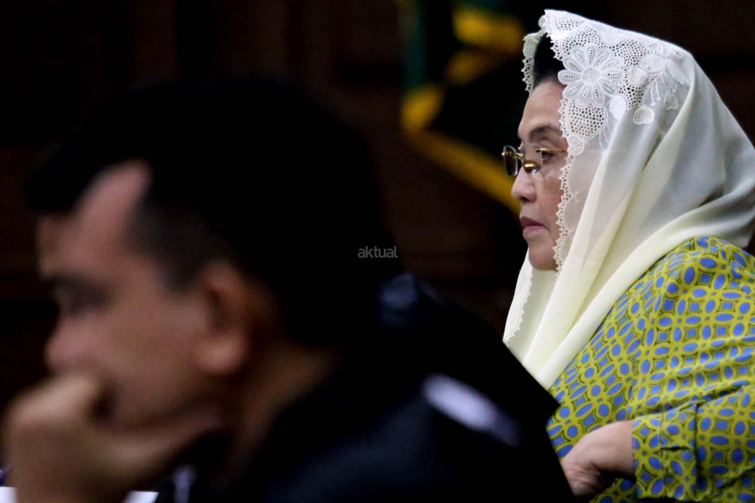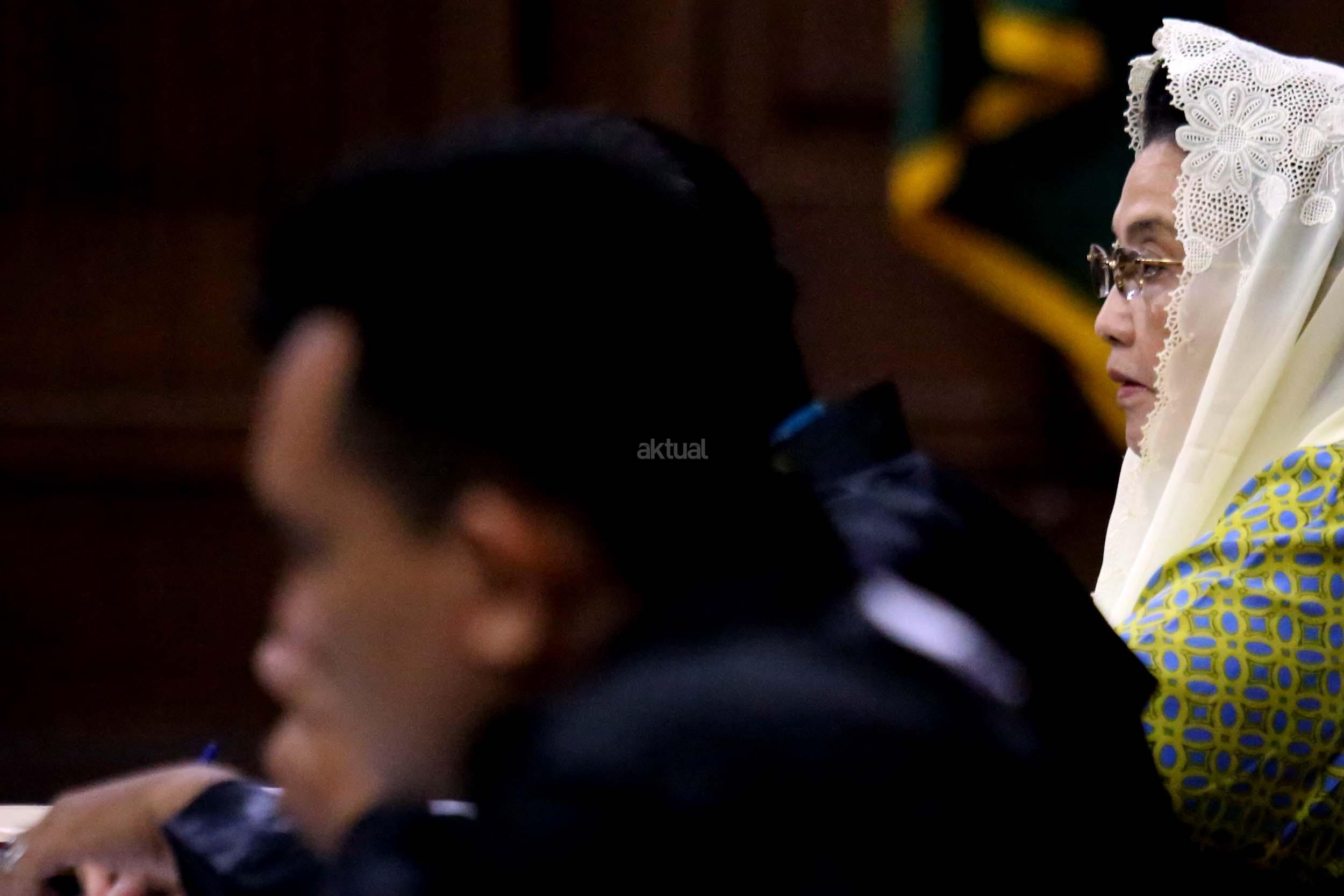 Terdakwa kasus dugaan korupsi pengadaan alat kesehatan (alkes) tahun 2005 Siti Fadilah Supari (kanan) mendengarkan keterangan saksi dalam sidang lanjutan di Pengadilan Tipikor, Jakarta, Rabu (15/3/2017). Jaksa penuntut umum menghadirkan empat saksi dari internal Kementerian Kesehatan untuk dikonfrontir soal pengadaan alat kesehatan dari anggaran Daftar Isian Pelaksanaan Anggaran (DIPA) tahun 2005-2007. AKTUAL/Munzir