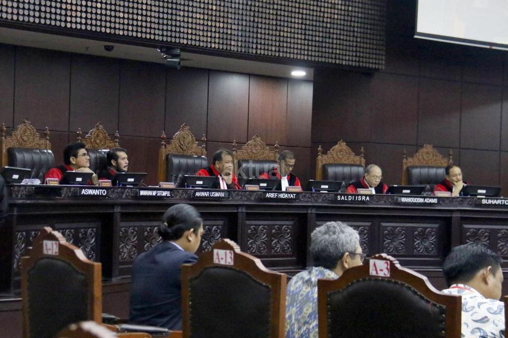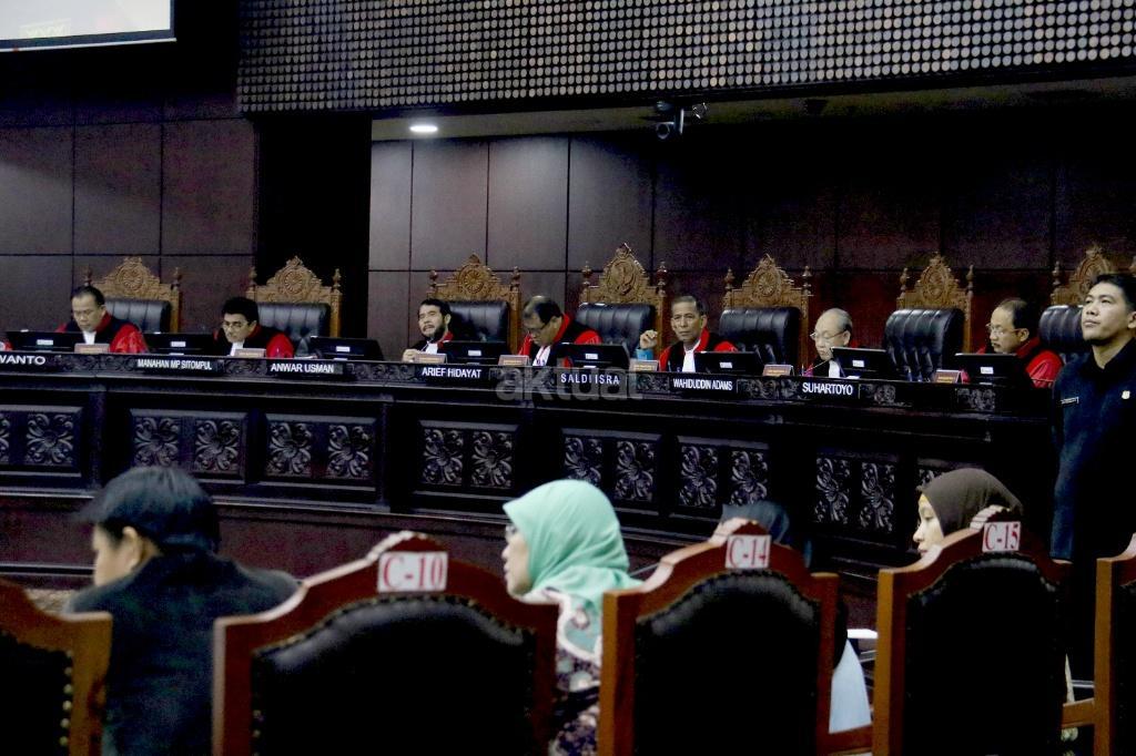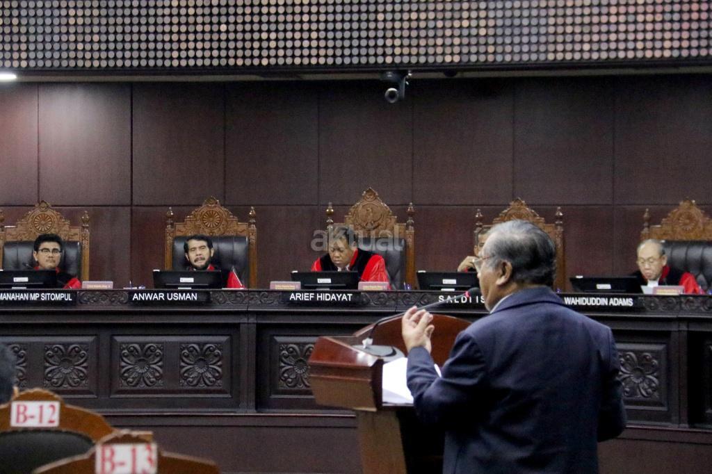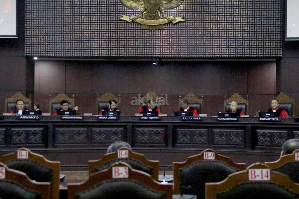 Majelis hakim Mahkamah Konstitusi saat mendengarkan paparan saksi ahli dari pemerintah Maruarar Siahaan saat sidang lanjutan uji materi Pasal 79 UU MD3 di Mahkamah Konstitusi, Jakarta, Rabu (25/10/2017). Sidang lanjutan ini beragenda mendengarkan saksi ahli,Uji materi ini berkaitan dengan pembentukan pansus hak angket KPK dan beberapa ahli dihadirkan di antaranya Pakar Hukum Acara Pidana Arif Setiawan dan Pakar Hukum Tata Negara Refly Harun sebagai ahli dari KPK, Mantan Hakim Mahkamah Konstitusi Maruarar Siahaan sebagai saksi ahli dari Pemerintah. AKTUAL/Munzir