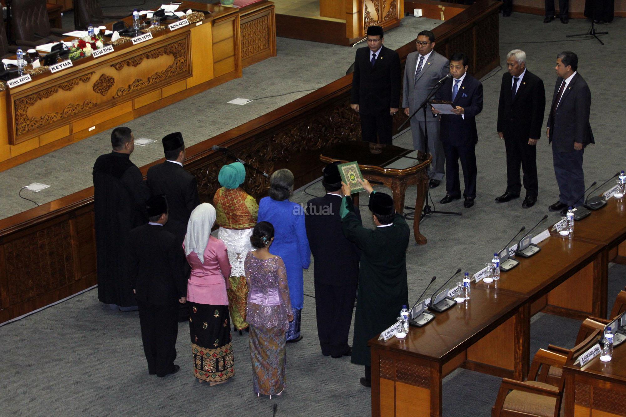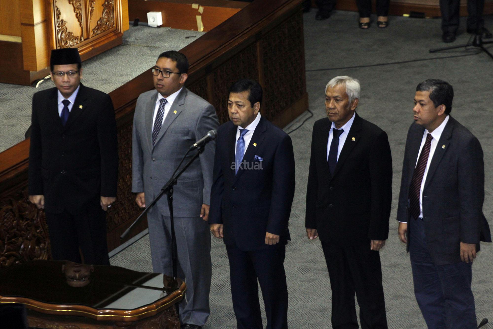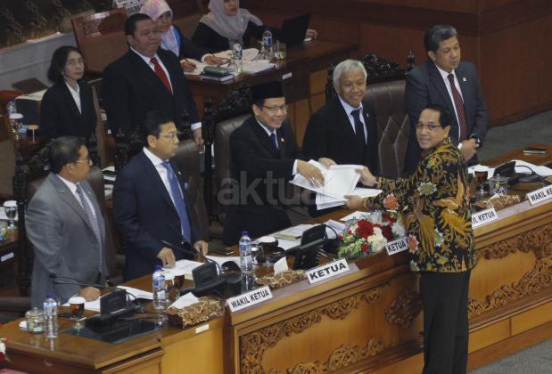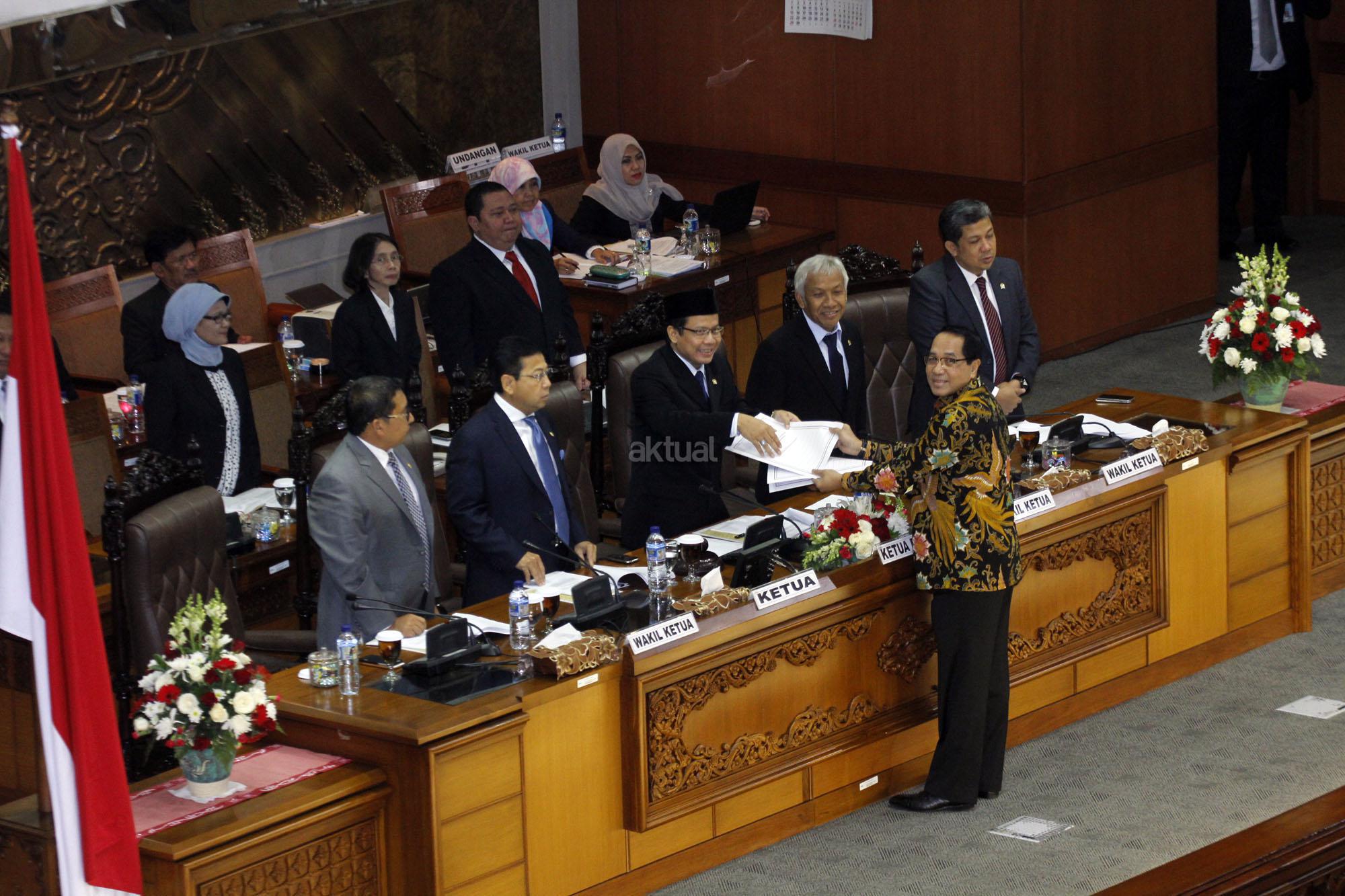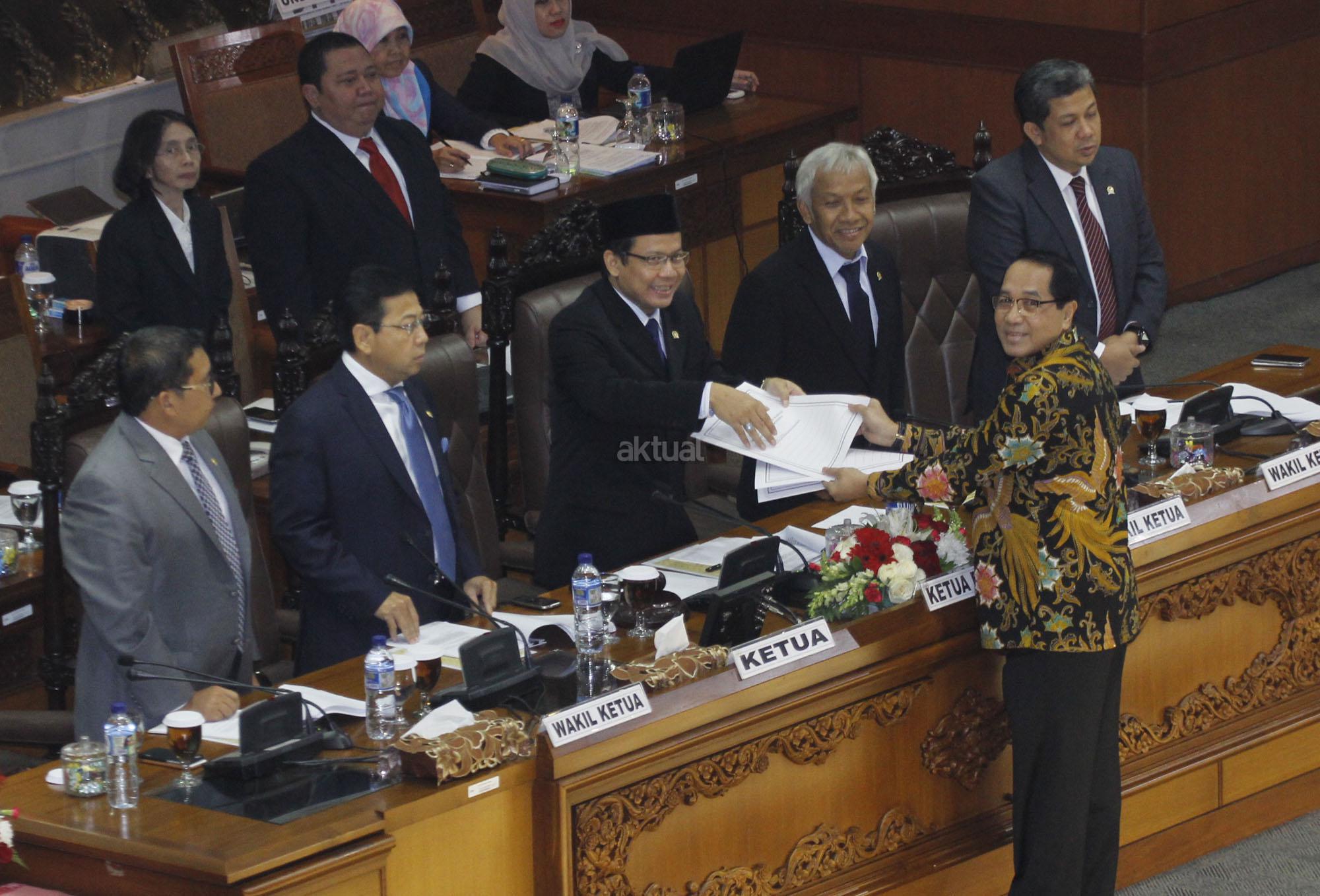 Wakil Ketua Badan Legislasi (Baleg) DPR Firman Subagyo menyerahkan Draf RUU Prioritas Prolegnas 2015 kepada Pimpinan Sidang Taufik Kurniawan bersama Ketua DPR Setya Novanto, Fadli Zon, Fahri Hamzah dan Agus Hermanto saat Sidang Paripurna Ke-13 Masa Persidangan I tahun Sidang 2015-2016 di Kompleks Parlemen, Senayan, Jakarta, Selasa (15/12/2015). Paripurna membahas RUU Pengampunan Pajak dan RUU Tentang perubahan atas Undang-Undang No.30 Tahun 2002 Tentang KPK untuk dilanjutkan Menjadi RUU Prioritas Prolegnas 2015.