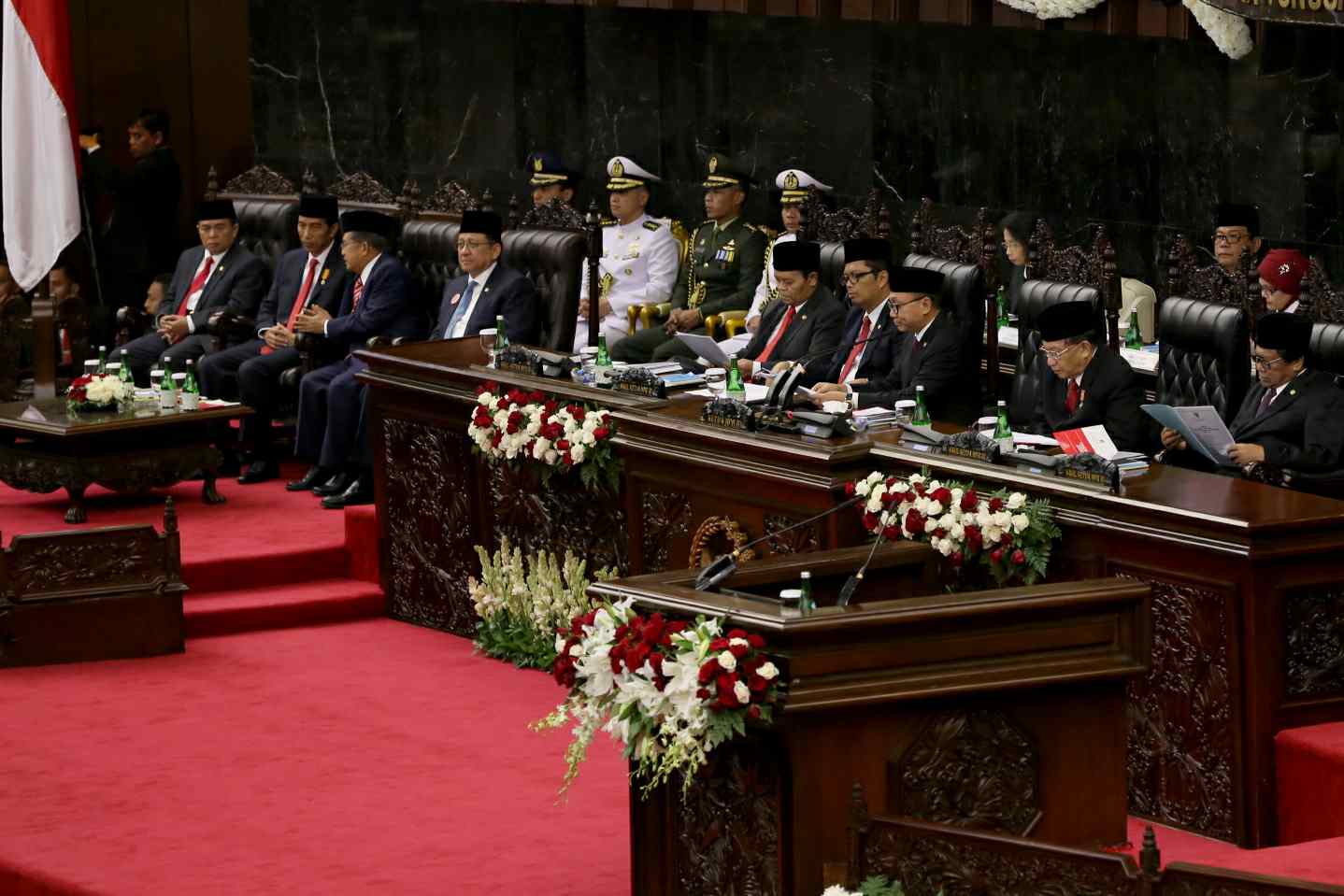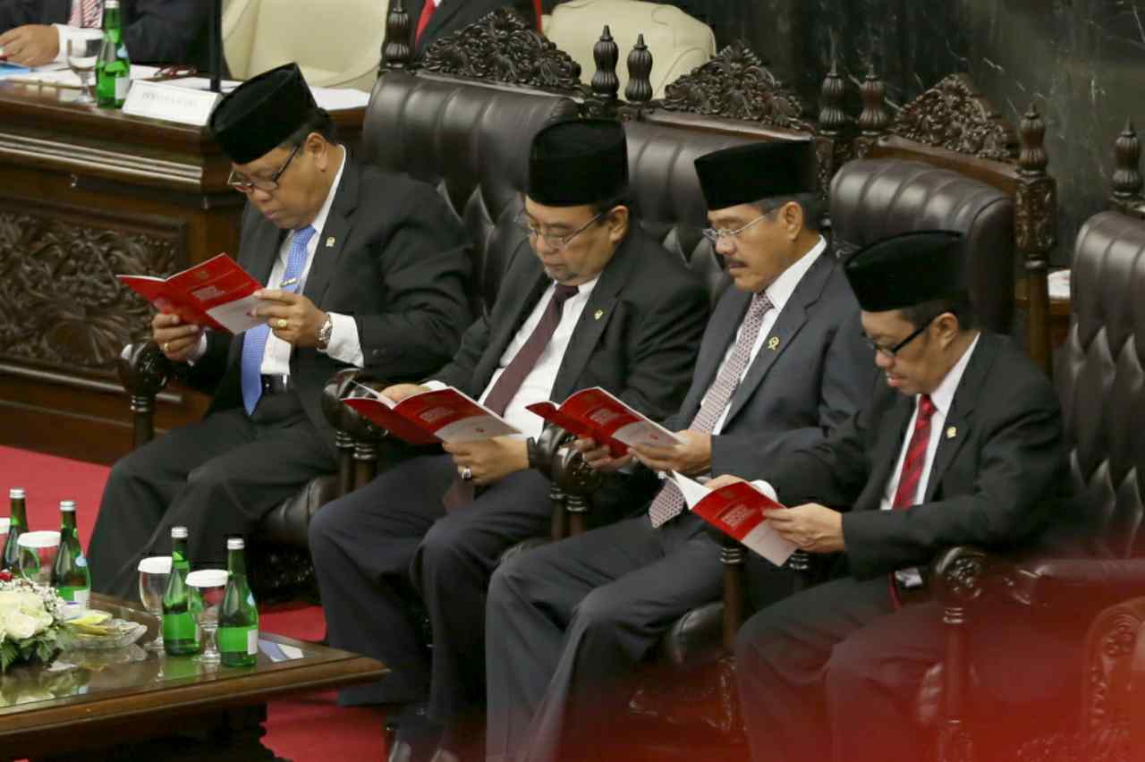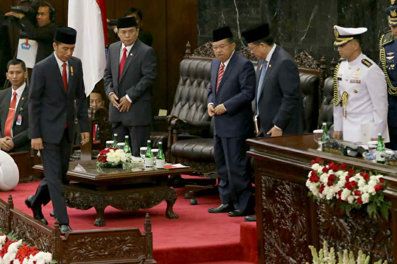 Presiden Joko Widodo saat akan menyampaikan pidato kenegaraan didampingi Wapres Jusuf Kalla, Ketua DPR Ade Komarudin dan Ketua DPD Irman Gusman saat sidang umum MPR di Gedung Parlemen, Jakarta, Selasa (16/8). Pembukaan Sidang Paripurna dalam rangka Sidang Tahunan MPR Tahun 2016 oleh Ketua MPR Zulkifli Hassan. Ketua MPR akan menyampaikan pengantar, dan kemudian memperilakan Presiden membacakan pidato. AKTUAL/TINO OKTAVIANO