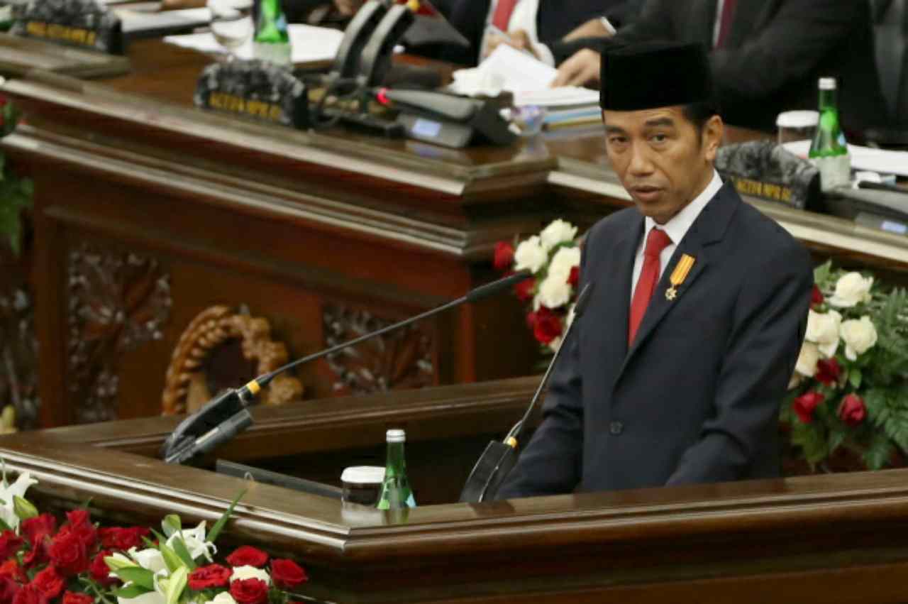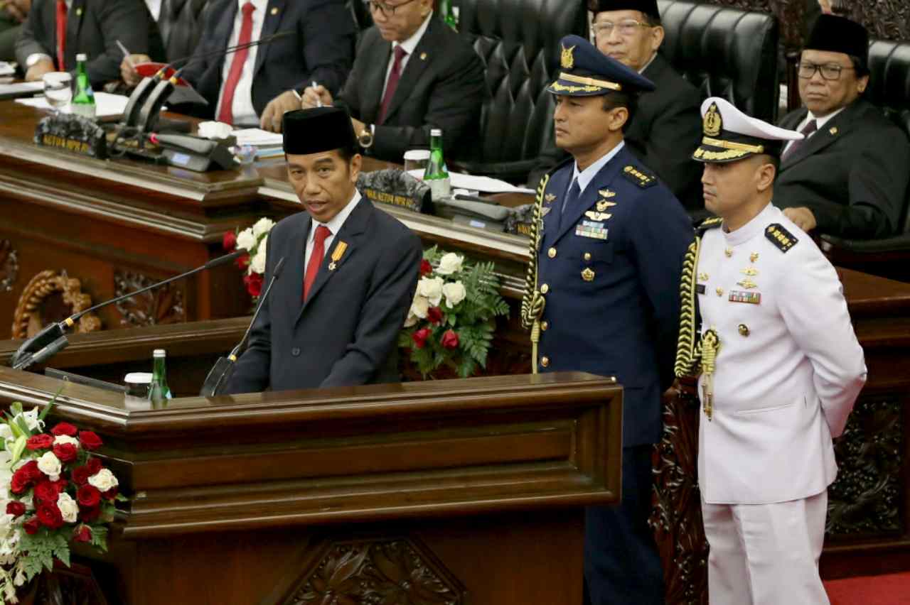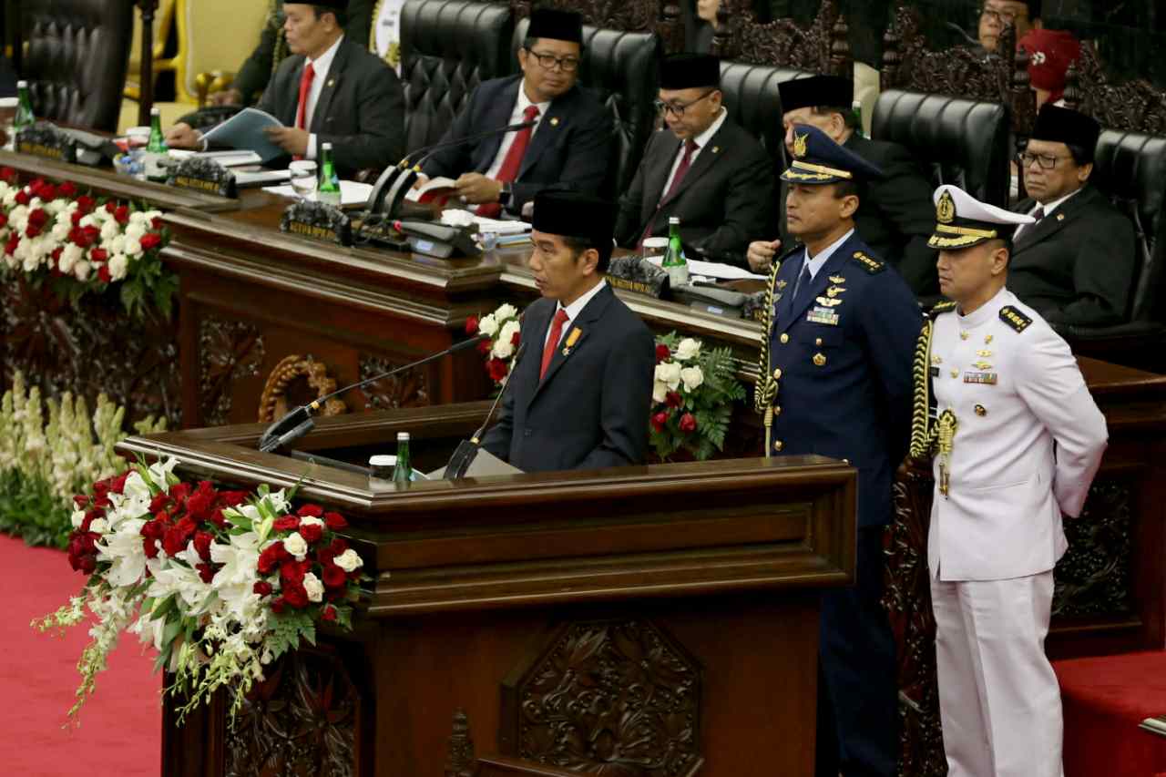 Presiden Joko Widodo, menyampaikan pidato kenegaraan saat sidang umum MPR di Gedung Parlemen, Jakarta, Selasa (16/8). Pembukaan Sidang Paripurna dalam rangka Sidang Tahunan MPR Tahun 2016 oleh Ketua MPR Zulkifli Hassan. Ketua MPR akan menyampaikan pengantar, dan kemudian memperilakan Presiden membacakan pidato. AKTUAL/TINO OKTAVIANO