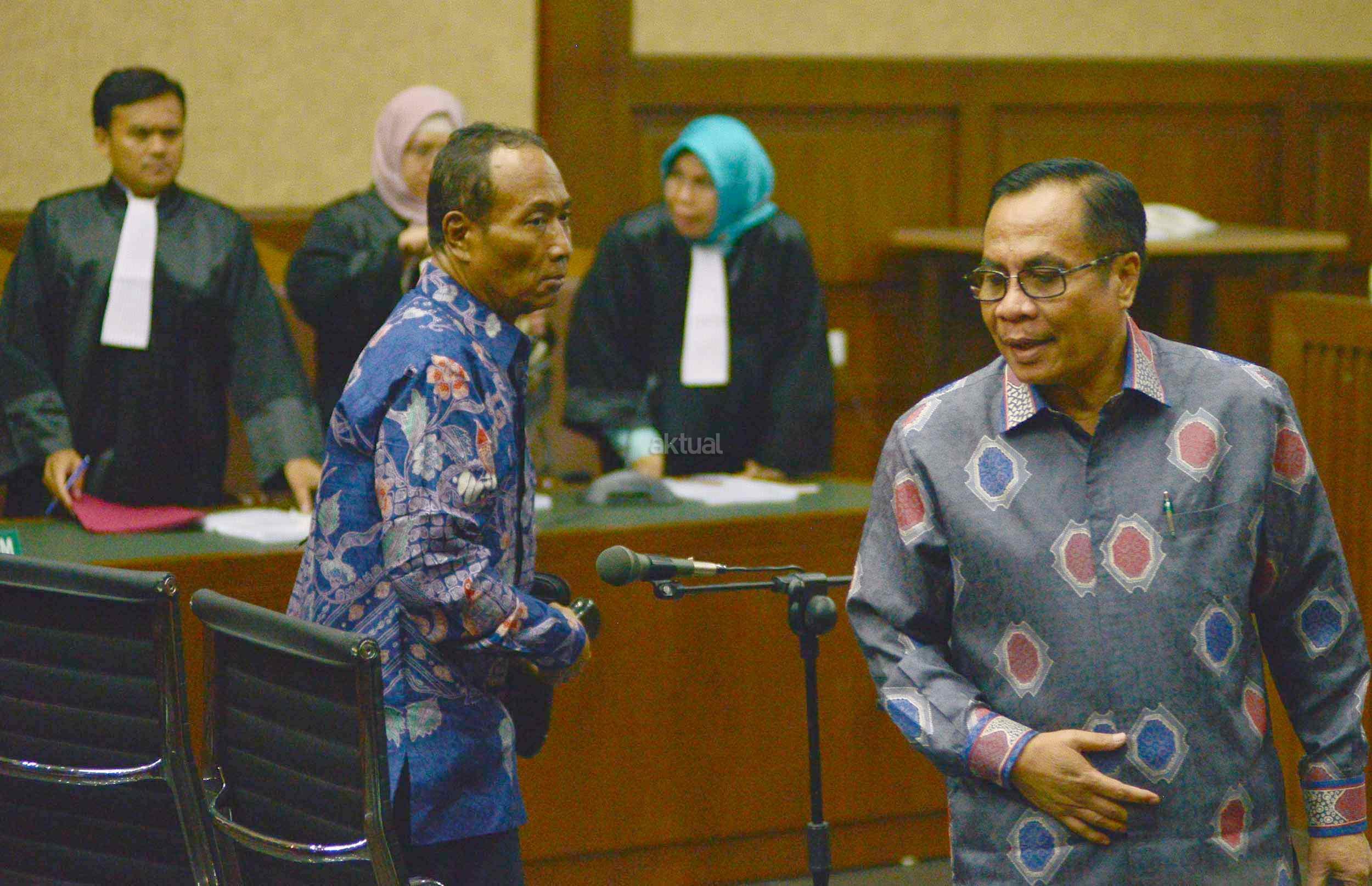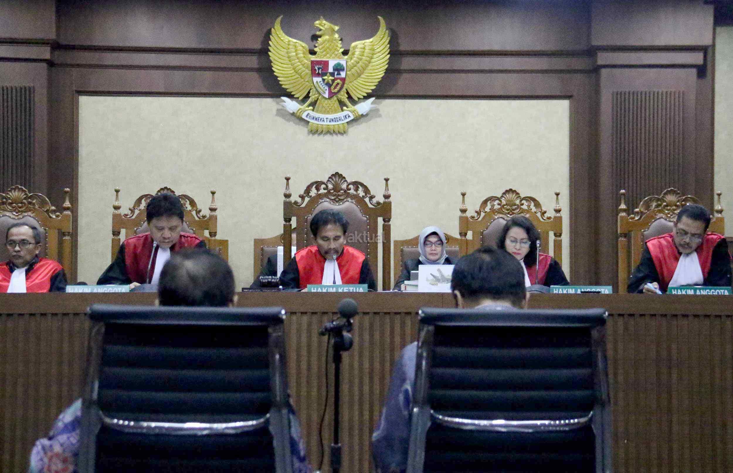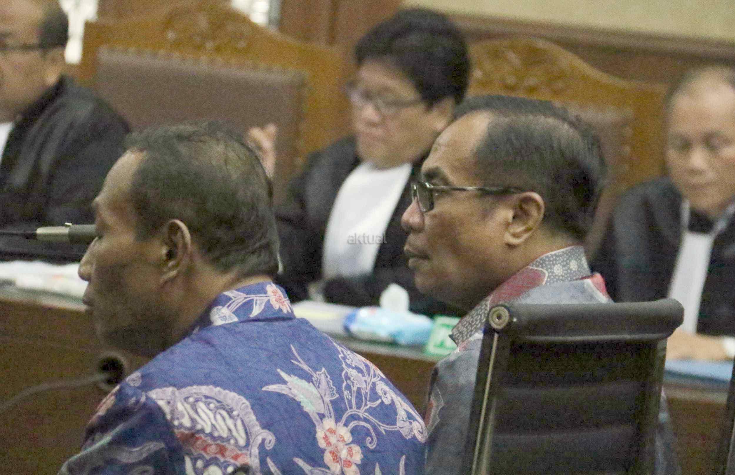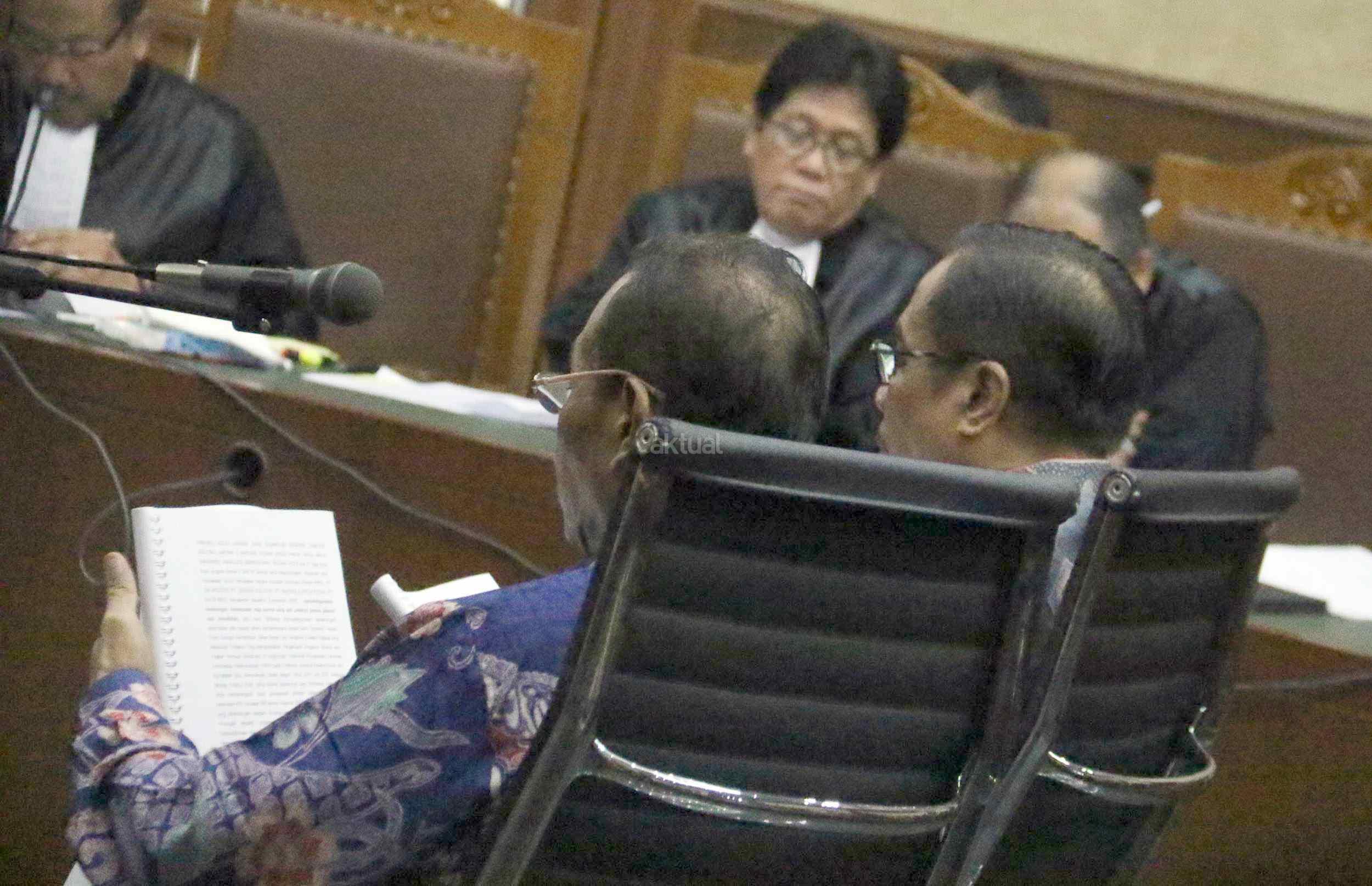 Dua terdakwa kasus dugaan korupsi pengadaan proyek e-KTP, Mantan Dirjen Kependudukan dan Pencatatan Sipil Kemendagri Irman dan Mantan Direktur Pengelolaan Informasi Administrasi Kependudukan dan Pencatatan Sipil Kemendagri Sugiharto, saat menjalani sidang perdana di Pengadilan Tipikor, Jakarta, Kamis (9/3/2017). Dalam pengusutan kasus ini, penyidik telah menyita sejumlah barang bukti di antaranya uang sebesar Rp247 miliar yang didapat dari perorangan maupun korporasi. Sehingga diduga korupsi e-KTP mengakibatkan kerugian hingga Rp2,3 triliun dari total anggaran Rp5,9 triliun.