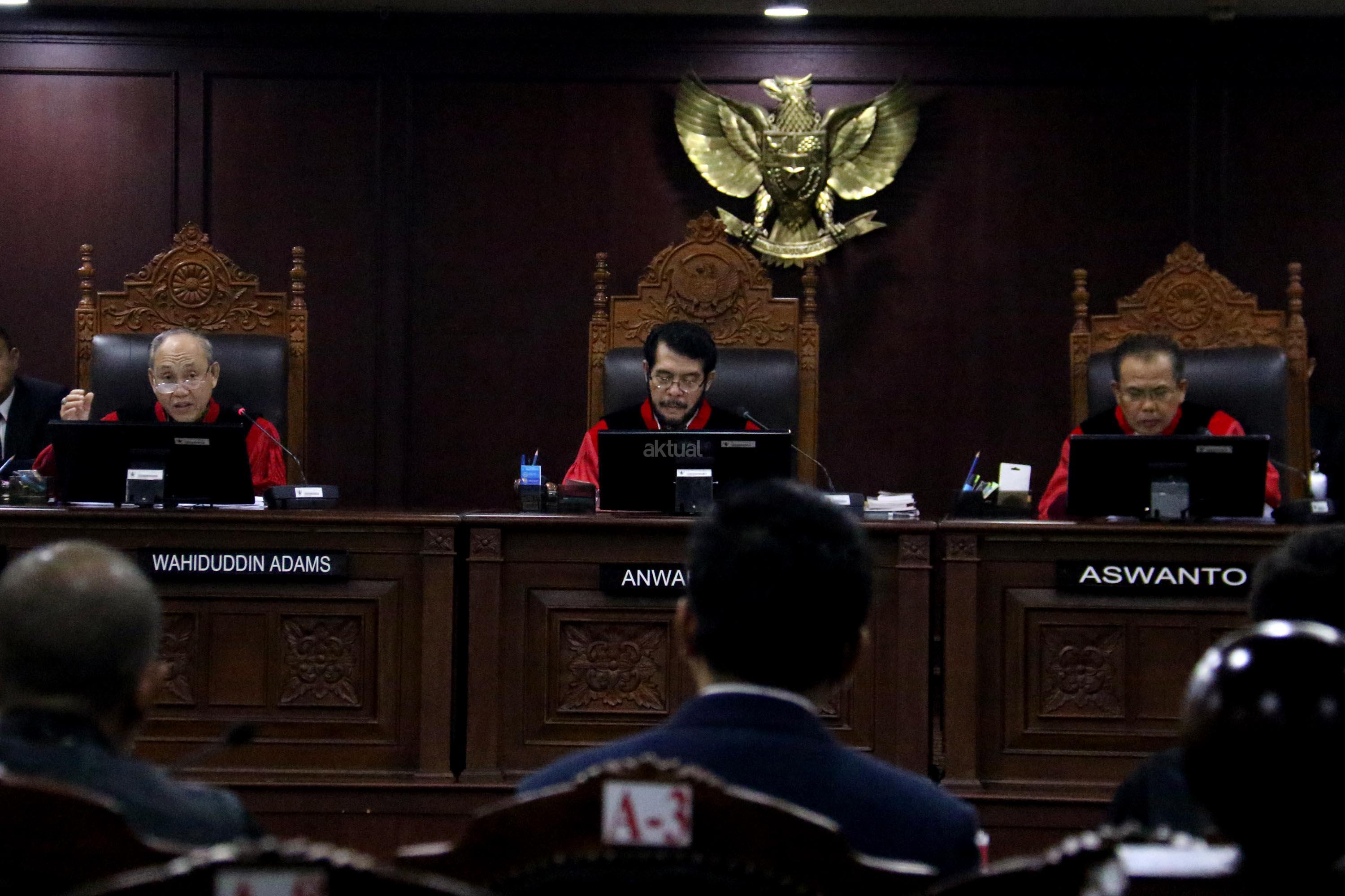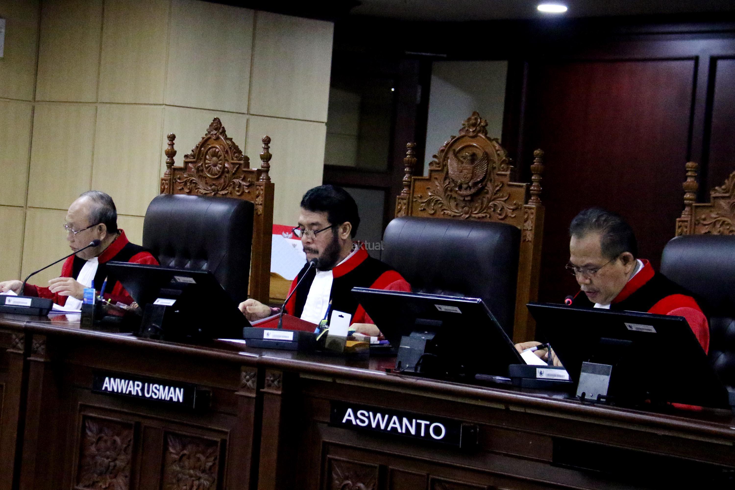 Hakim Ketua MK Anwar Usman (tengah) didampingi Hakim Anggota MK Wahiduddin Adams dan Hakim Anggota MK Aswanto saat menggelar sidang perdana uji materi Pengelolaan Keuangan Haji di pengadilan Mahkamah Konstitusi (MK), Jakarta, Rabu (23/8/2017). Dalam sidang perdana uji materi Pengelolaan Keuangan Haji oleh pemohon Muhammad Soleh merasa telah terjadi pelanggaran hak konstitusional yaitu telah berlaku sewenang-wenang karena memberi mandat kepada Badan Pengelola Keuangan Haji (BPKH) menggunakan dana setoran awal Biaya Penyelenggaraan Ibadah Haji (BPIH) milik Pemohon untuk berinvestasi, padahal pemohon tidak pernah memberikan mandat kepada pembuat UU terkait diperbolehkannya investasi. AKTUAL/Munzir